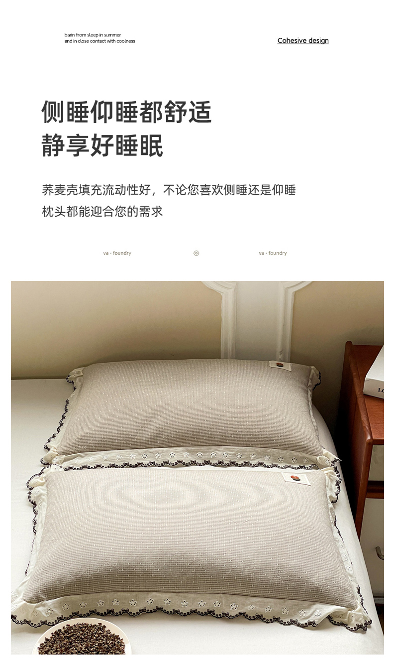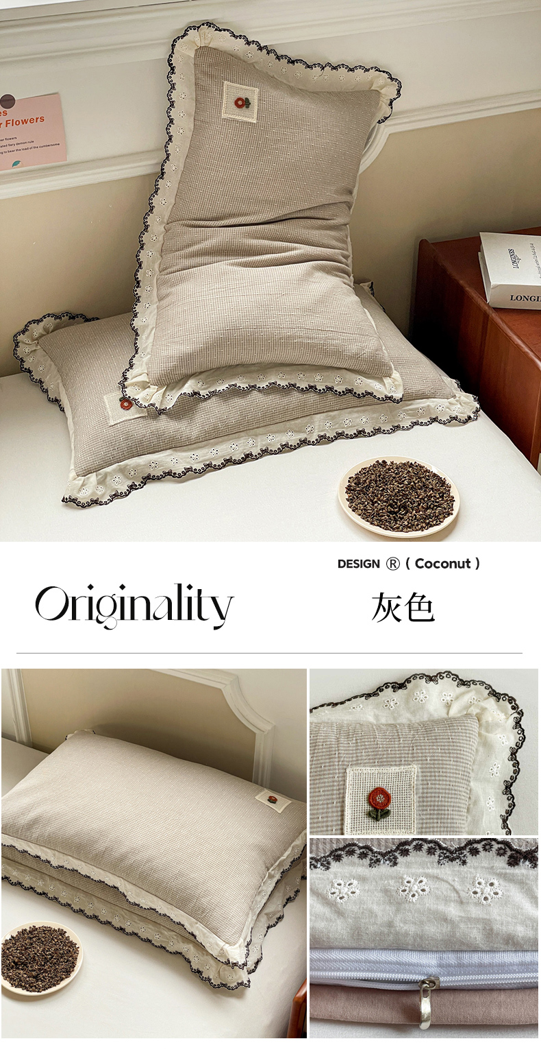 商品名称:梦叶草 2026新款全棉马卡龙蕾丝荞麦枕法式风枕枕头枕芯 马卡龙蕾丝荞麦枕-灰色