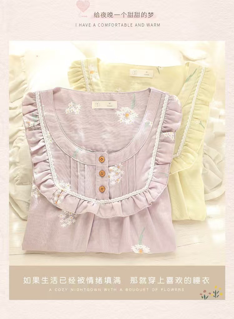 (总)洛兰沙家居馆 2026春夏新品睡裙女菲边棉纱甜美公主风长袖薄款可外穿家居服睡裙