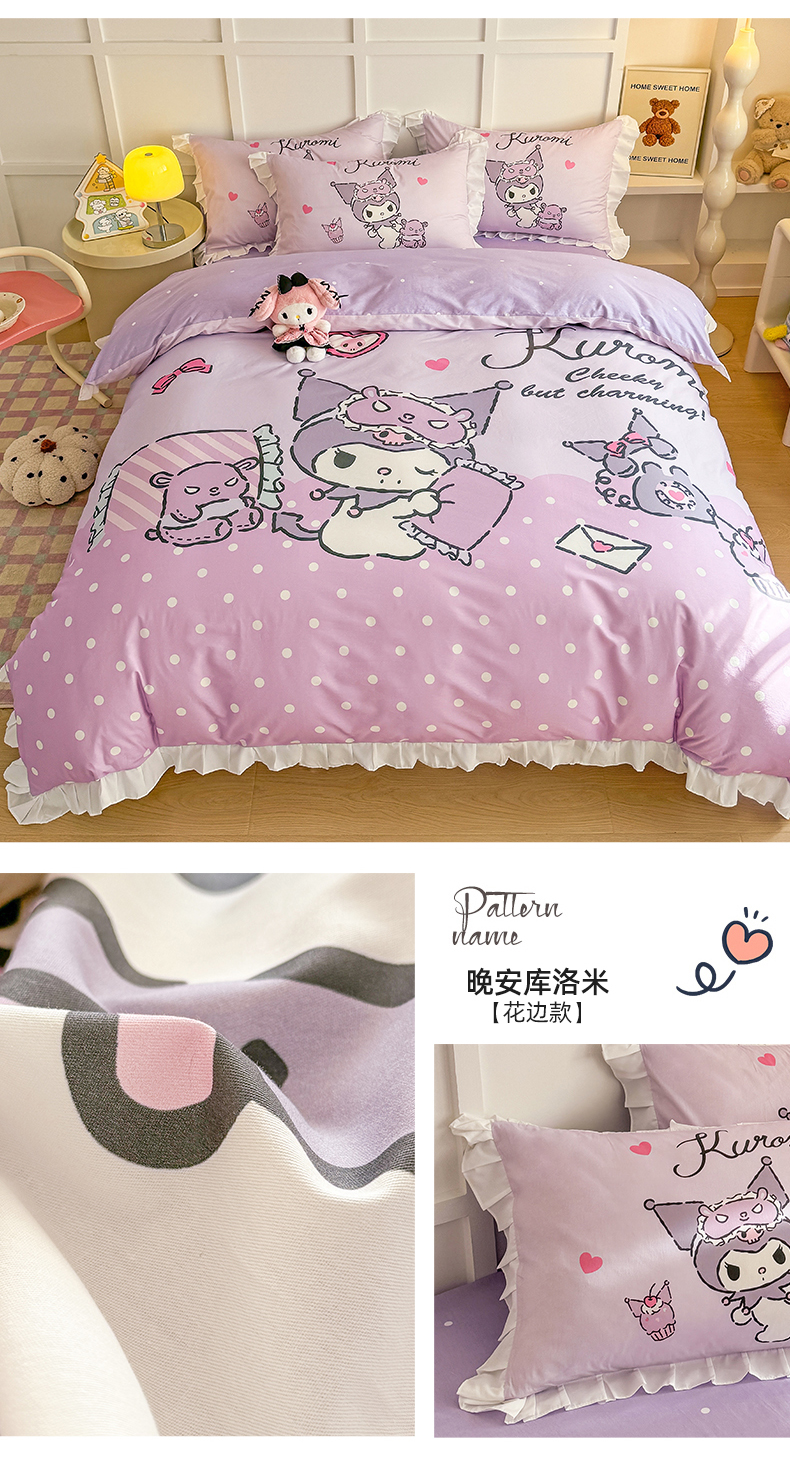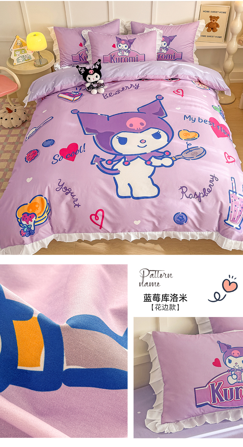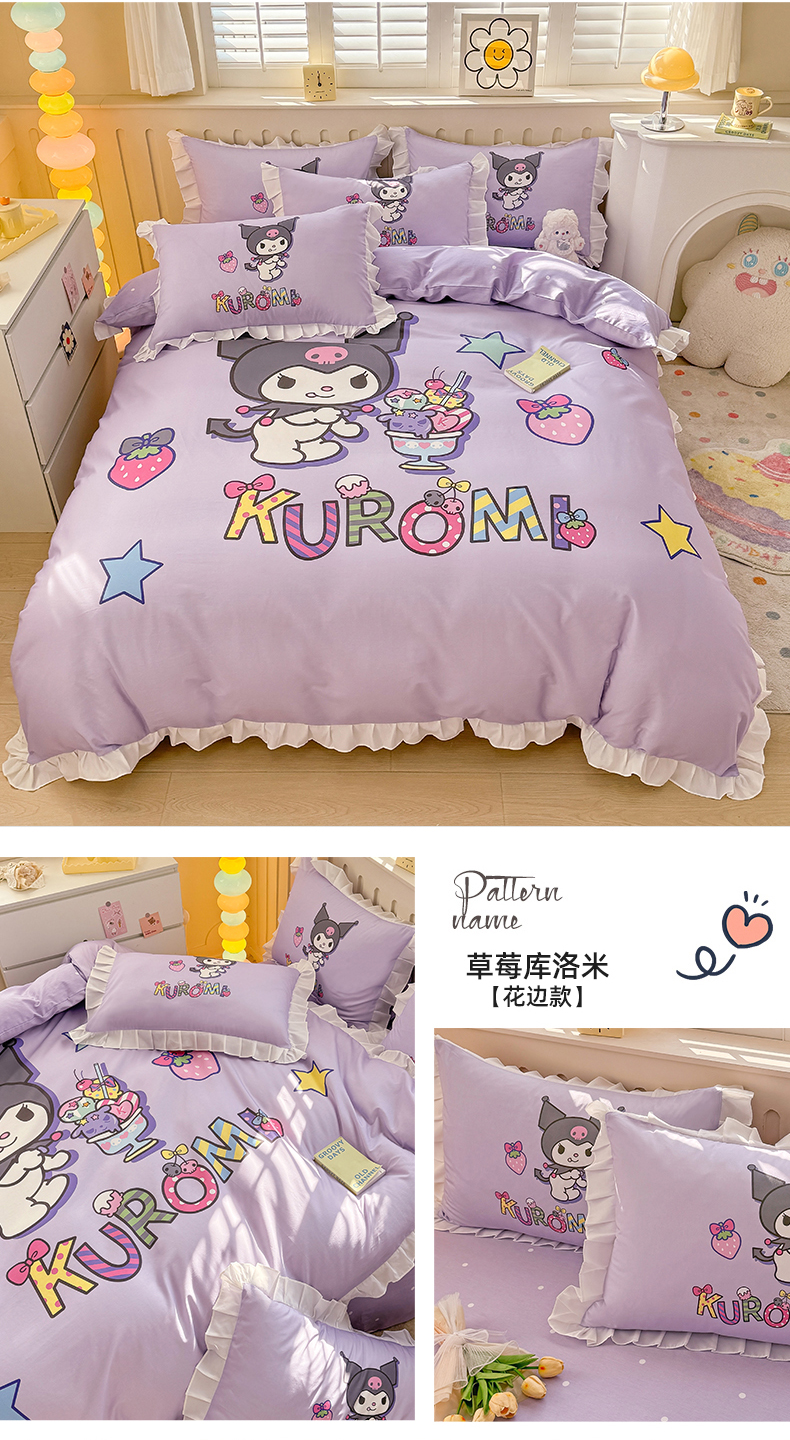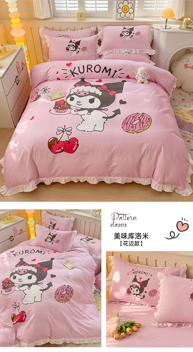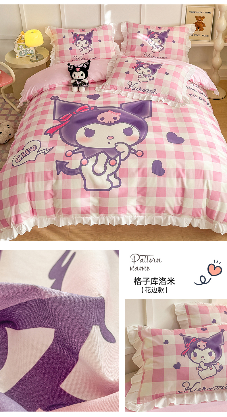 (总)玉元坊 2026新款三丽鸥正版授权库洛米儿童卡通全棉纯棉床单床笠床裙花边被套三四件套,库洛米【花边款】,库洛米宝贝【花边款】,库洛米条纹-白花边款,甜甜库洛米【花边款】,樱桃库洛米【花边款】,紫格库洛米-白花边款