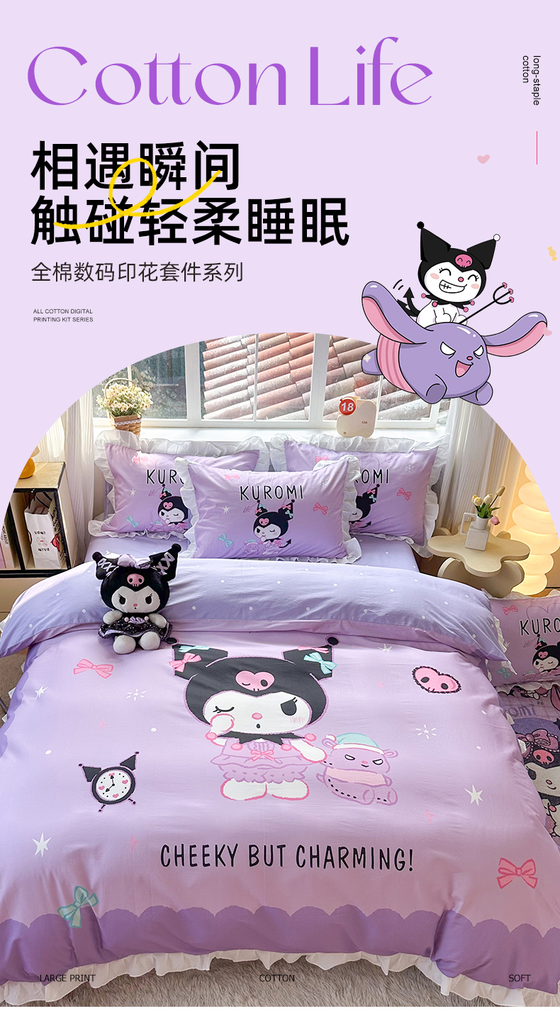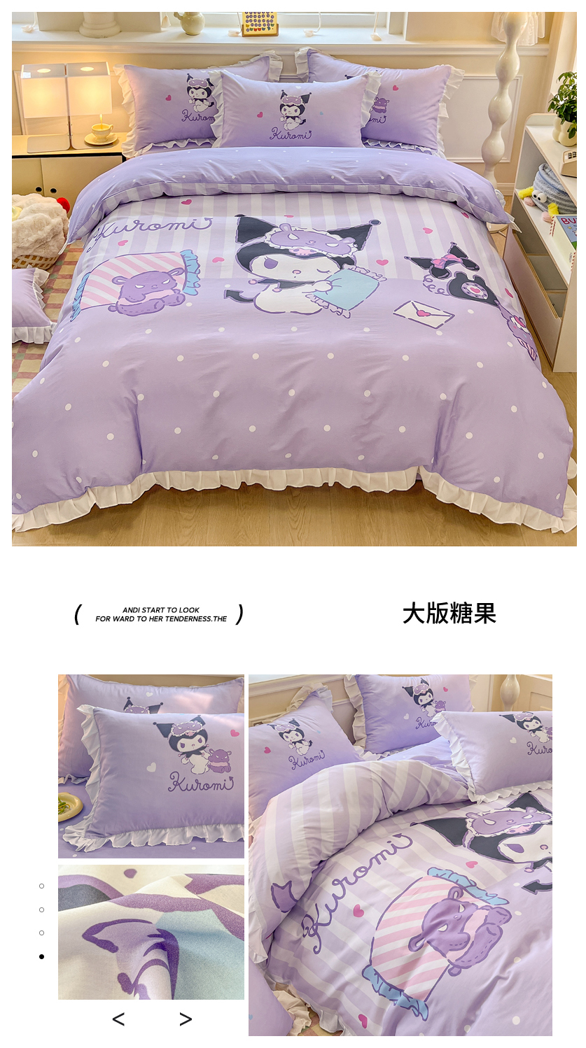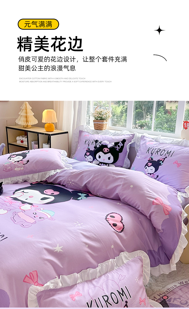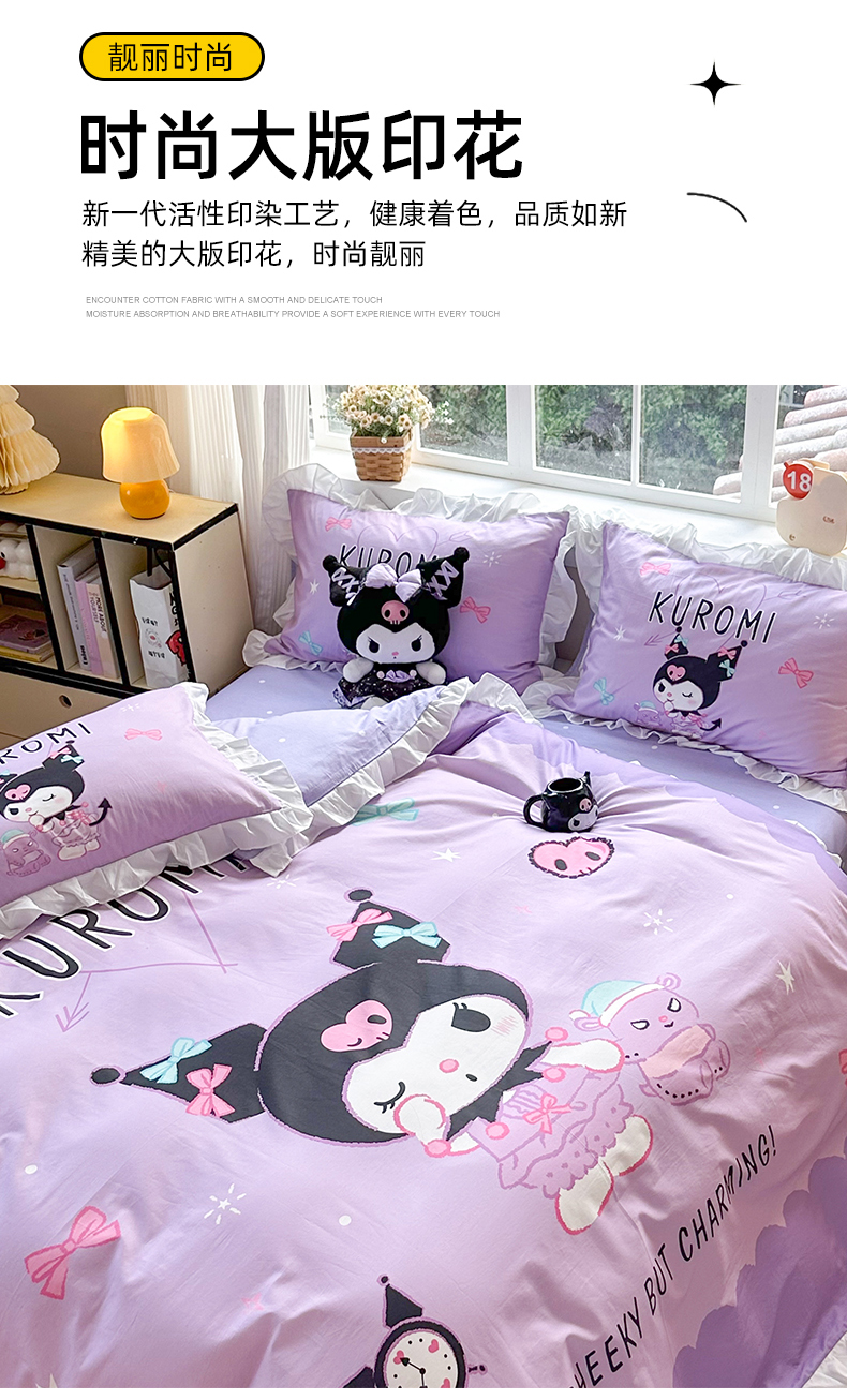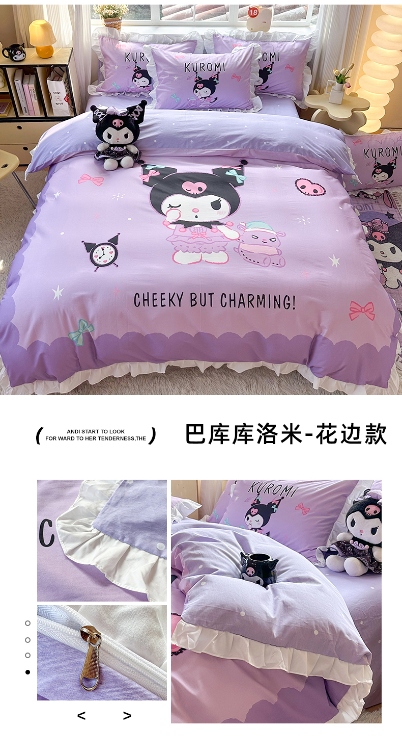 (总)玉元坊 2026新款三丽鸥正版授权库洛米儿童卡通全棉纯棉床单床笠床裙花边被套三四件套,库洛米【花边款】,库洛米宝贝【花边款】,库洛米条纹-白花边款,甜甜库洛米【花边款】,樱桃库洛米【花边款】,紫格库洛米-白花边款