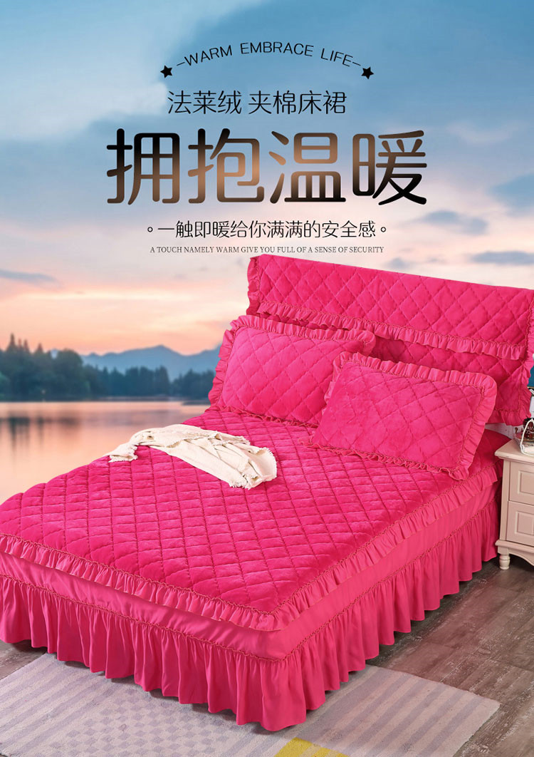 情恒家纺 2020新款法莱绒夹棉床裙 玫红