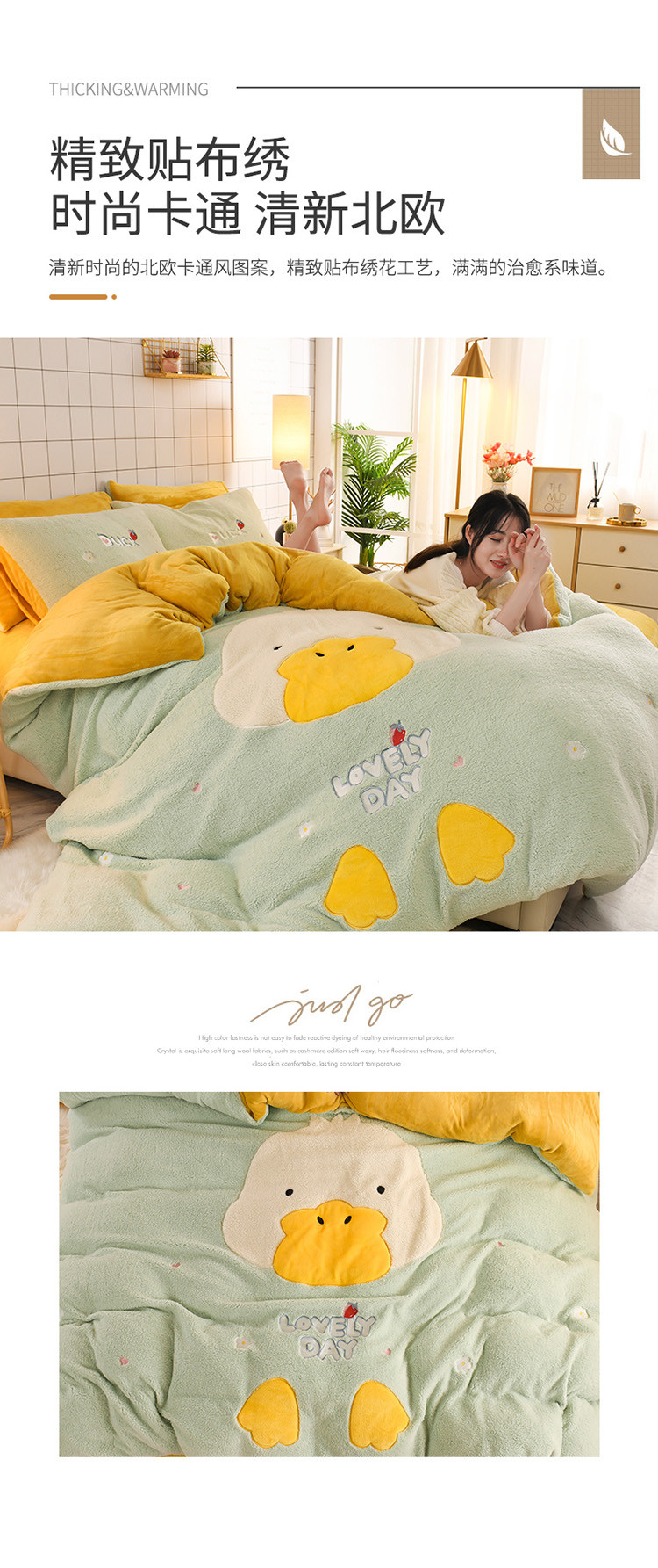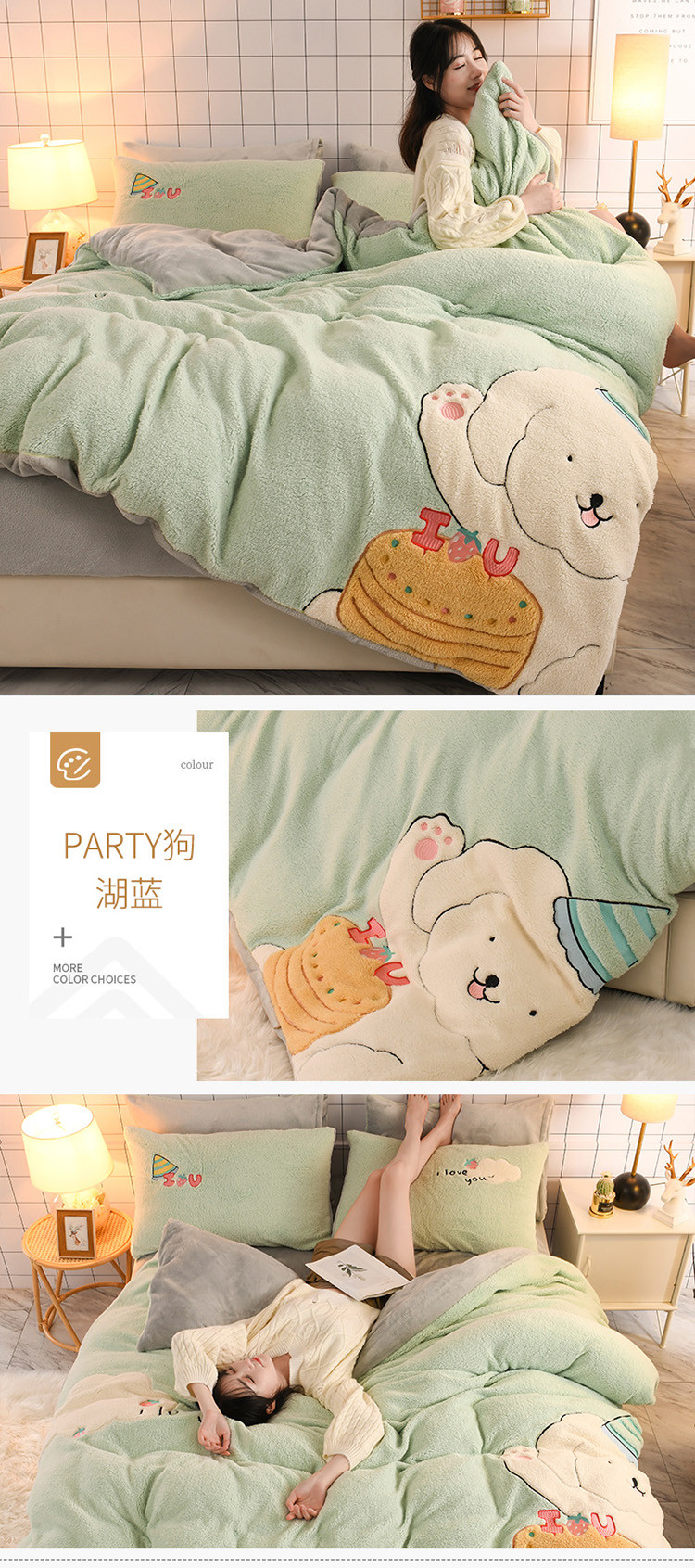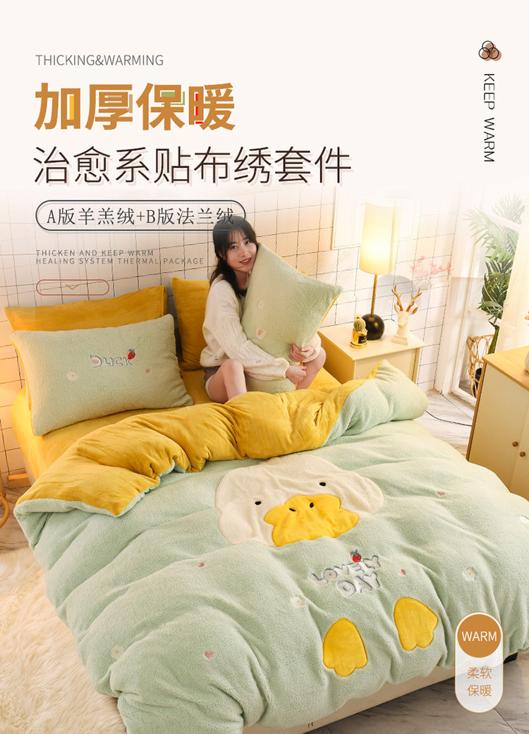 (总)朗莎家纺 2019新款羊羔绒贴布绣四件套,彩虹精灵,菠萝玉色,草莓奶白,独角兽抹茶绿,好色龙银灰,荷包蛋姜黄,荷包蛋抹茶绿,柠檬抹茶绿,柠檬墨绿,牛油果抹茶绿,圣诞鹿豆沙,小鸡藏青,小鸡午夜蓝,小鸡银灰