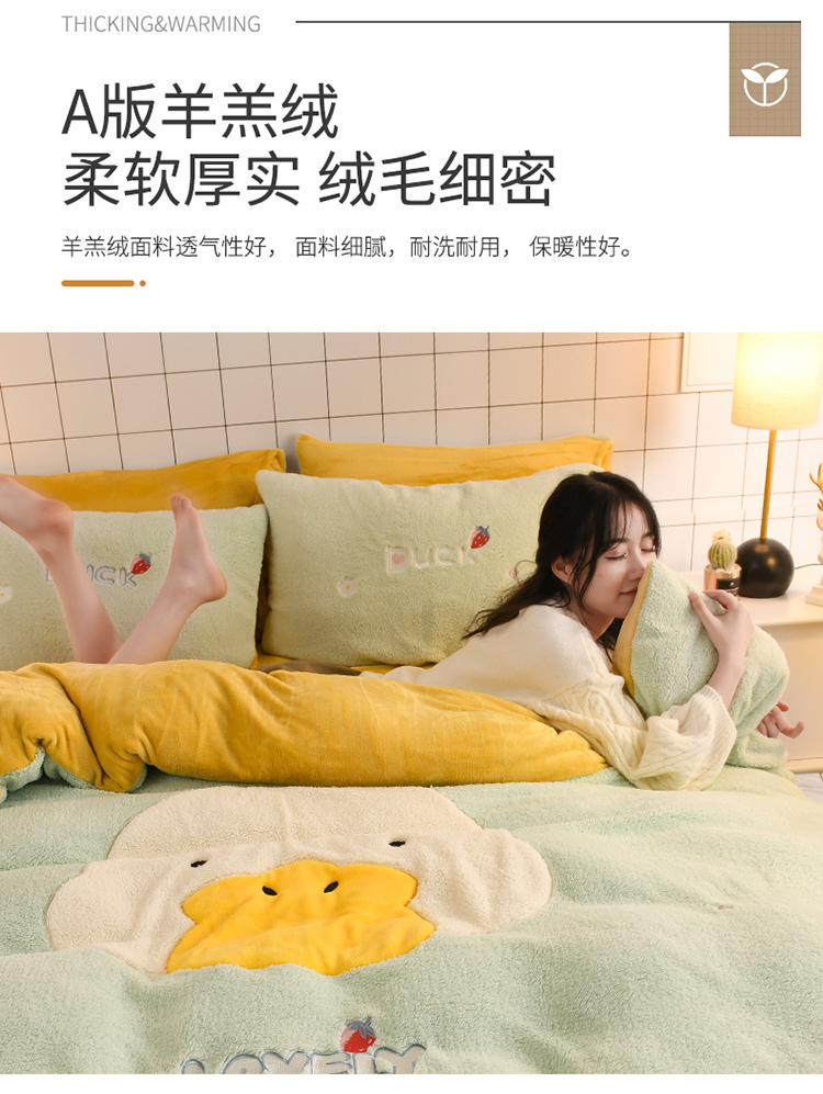 商品名称:朗莎家纺 2020新款羊羔绒法兰绒四件套 淘气鸭-湖蓝