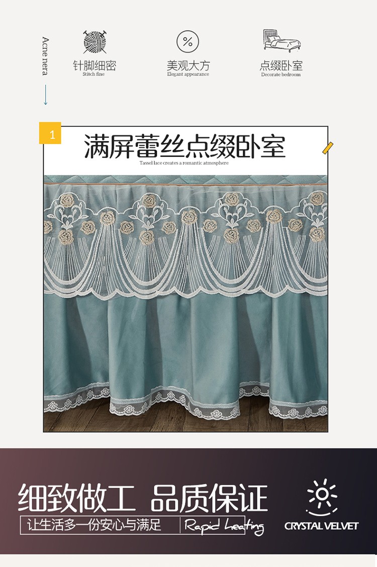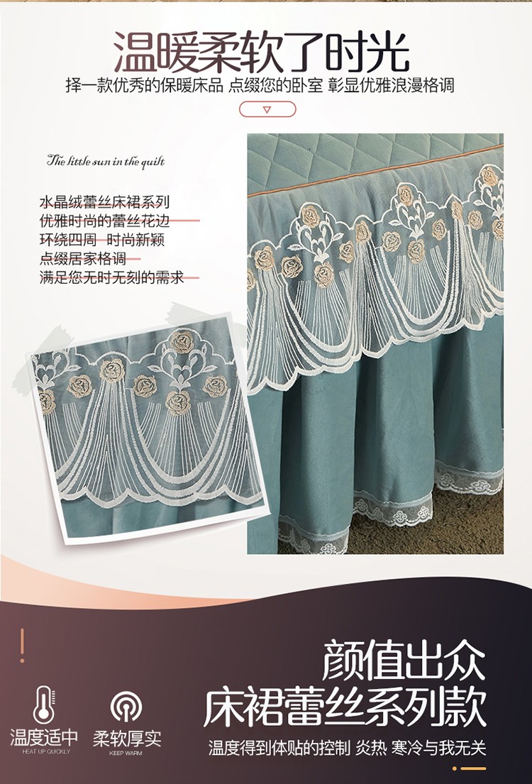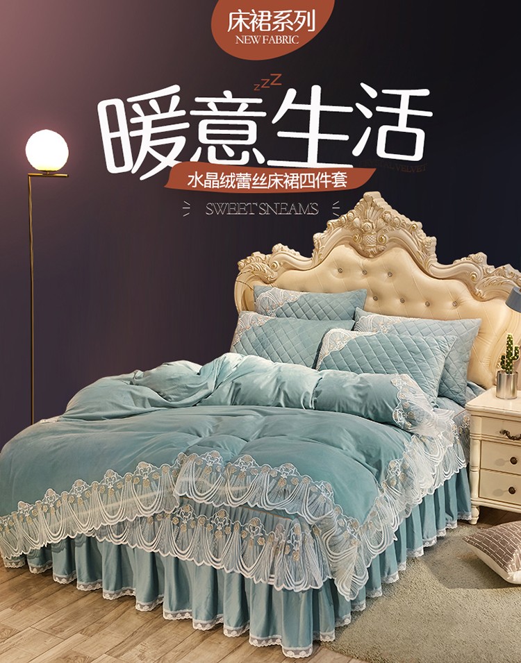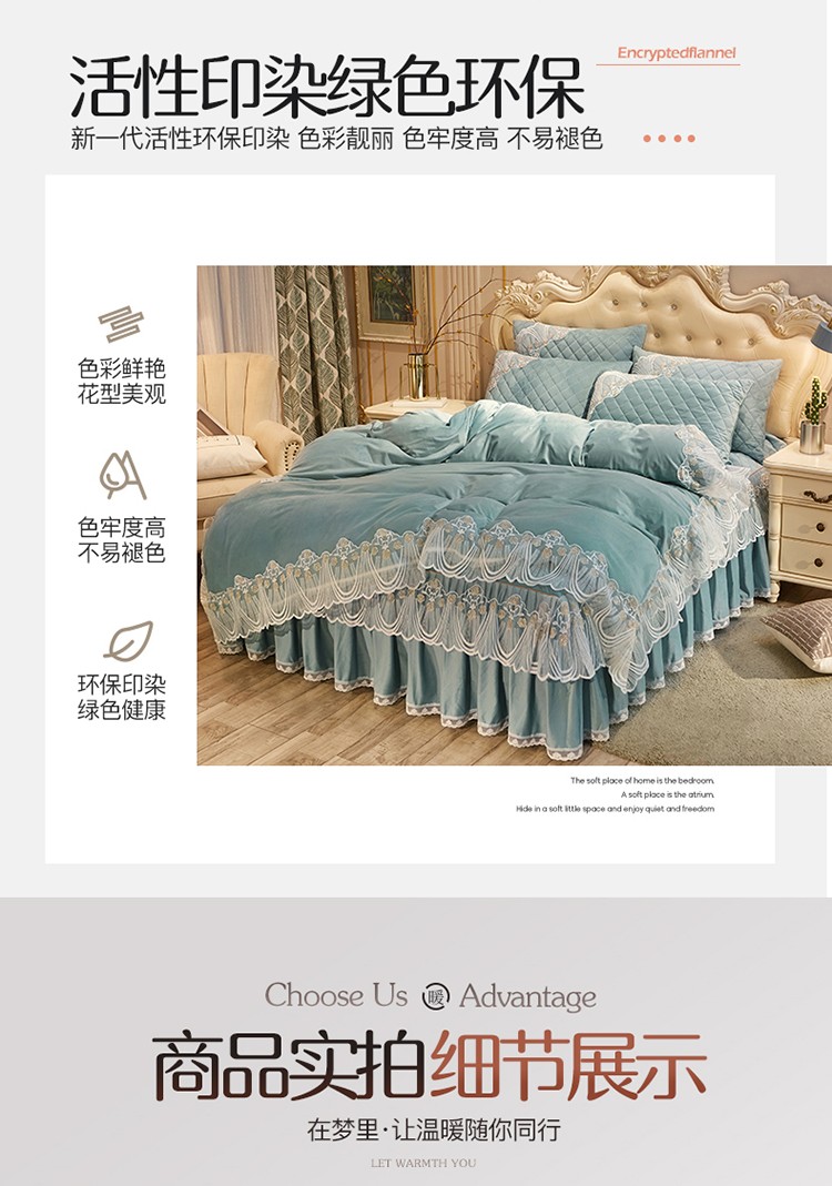商品名称:网红馆 2025新款幸福花开水晶绒蕾丝床裙四件套 雾霾蓝