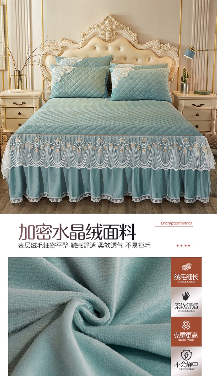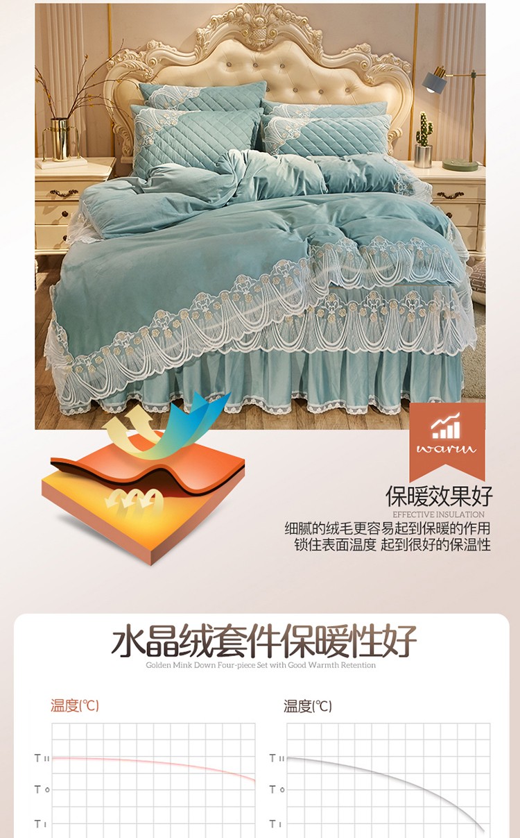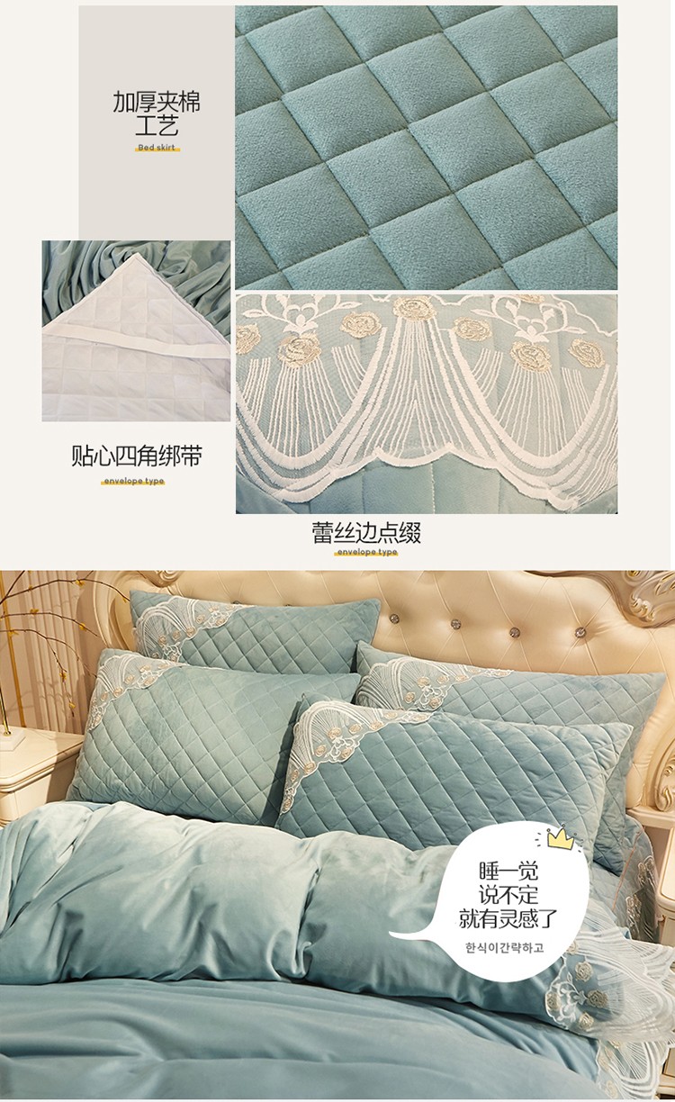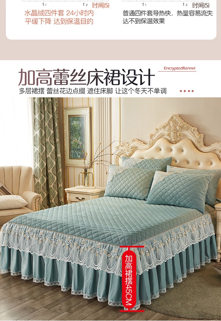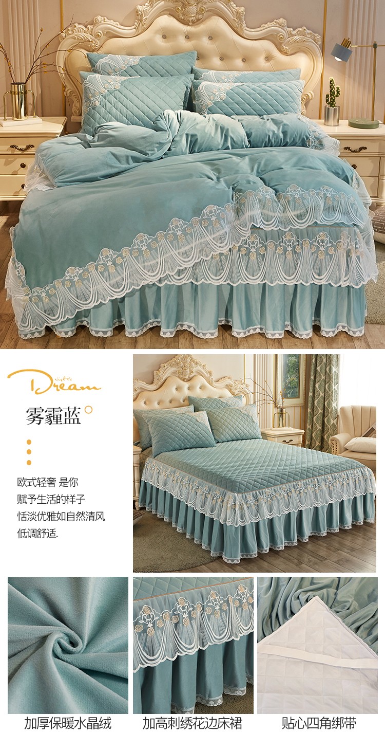 网红馆 2025新款幸福花开水晶绒蕾丝床裙四件套 雾霾蓝