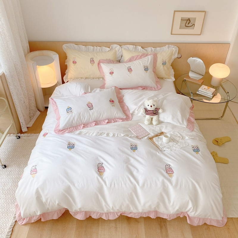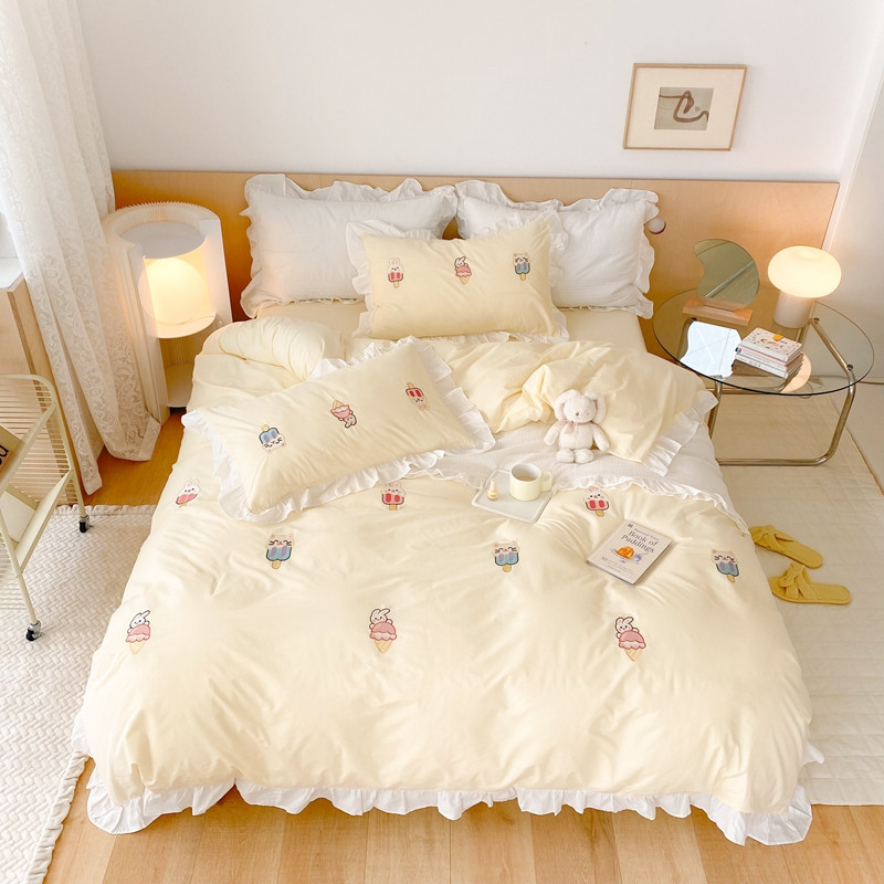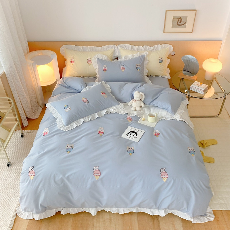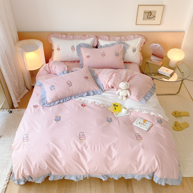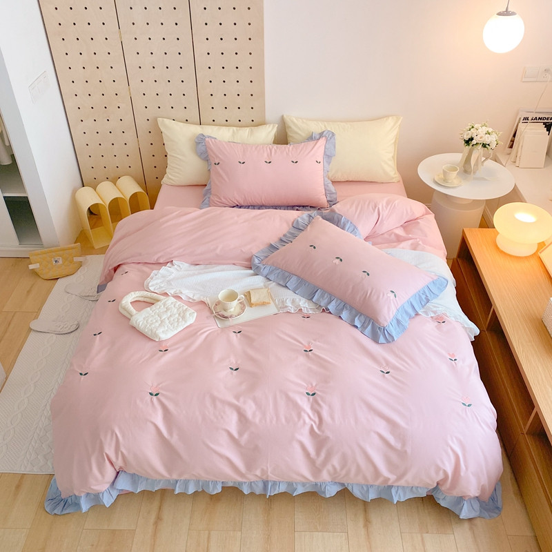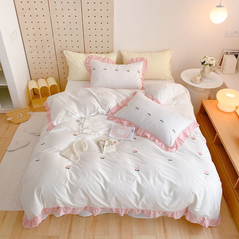(总)本希新款40全棉水洗棉荷叶边刺绣小清新四件套