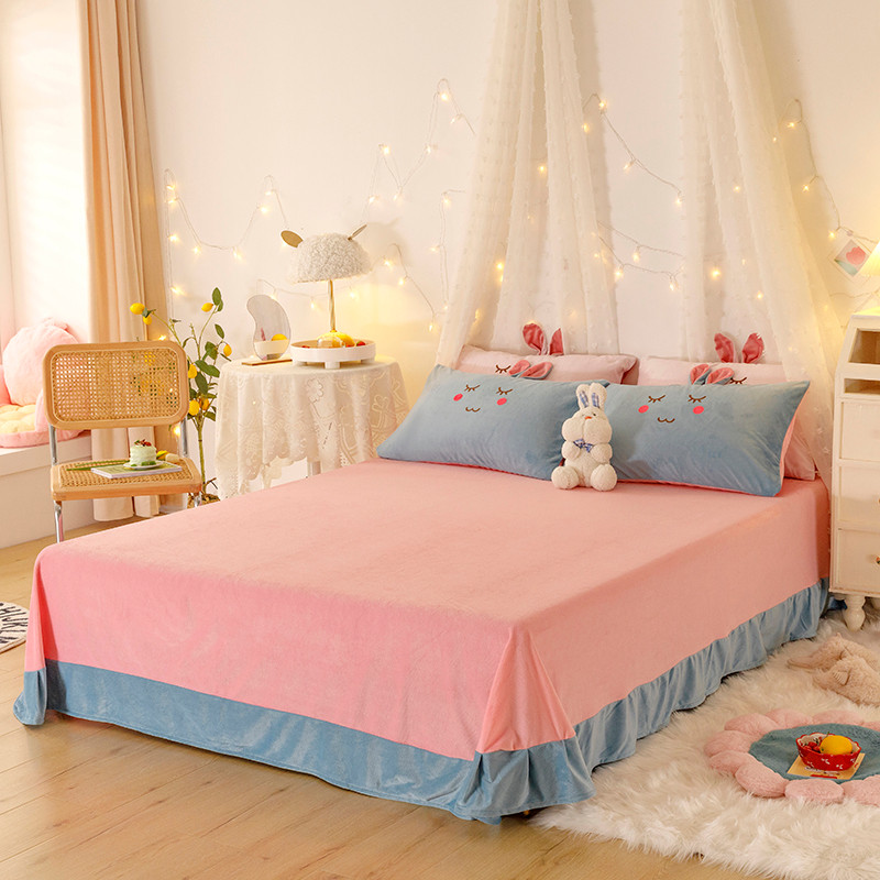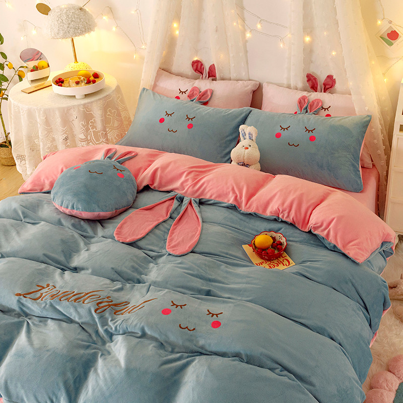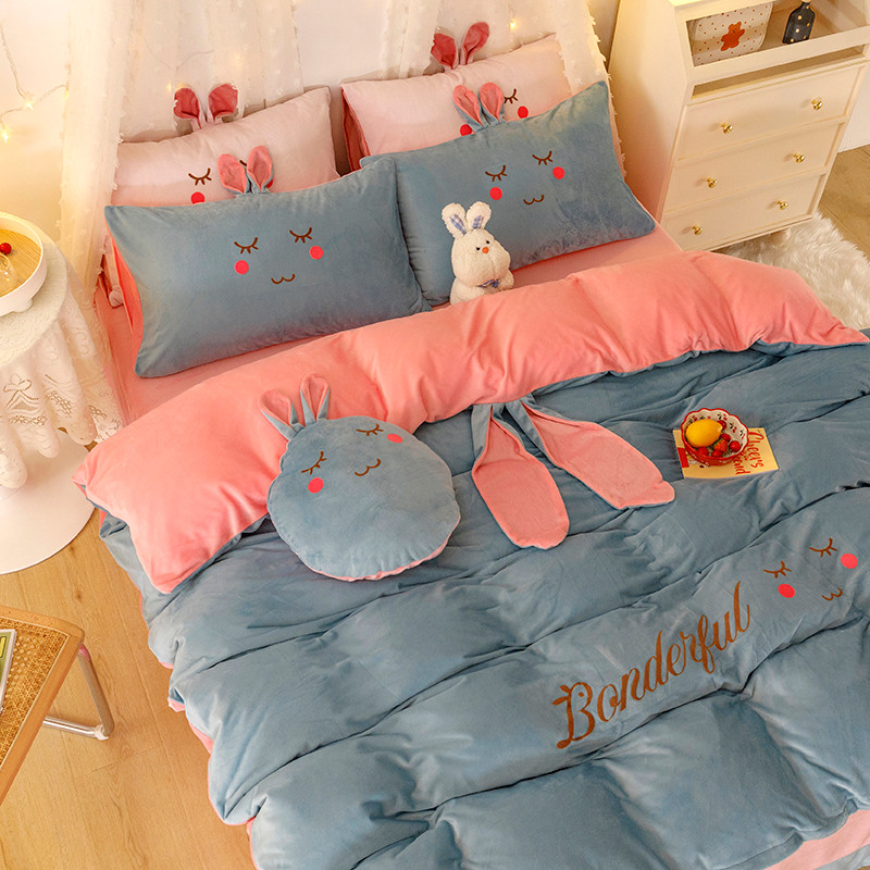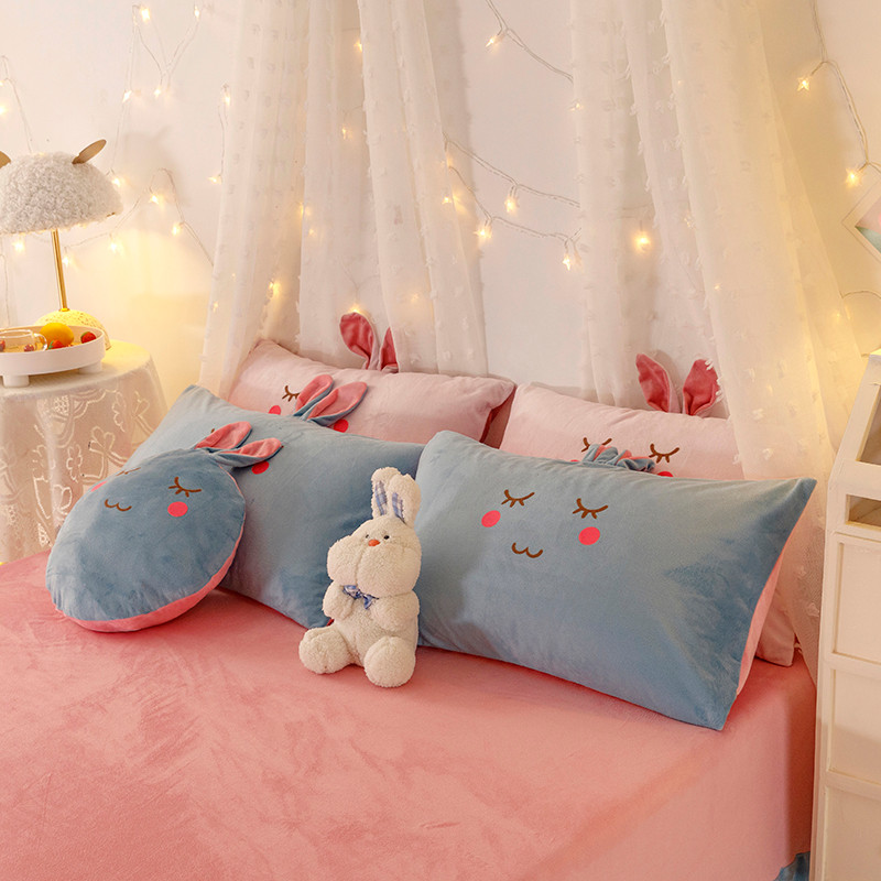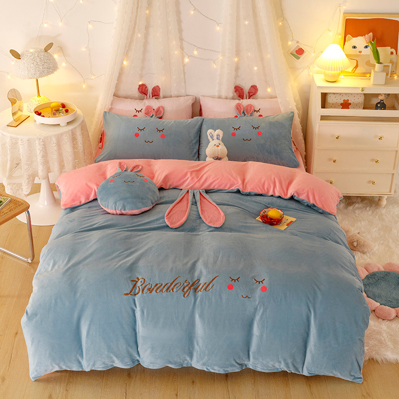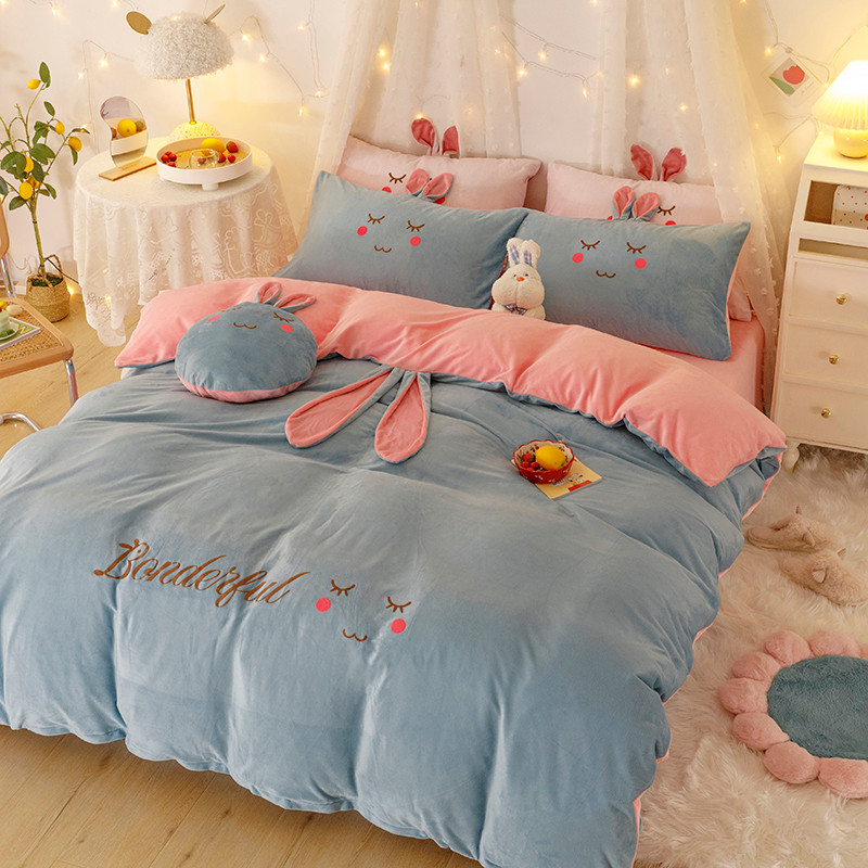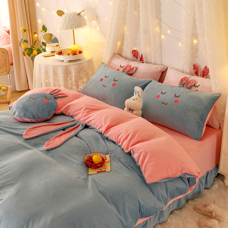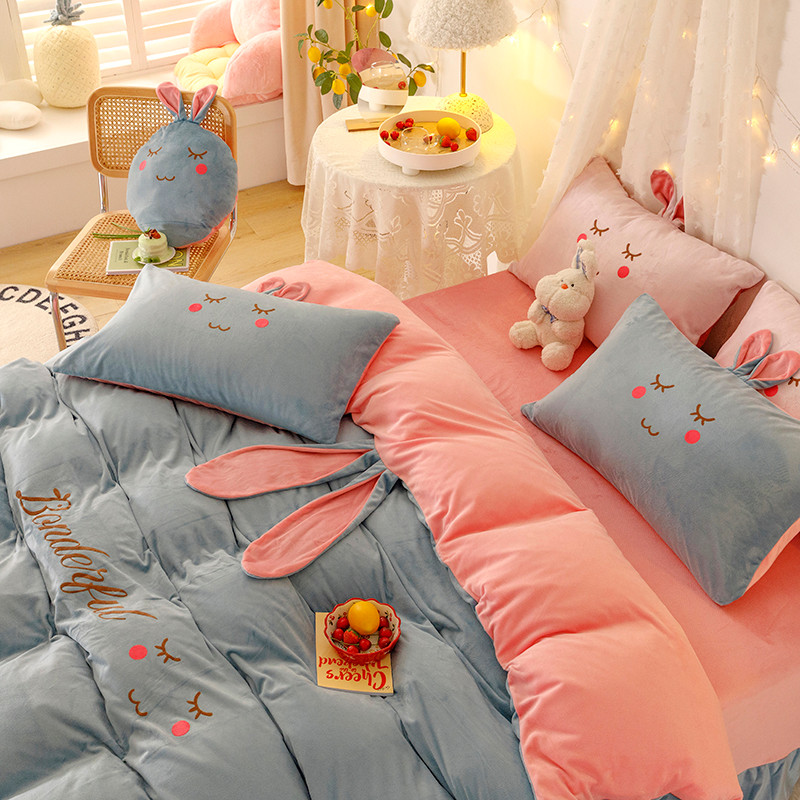 商品名称:纽缦 2021新款兔耳朵水晶绒床单床笠四件套 兔子 蓝灰粉