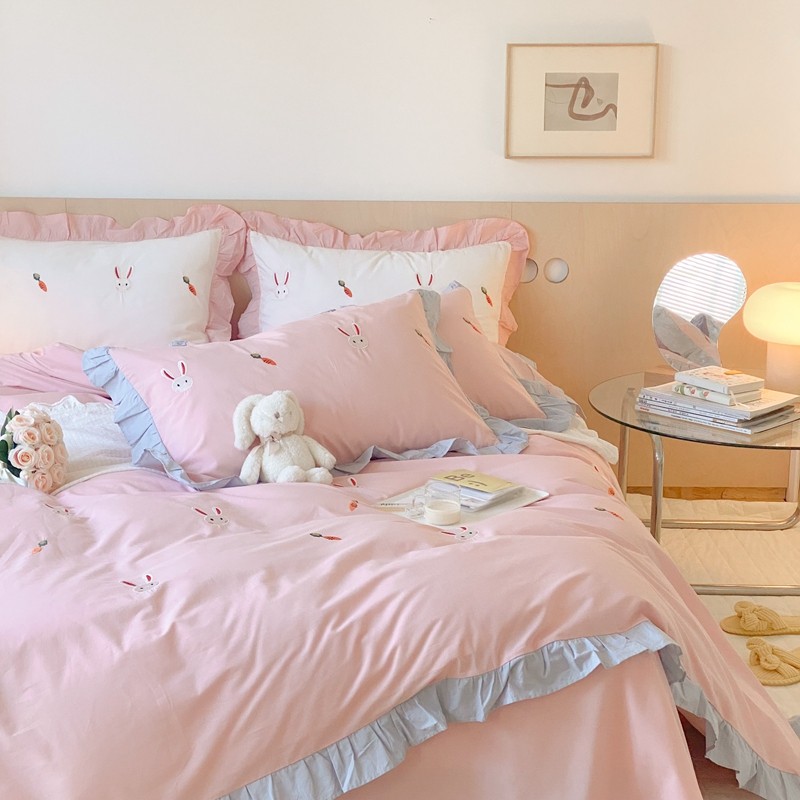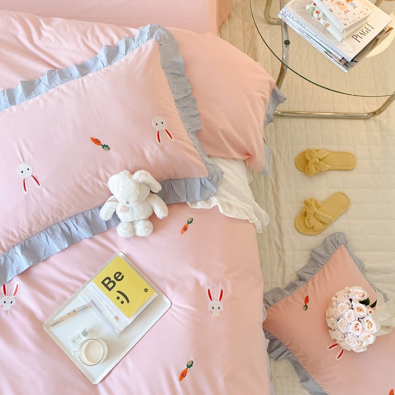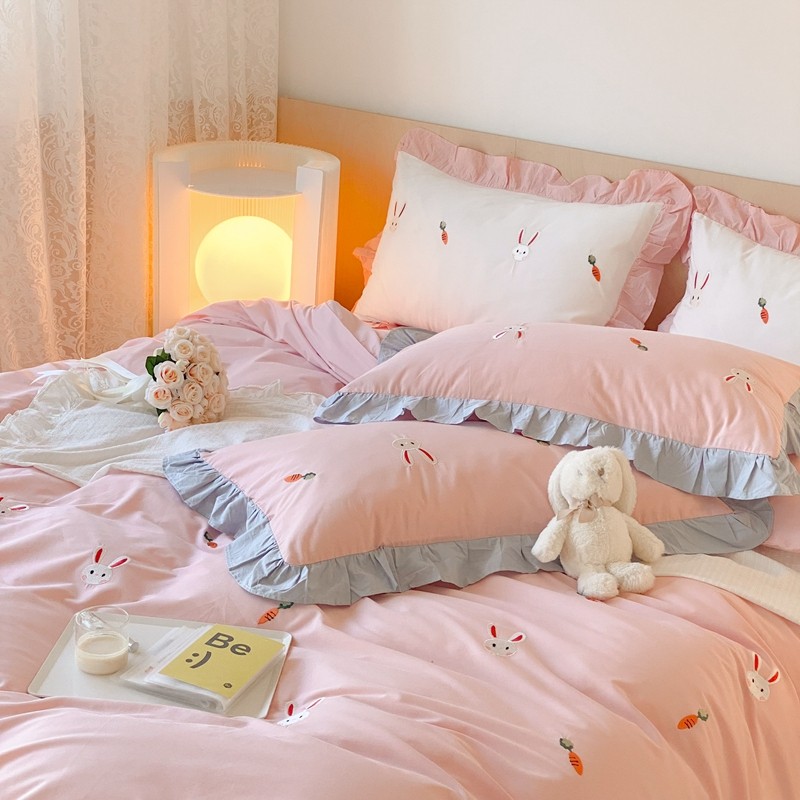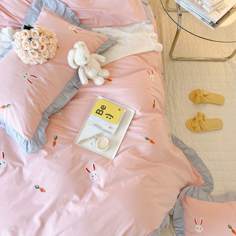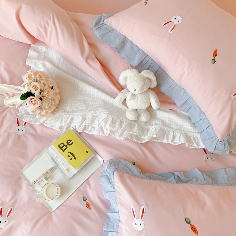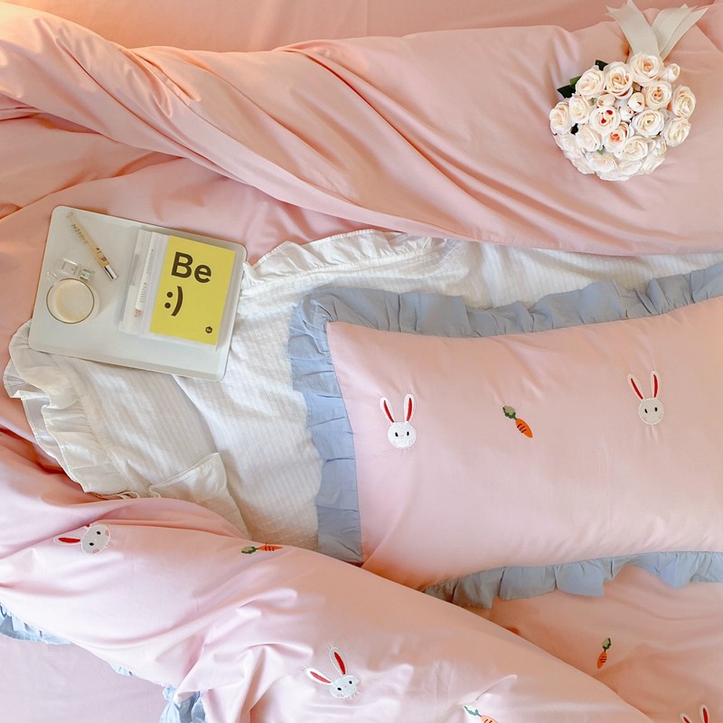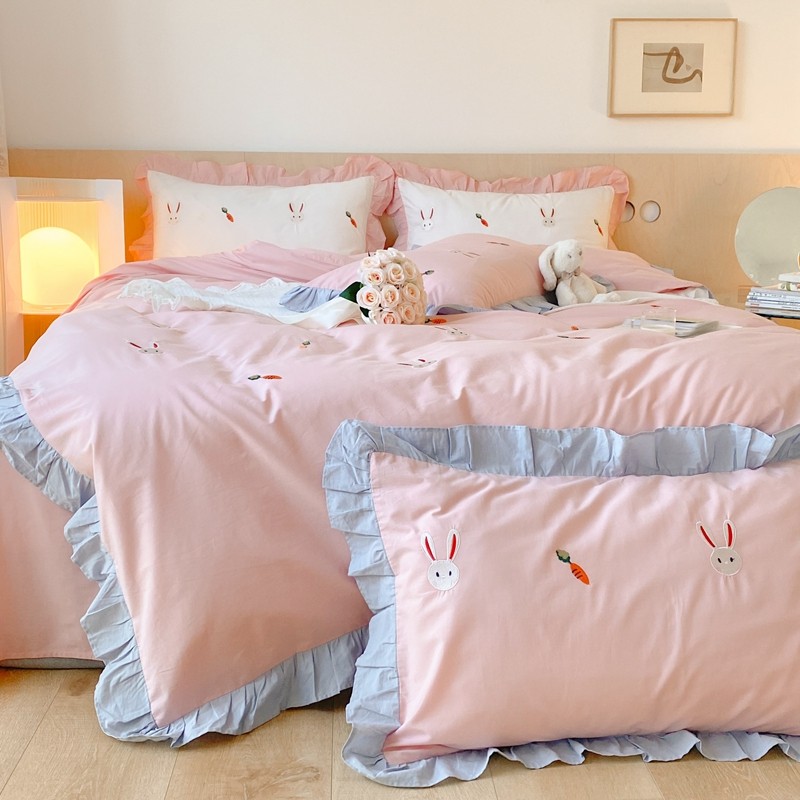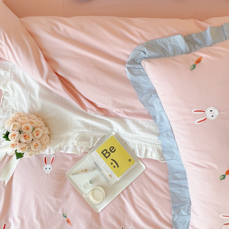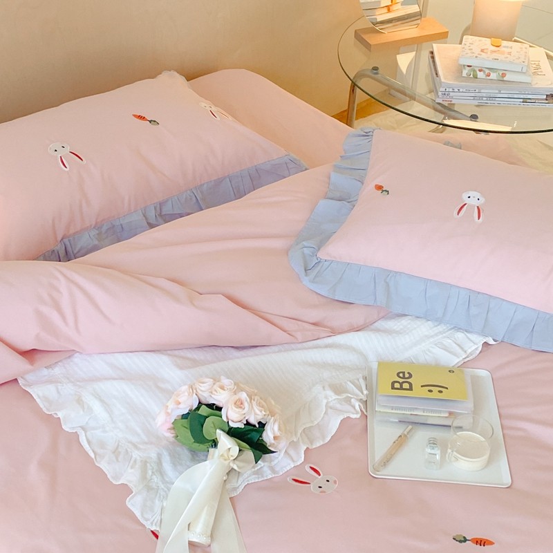 本希新款40全棉水洗棉荷叶边刺绣小清新四件套 幸运兔淡雅粉