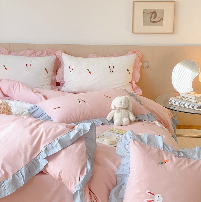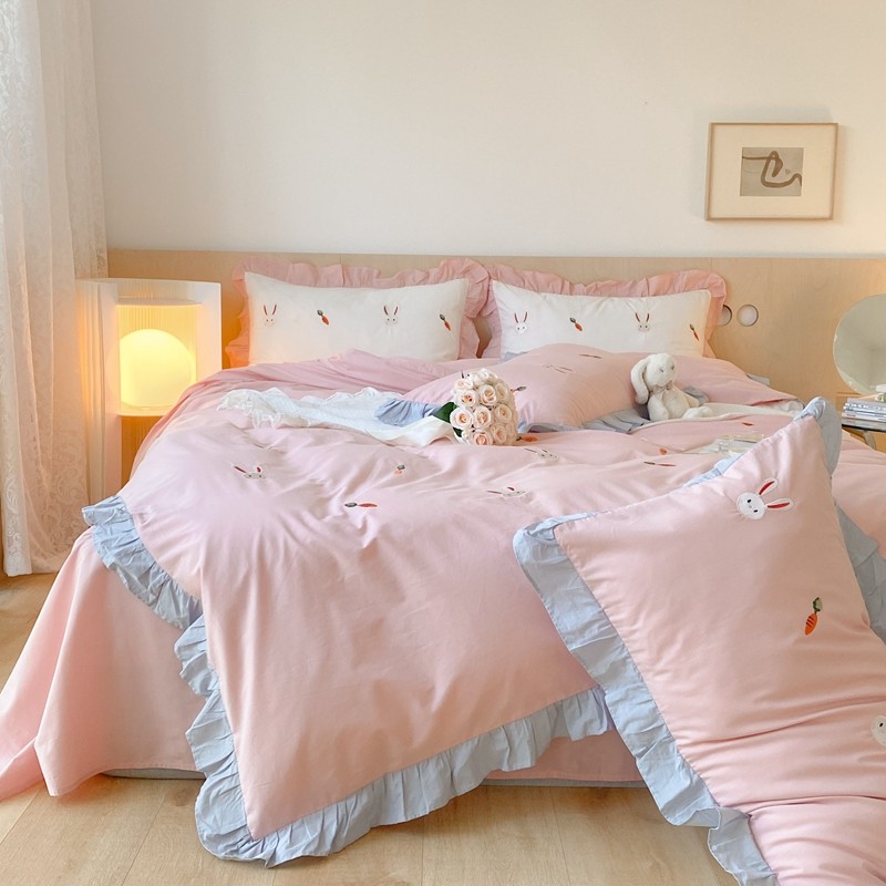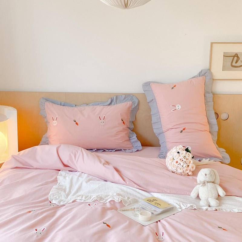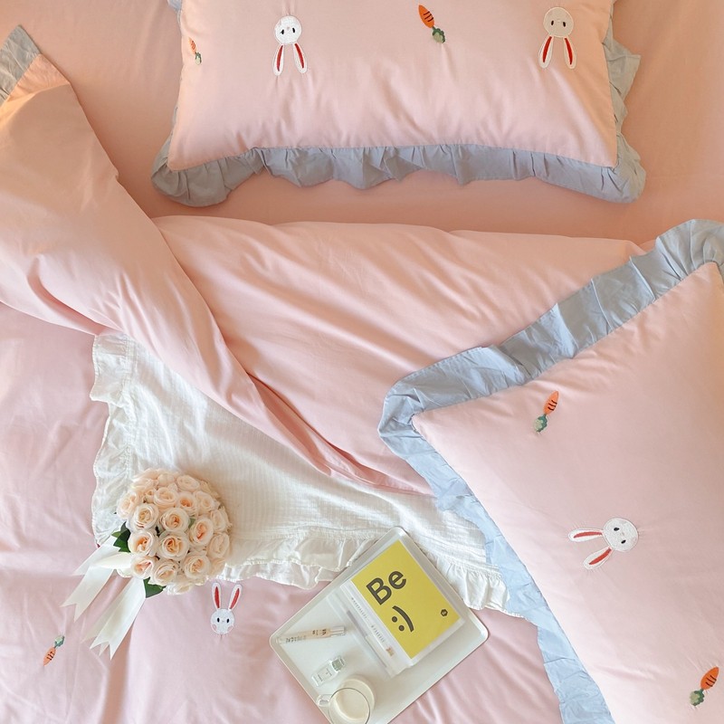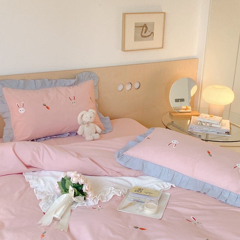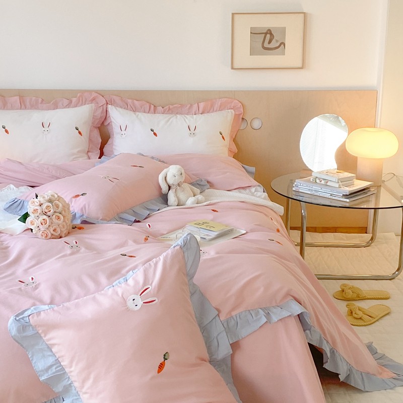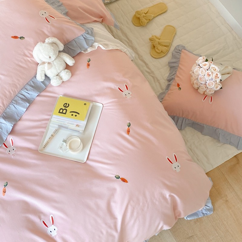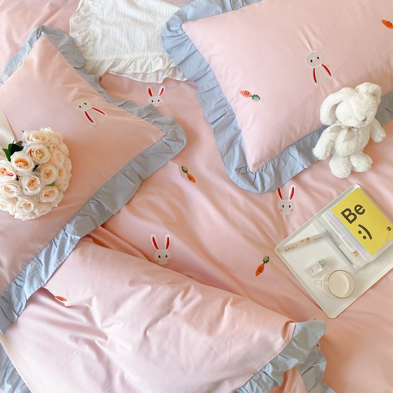 本希新款40全棉水洗棉荷叶边刺绣小清新四件套 幸运兔淡雅粉