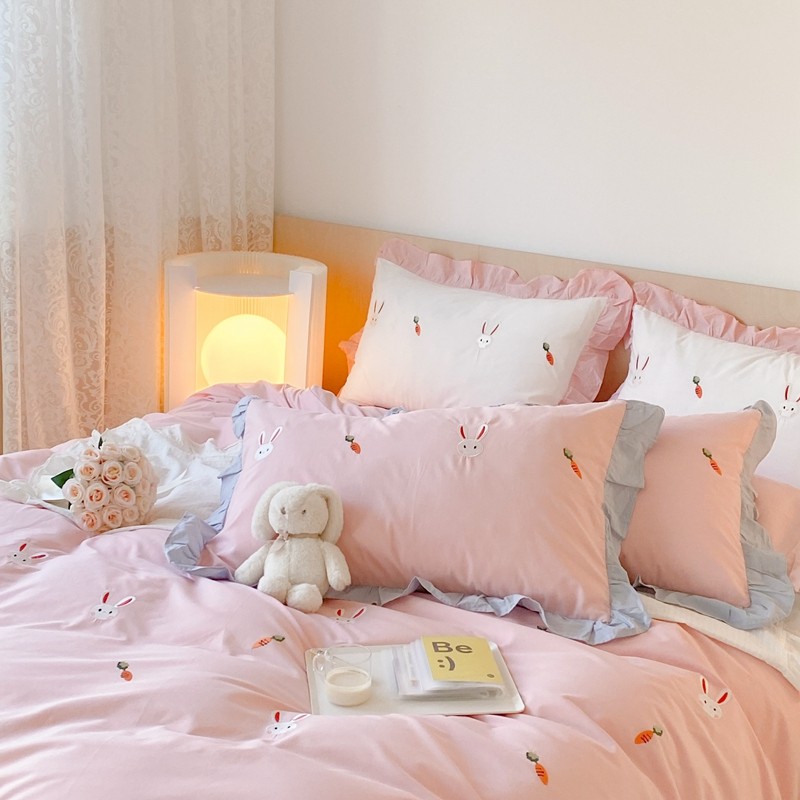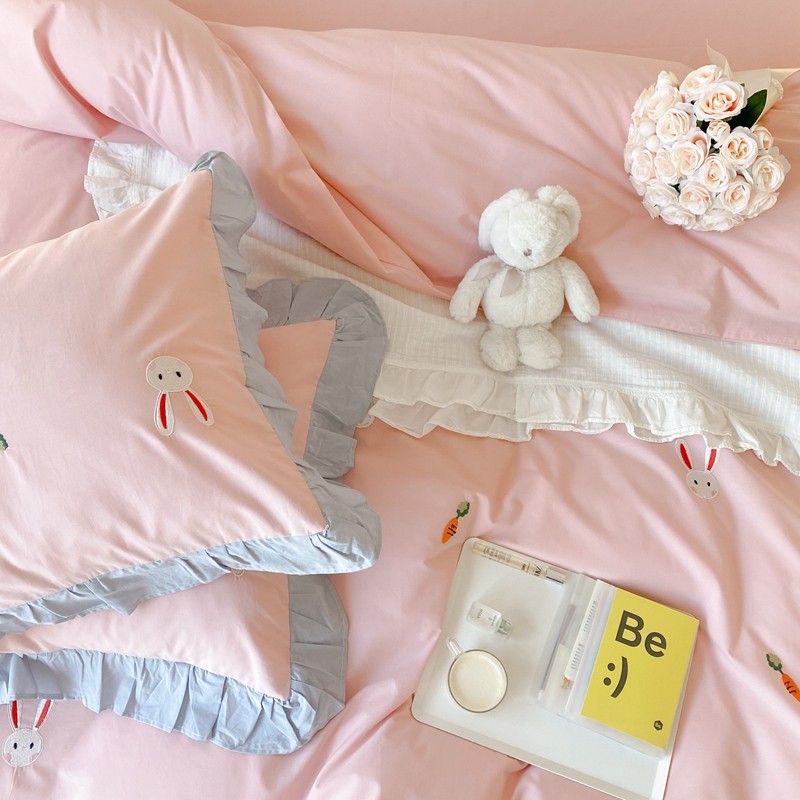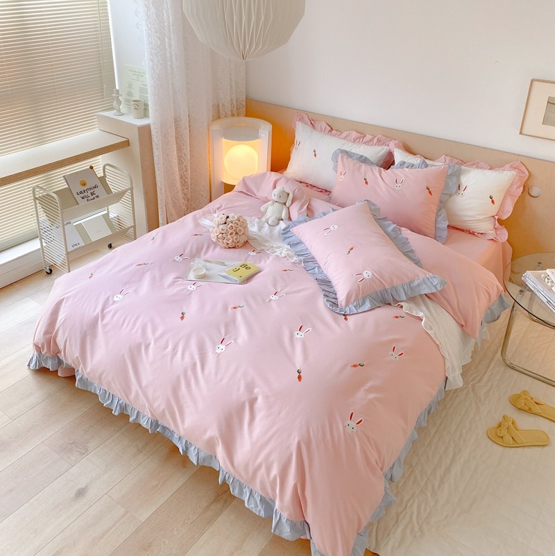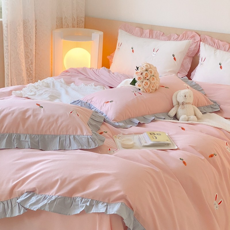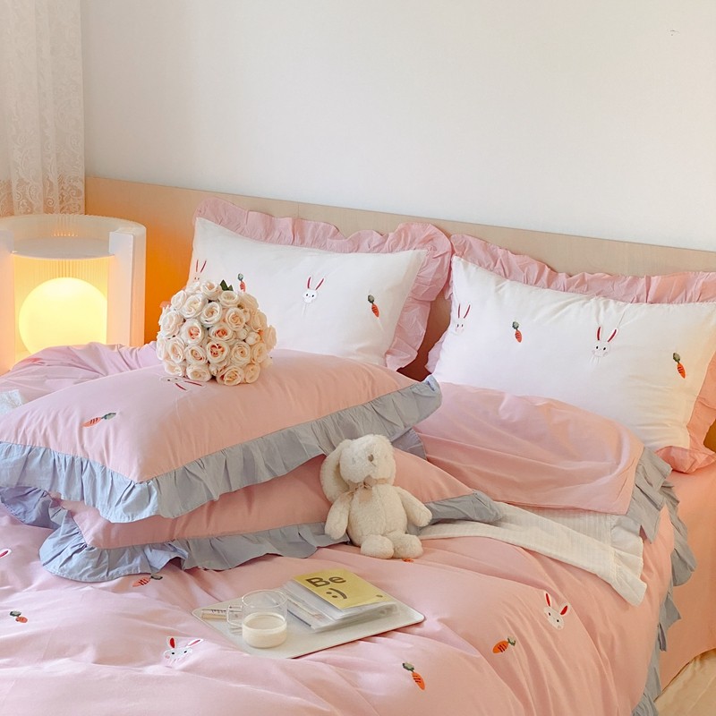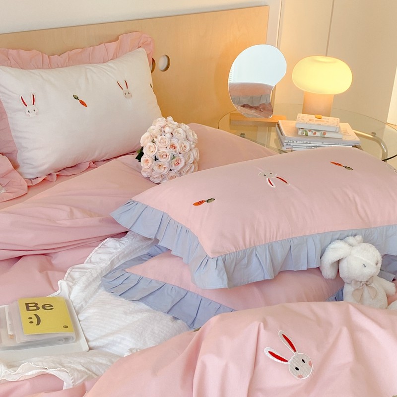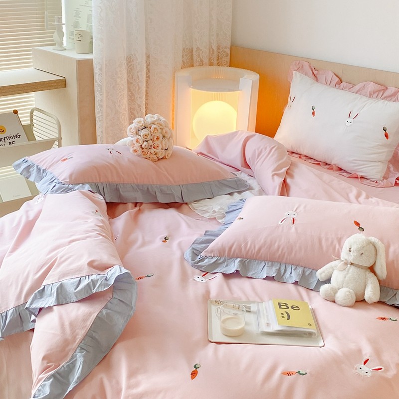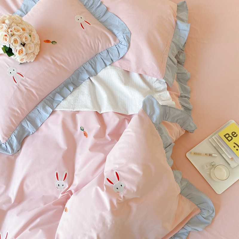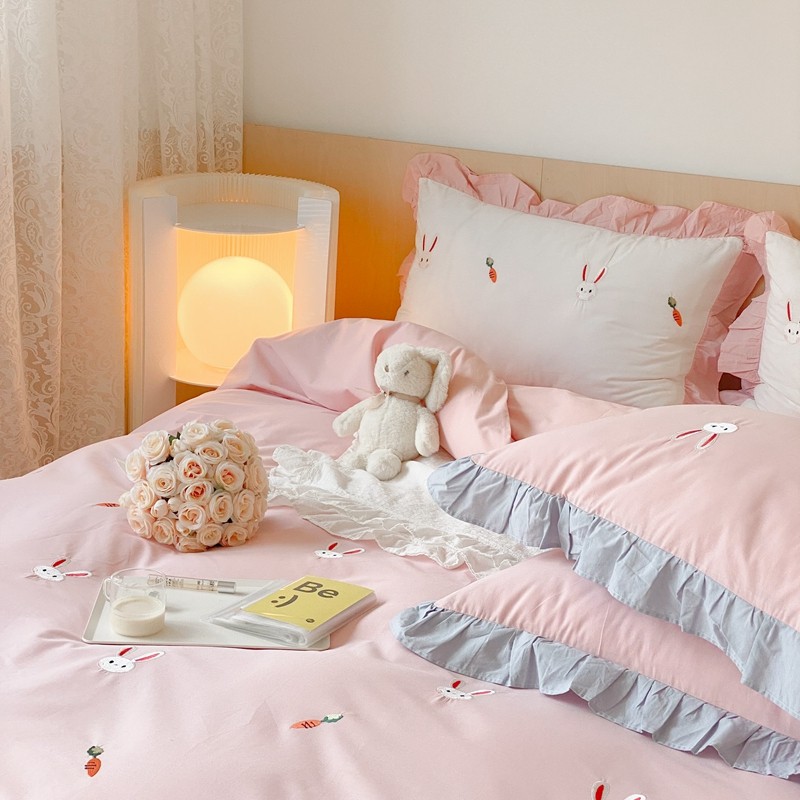 本希新款40全棉水洗棉荷叶边刺绣小清新四件套 幸运兔淡雅粉