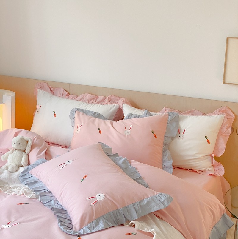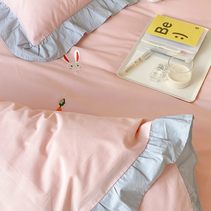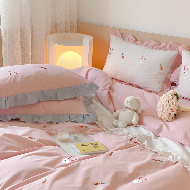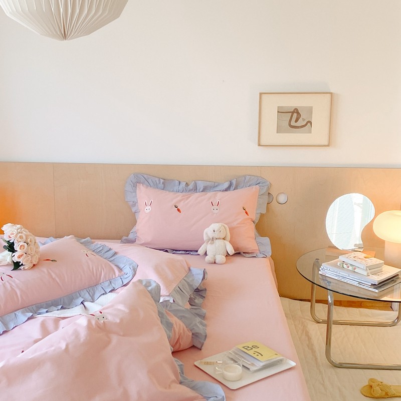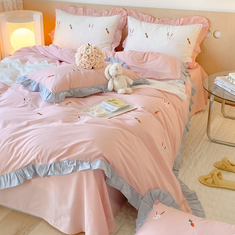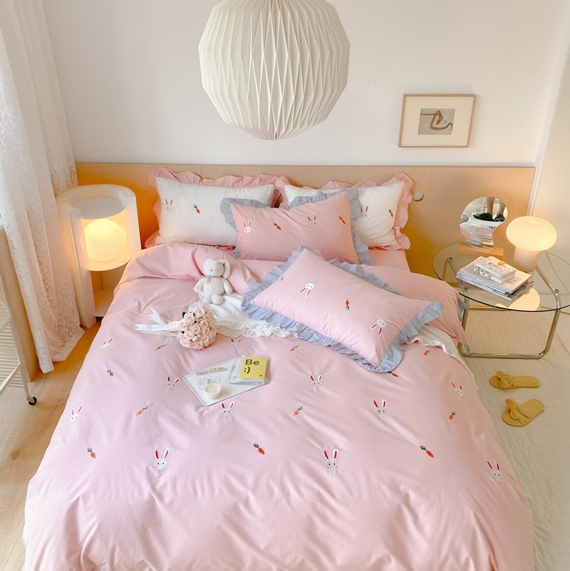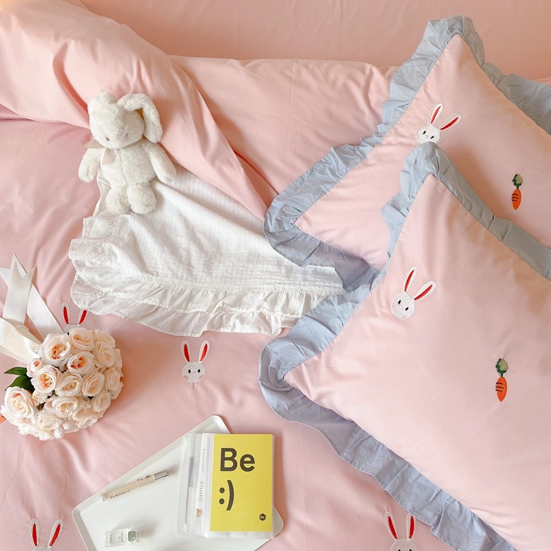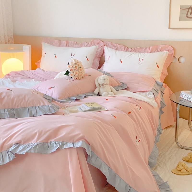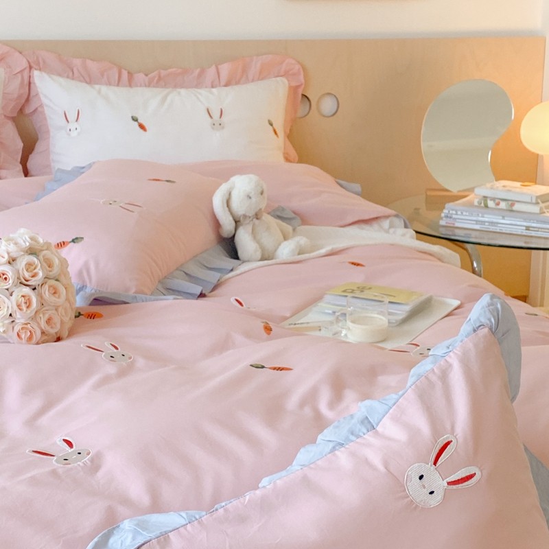 本希新款40全棉水洗棉荷叶边刺绣小清新四件套 幸运兔淡雅粉