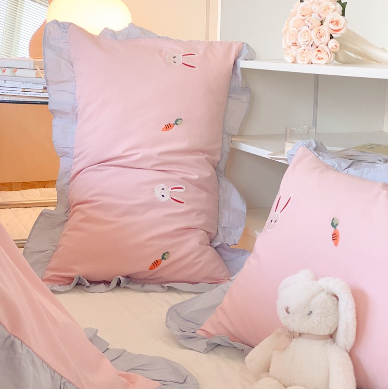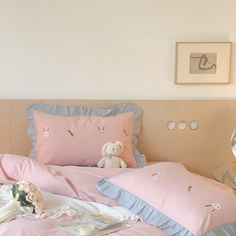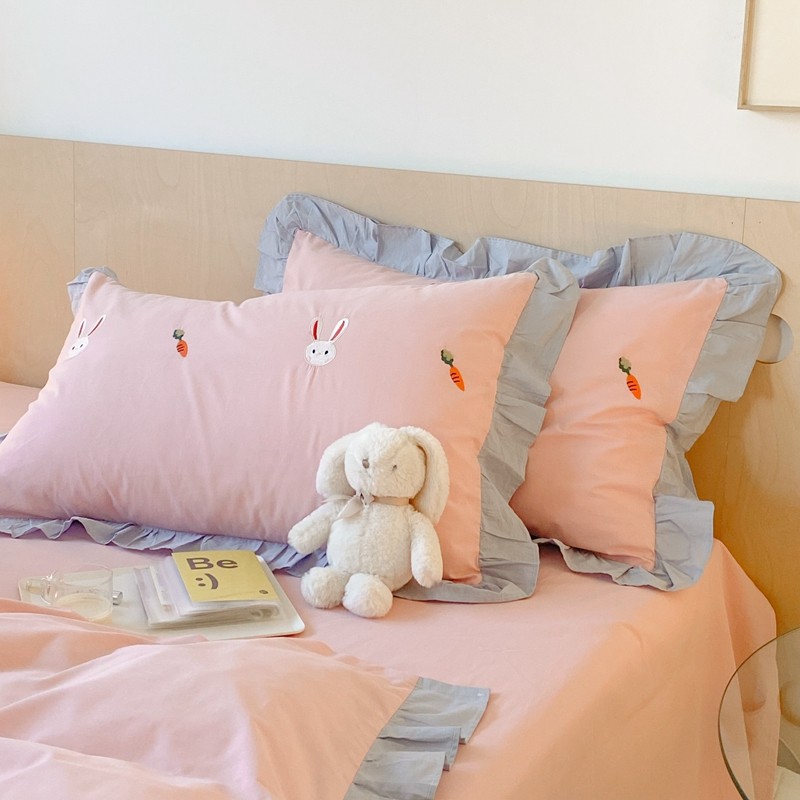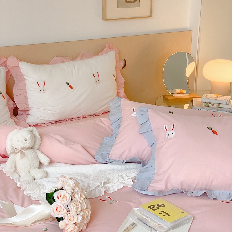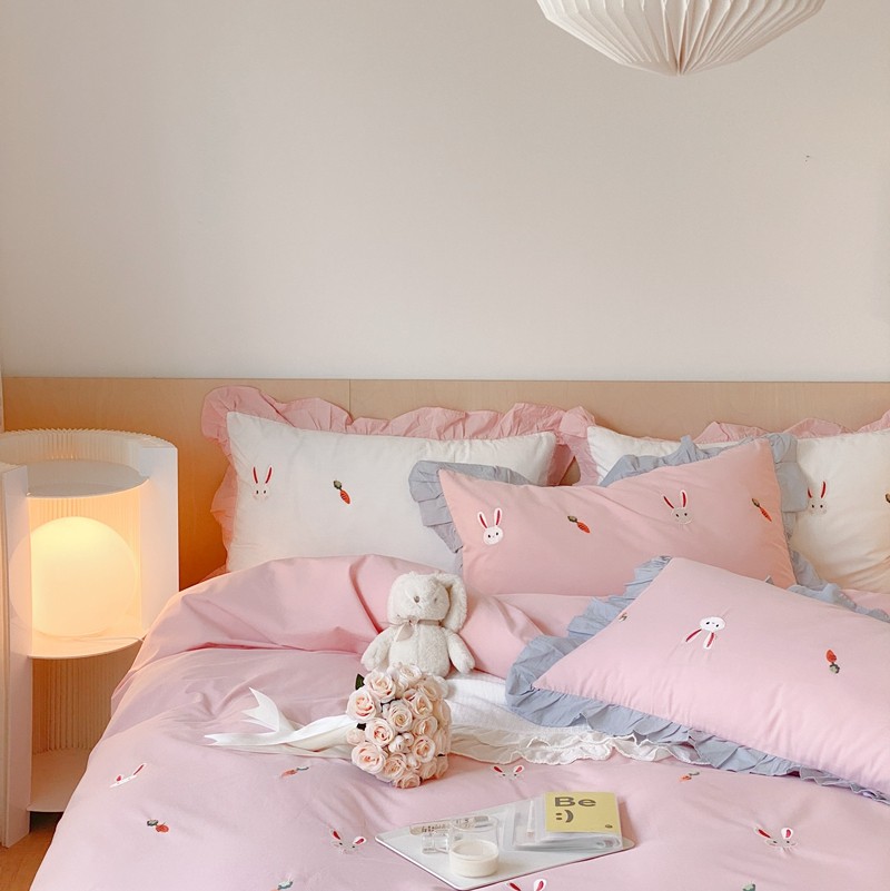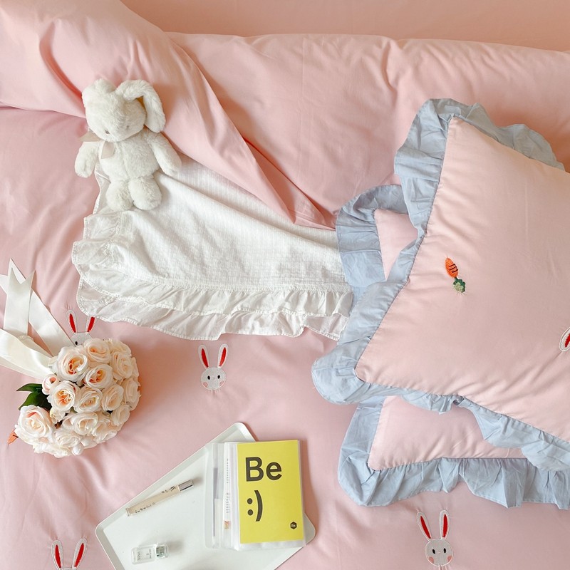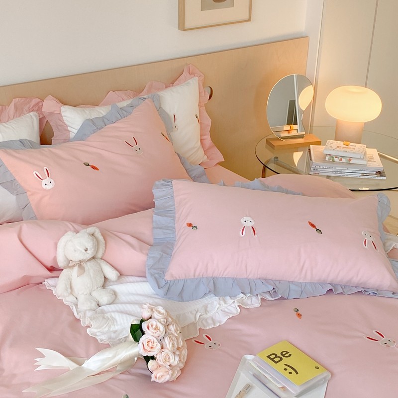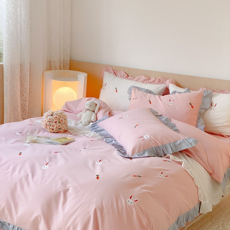 本希新款40全棉水洗棉荷叶边刺绣小清新四件套 幸运兔淡雅粉