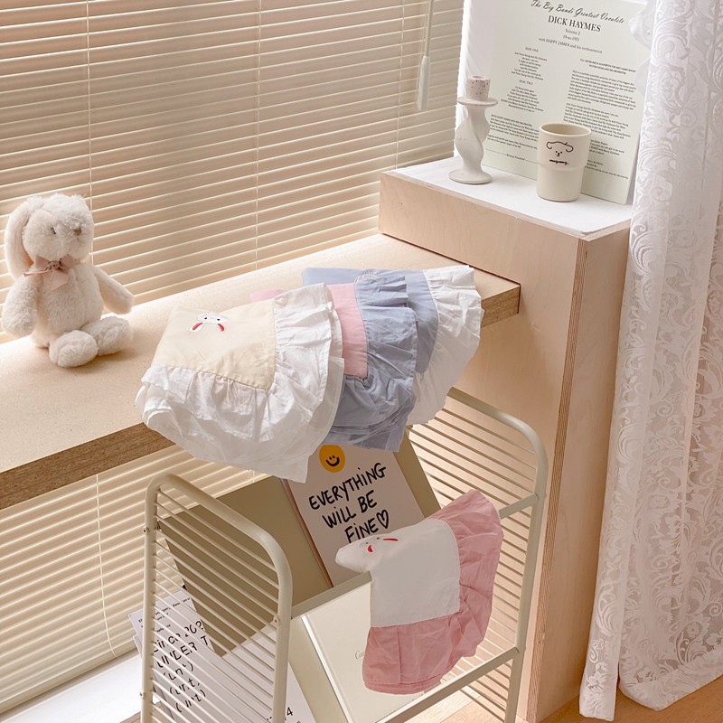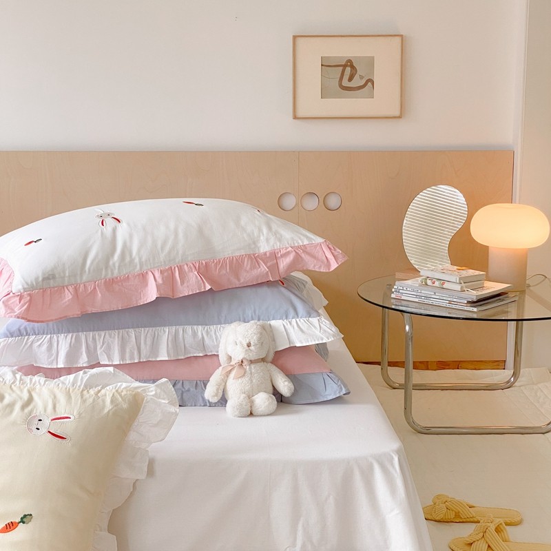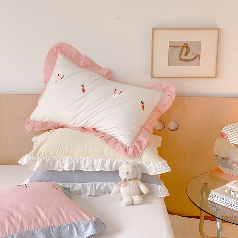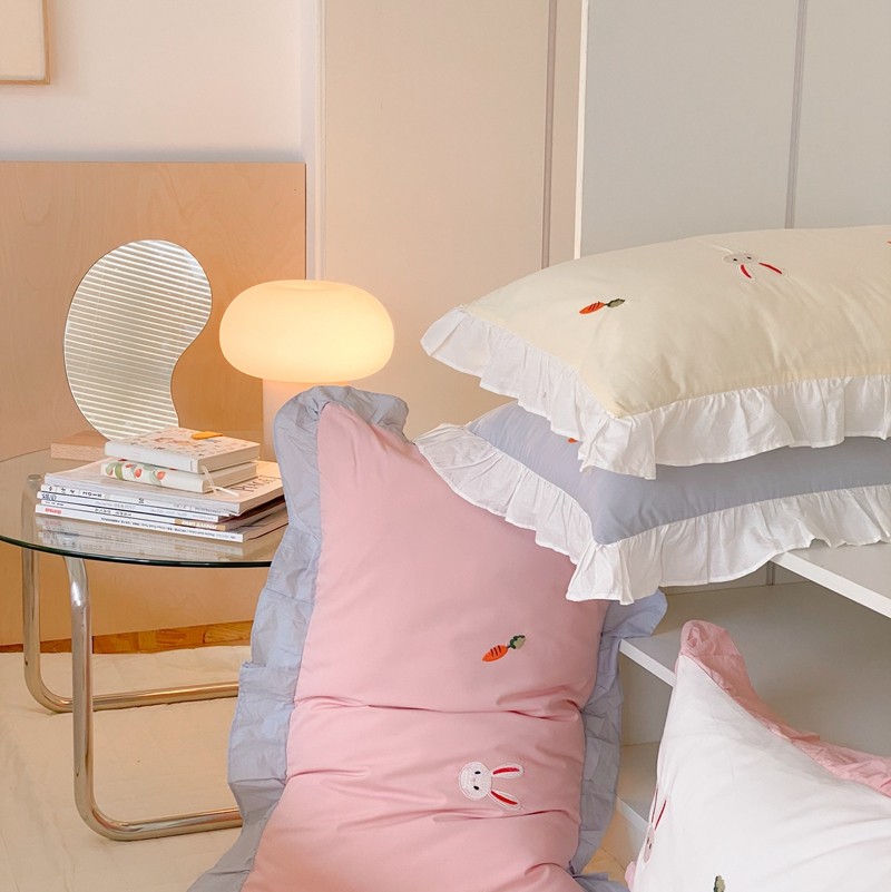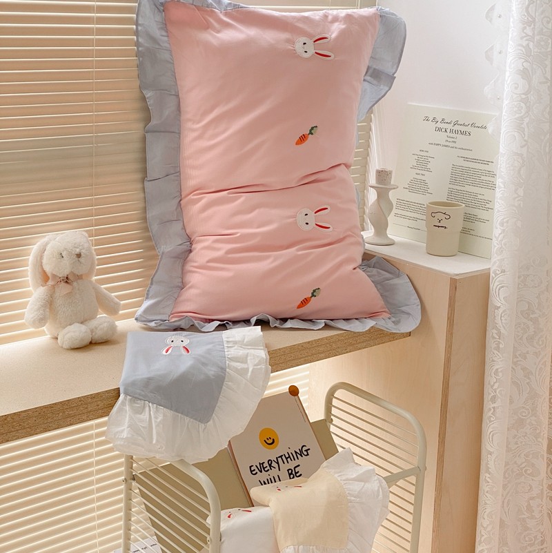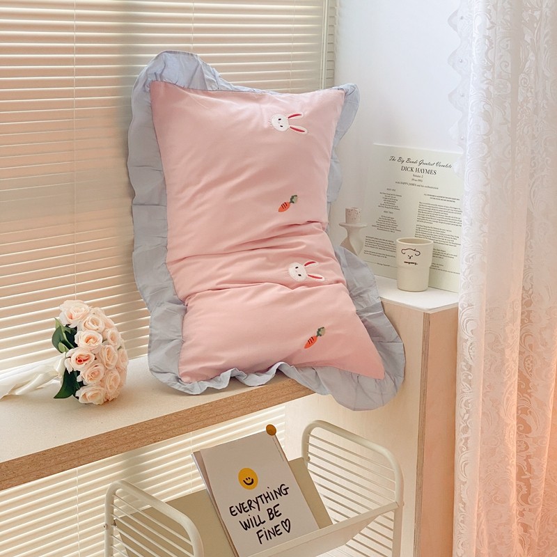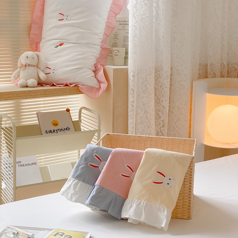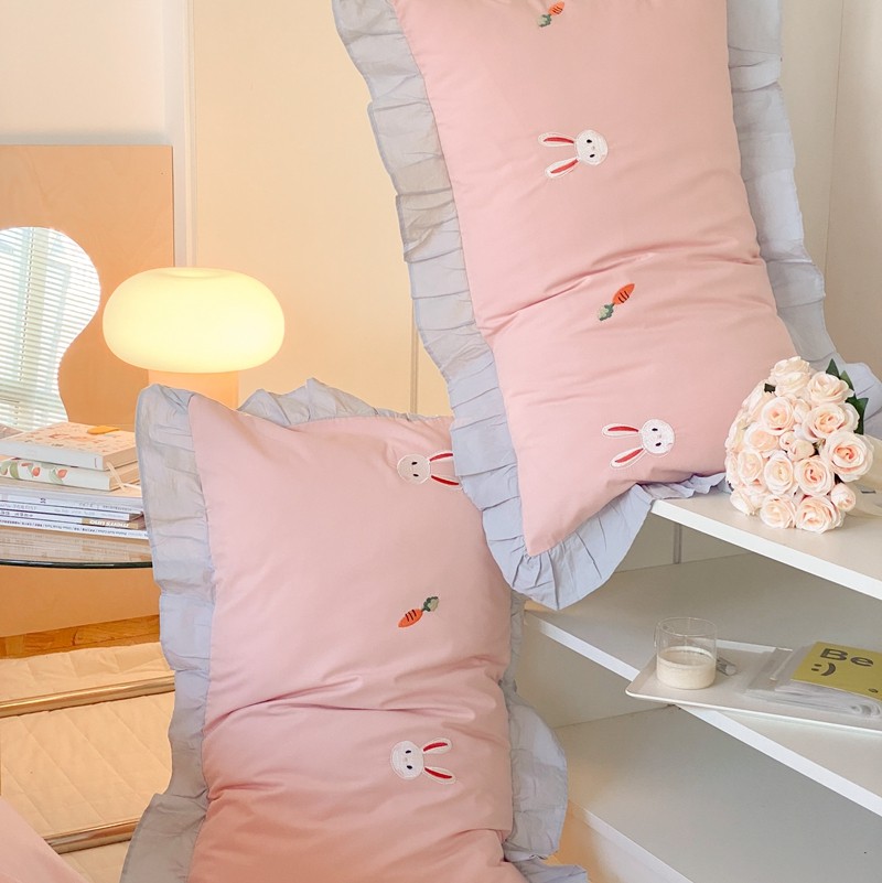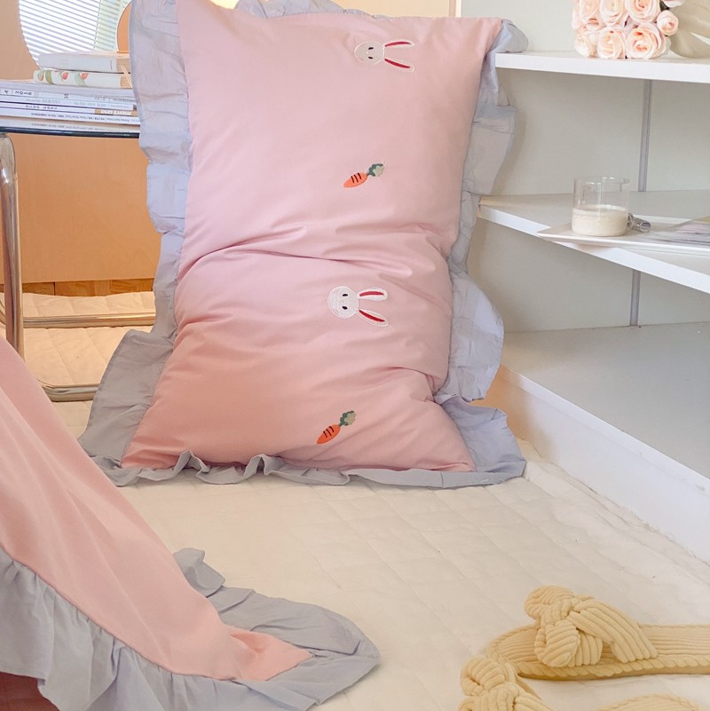 本希新款40全棉水洗棉荷叶边刺绣小清新四件套 幸运兔淡雅粉