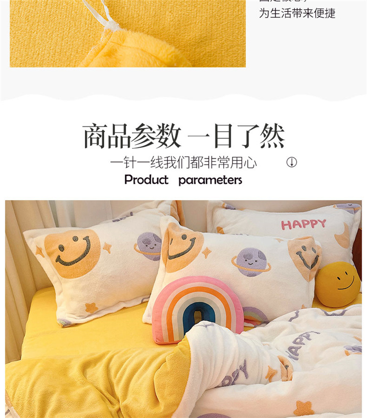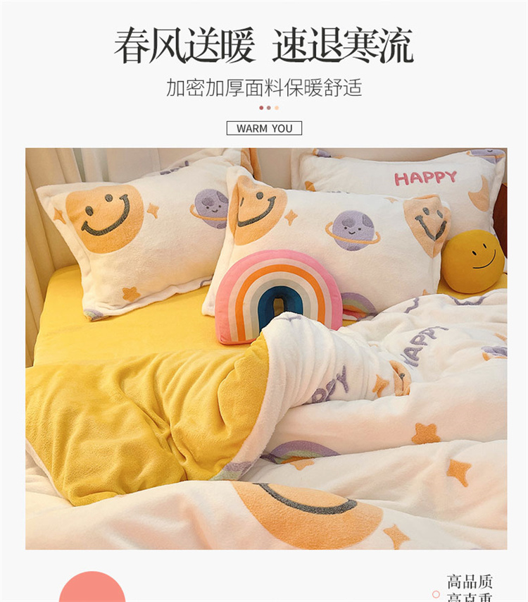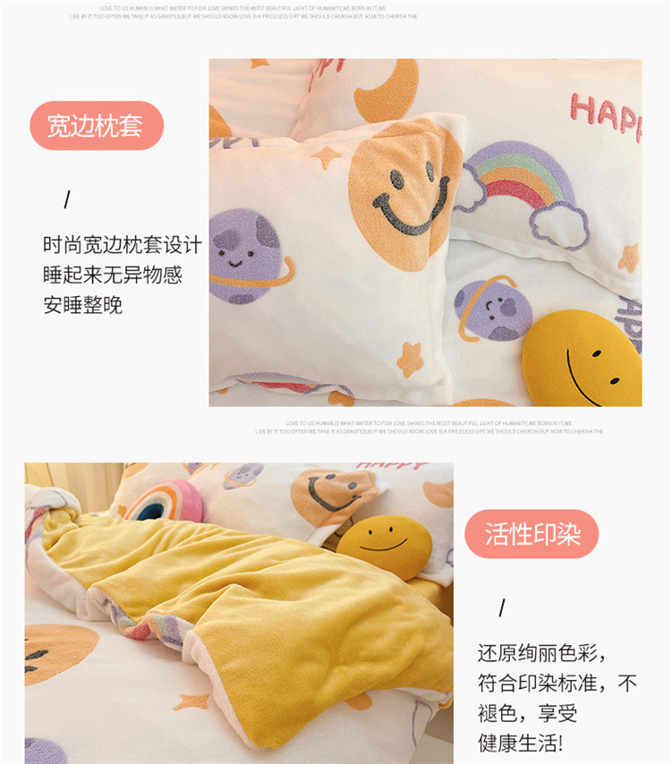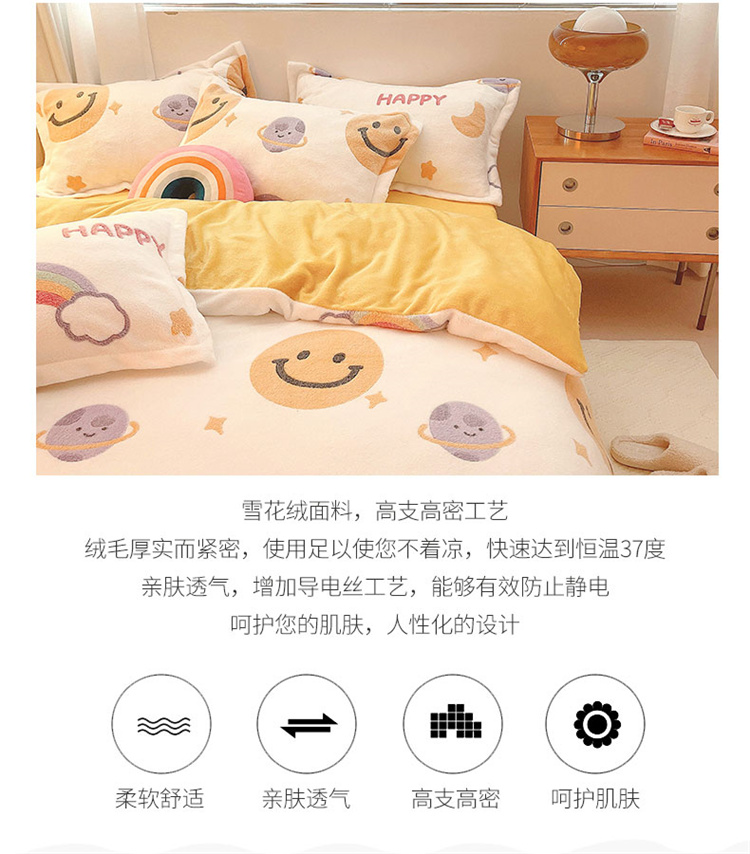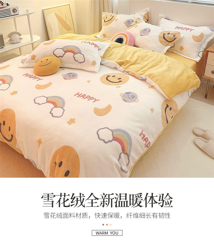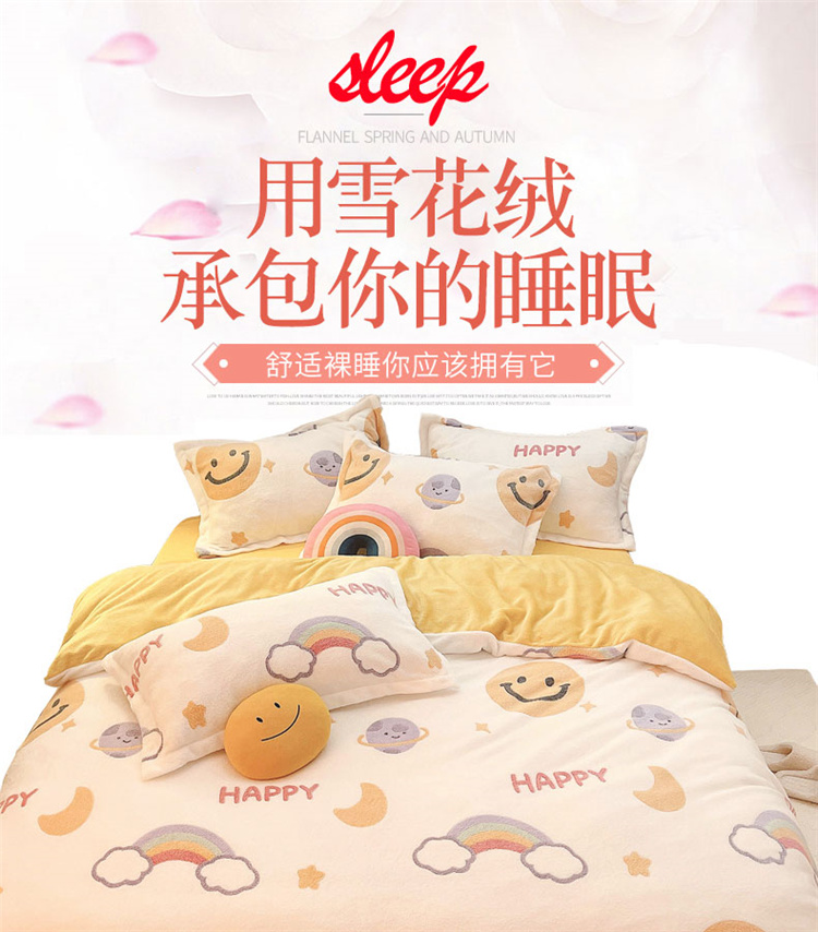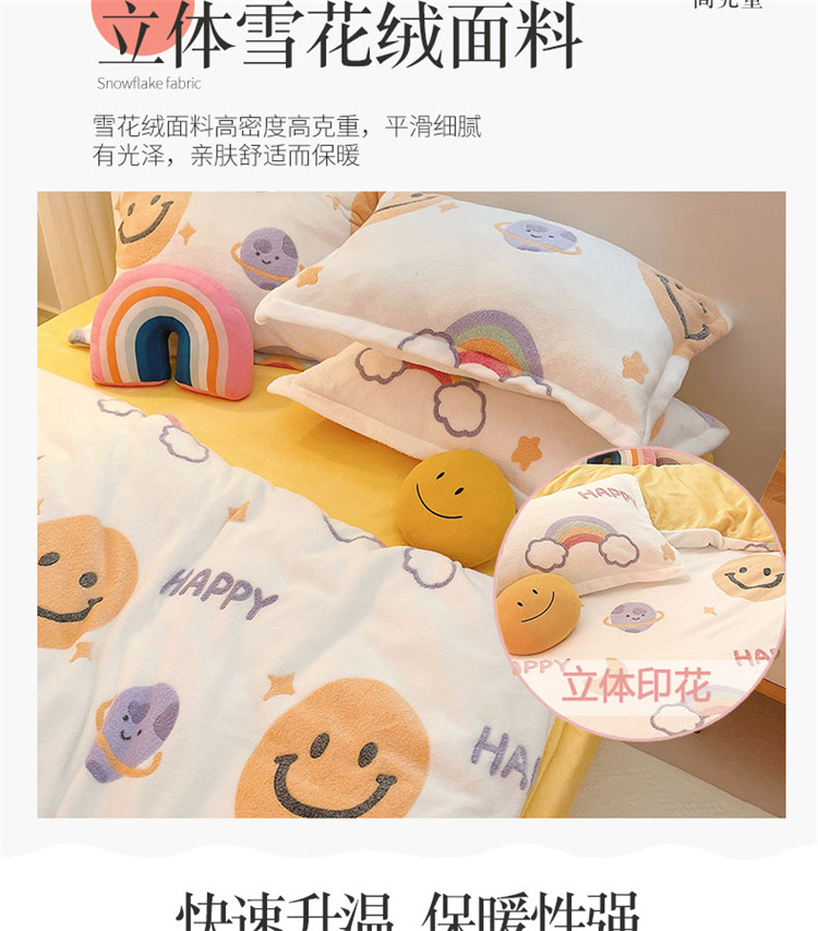 当前位置: 91家纺网 > 商品网购 > 床品套件 > 四件套 > 磨绒四件套 > 川悦生活 2021新款立体雪花绒四件套直播供货 欢乐微笑