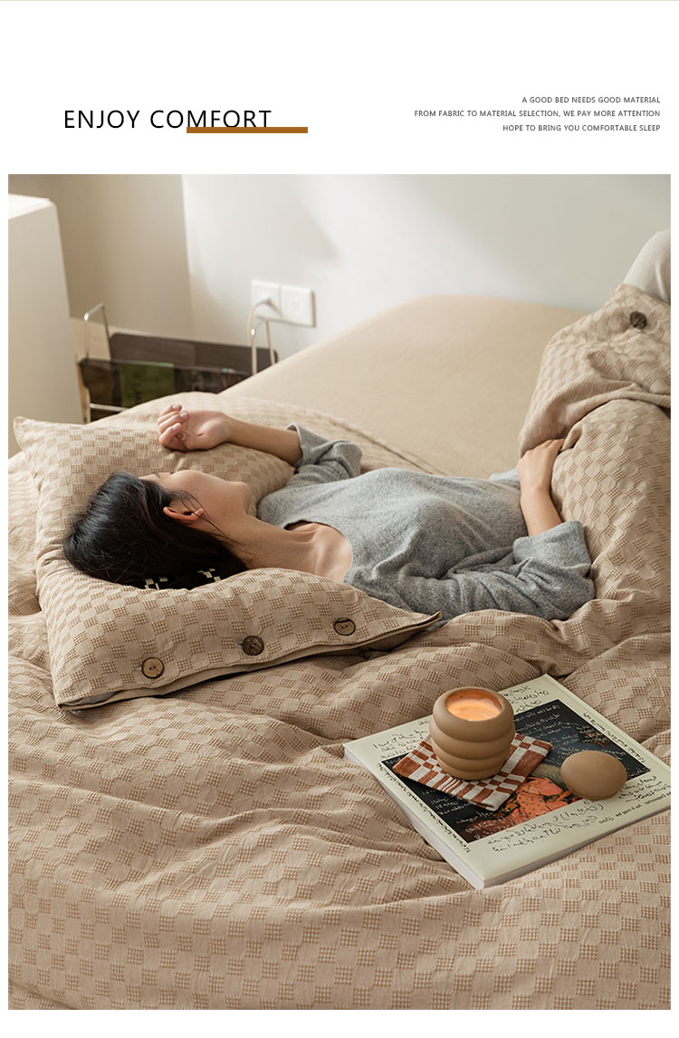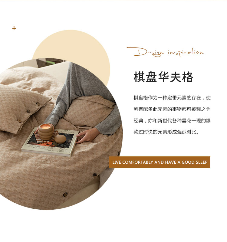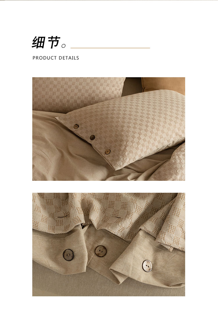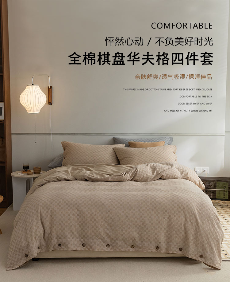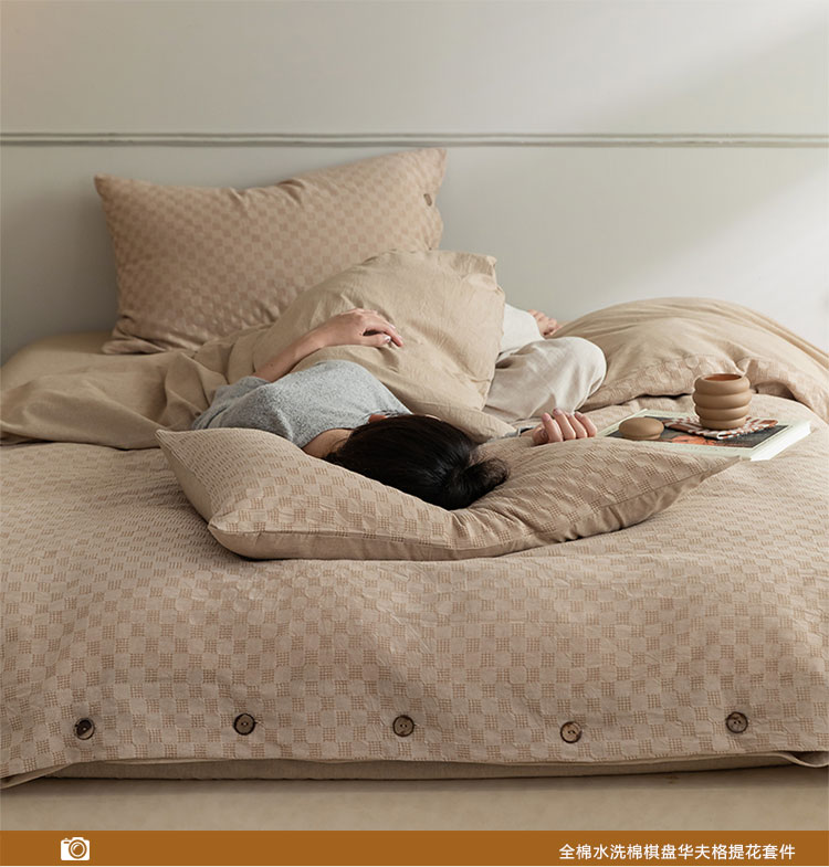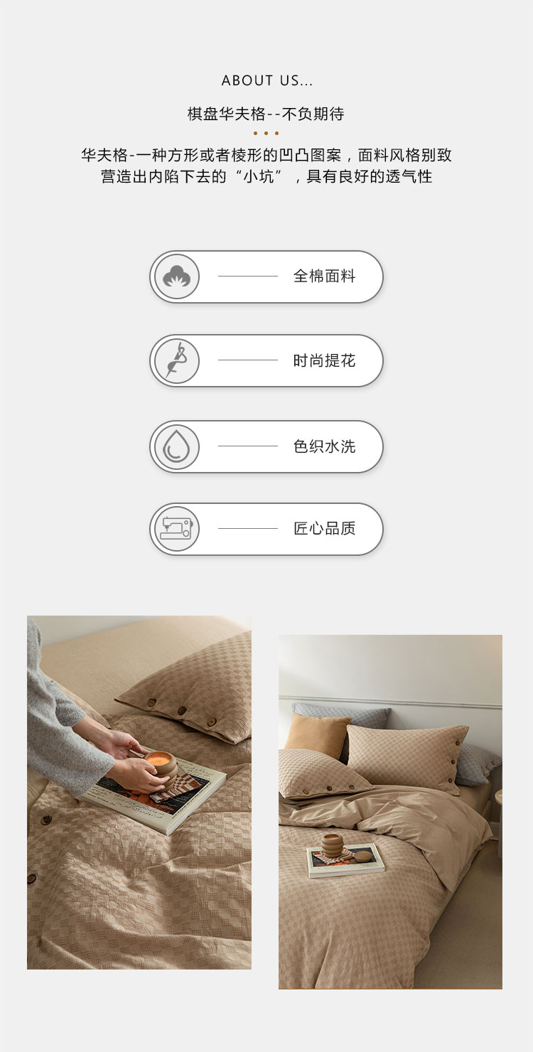 当前位置: 91家纺网 > 商品网购 > 床品套件 > 四件套 > 全棉普通四件套 > 华超针织 2021新款棋盘华夫格四件套 华夫卡其