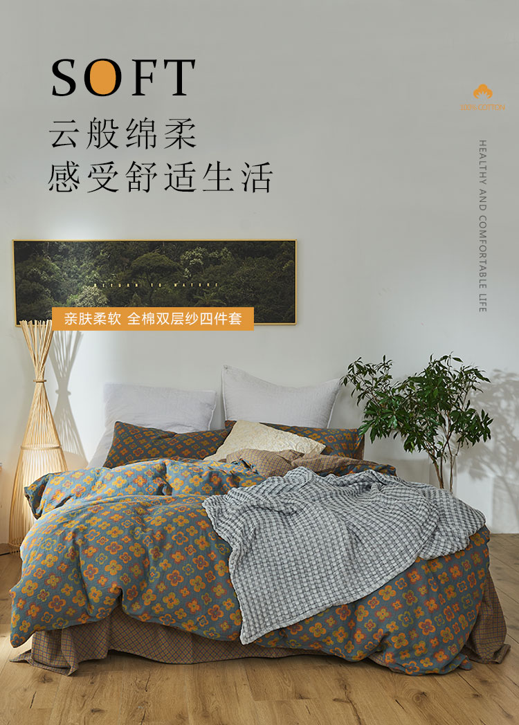 商品名称:2022新款色织提花全棉双层纱四件套 春田花花-蓝