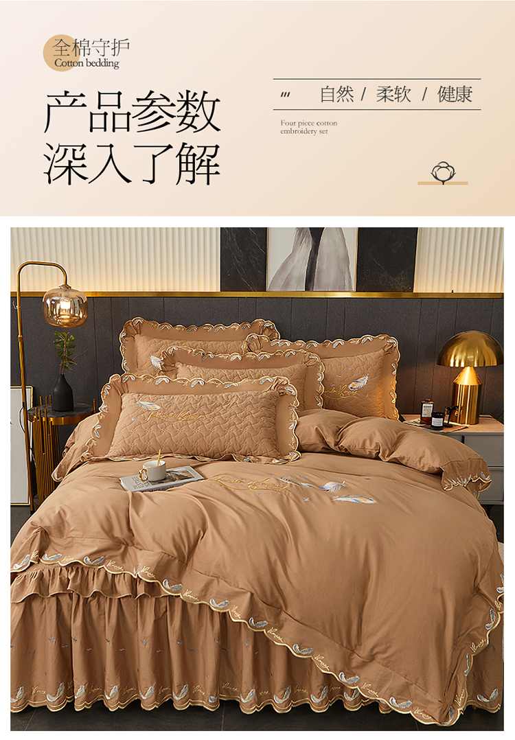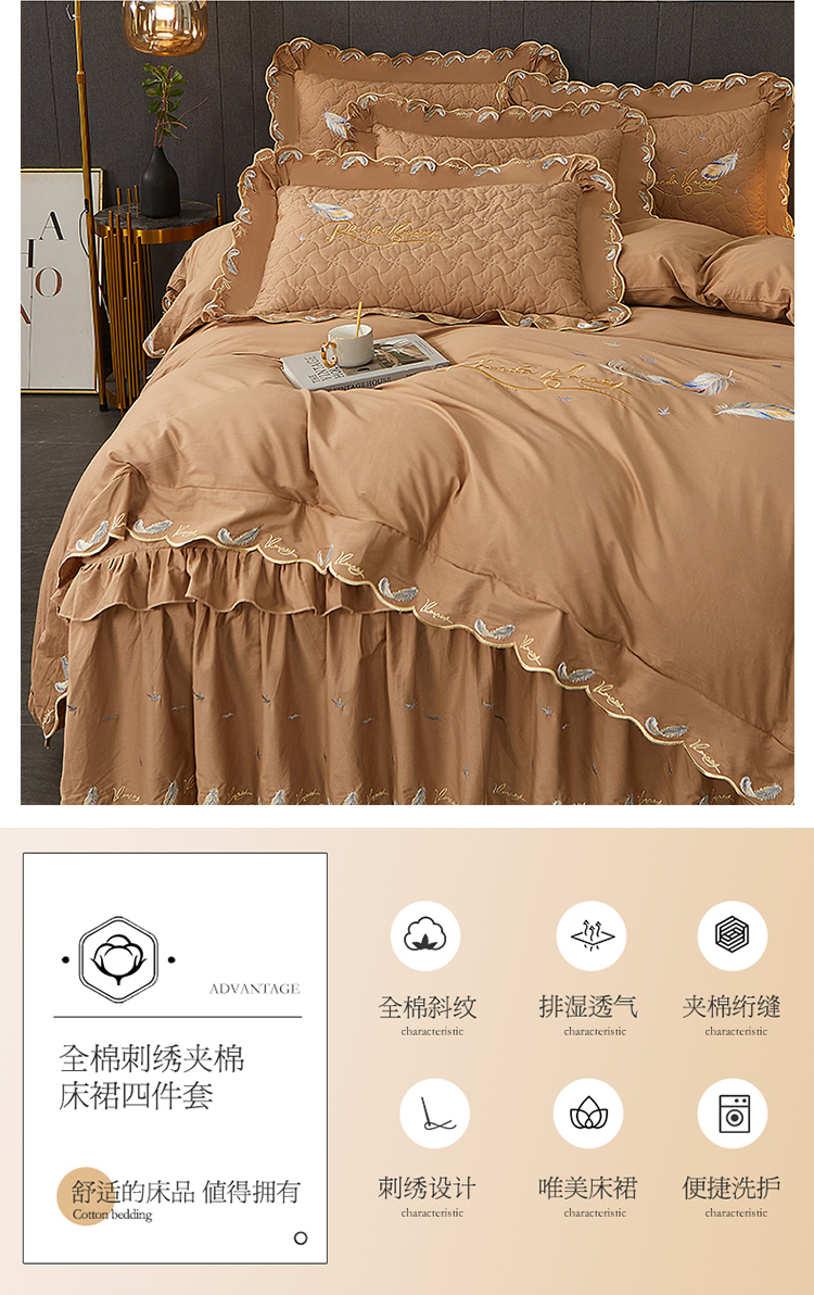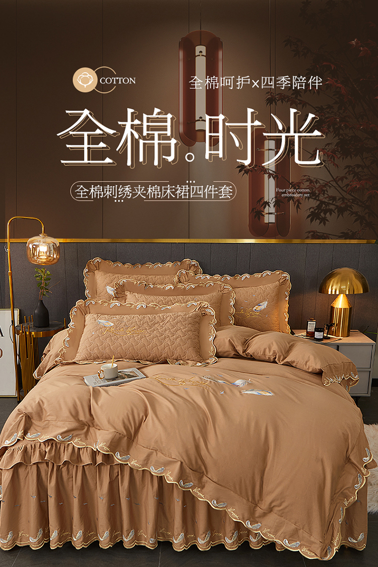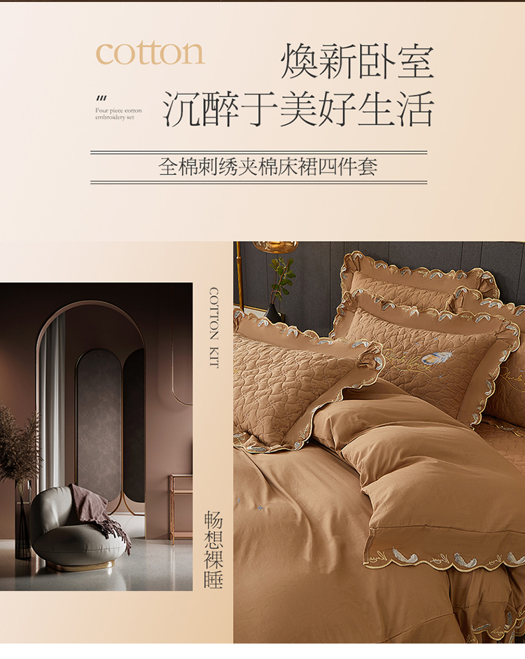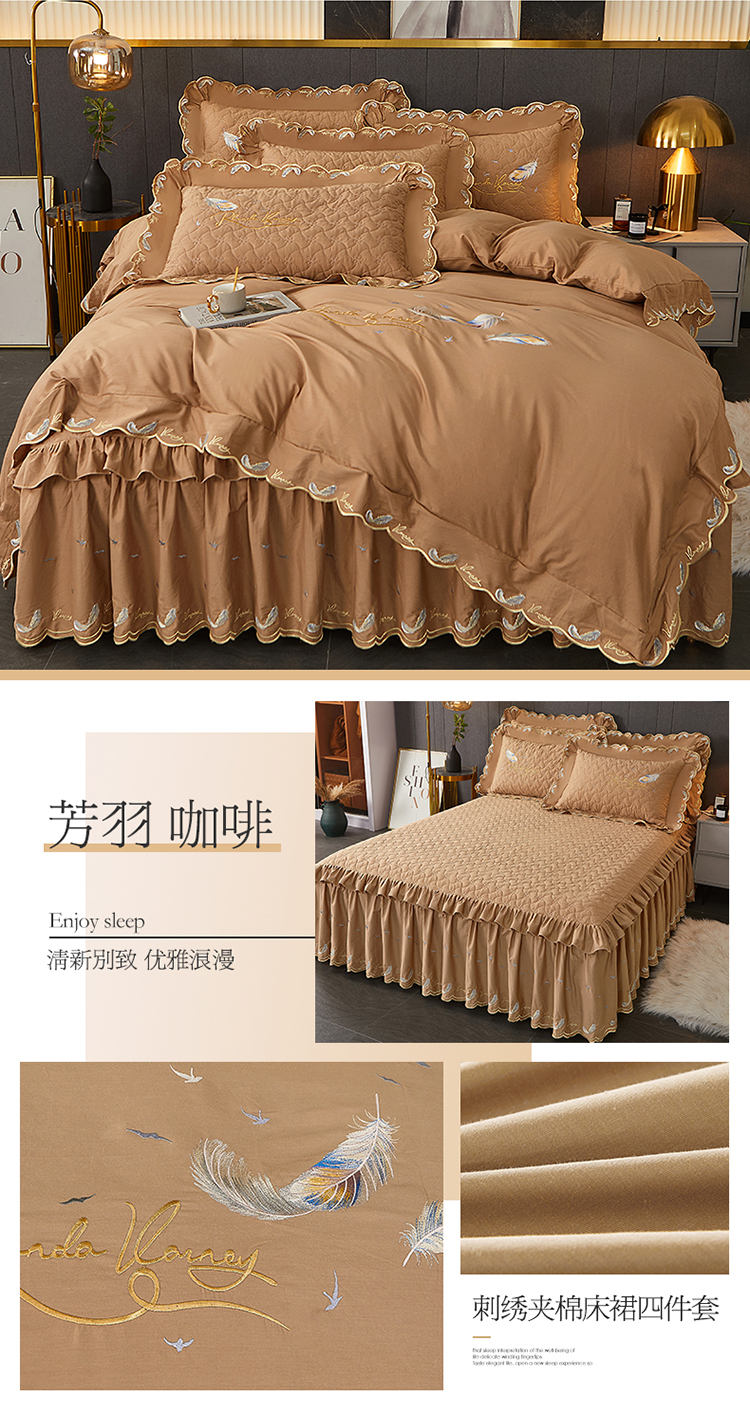 当前位置: 91家纺网 > 商品网购 > 床品套件 > 四件套 > 全棉普通四件套 > 宜凡 2022新款全棉刺绣夹棉床裙款四件套-芳羽 芳羽咖啡