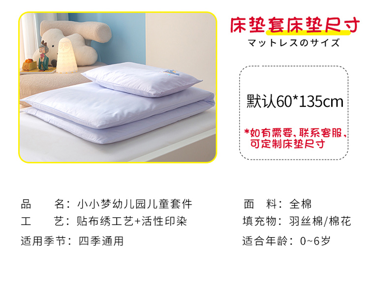 被子120*150,床垫60*135,枕头30*50