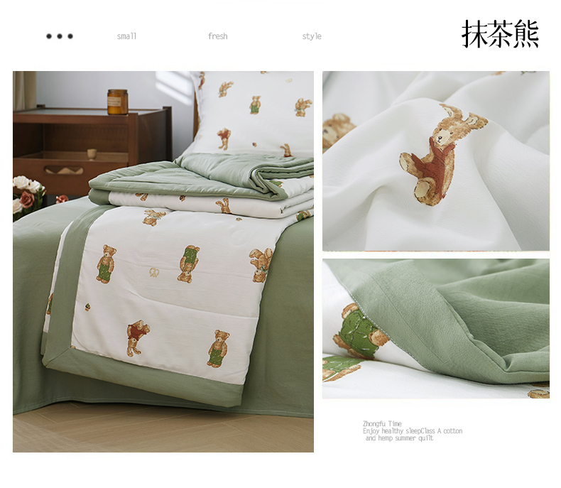 商品名称:33家纺 2023新款A类水洗棉麻双层纱印花大豆被夏被四件套风格二 抹茶熊