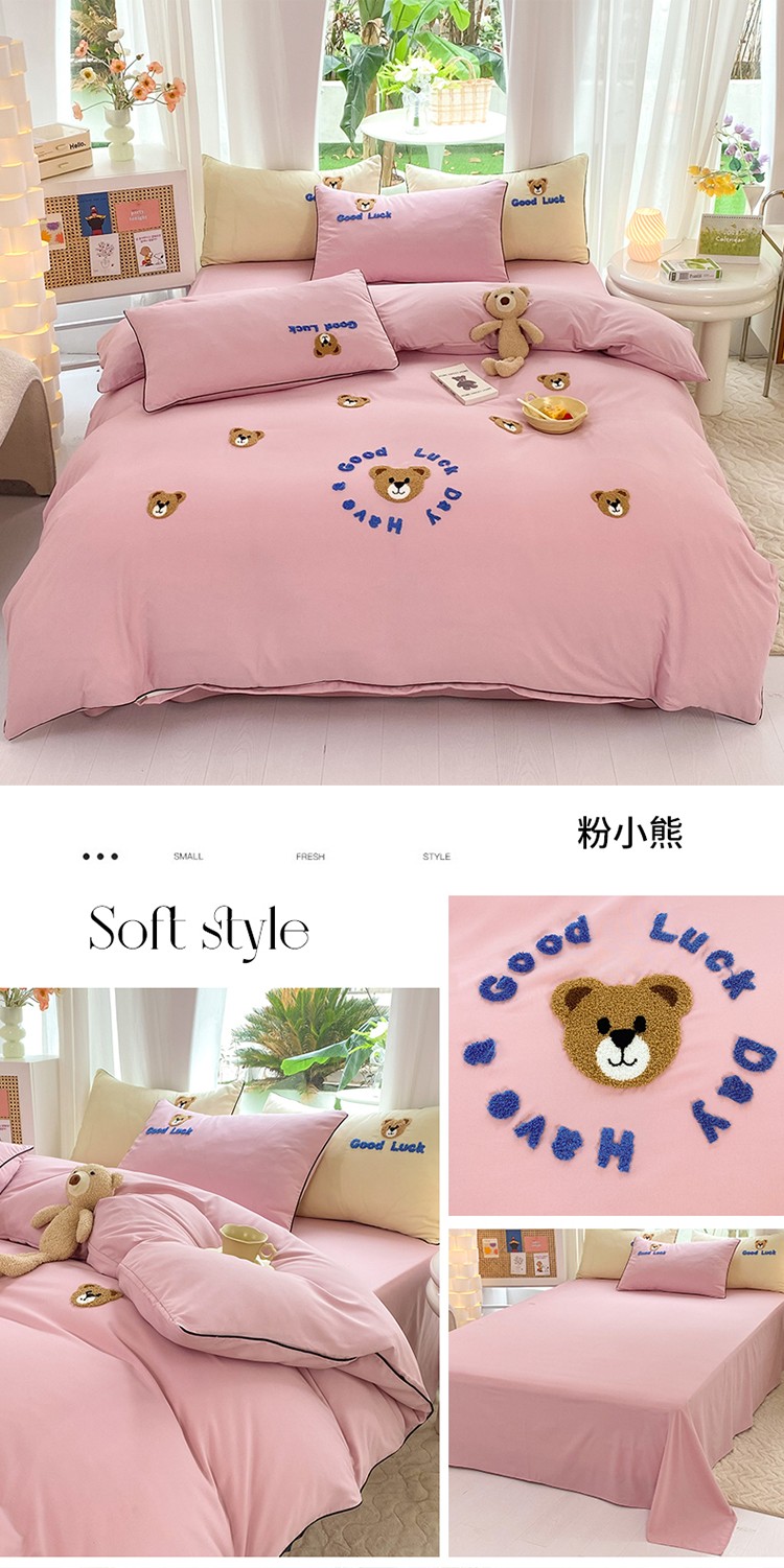 当前位置: 91家纺网 > 商品网购 > 床品套件 > 四件套 > 磨毛活性四件套 > 小主驾到 2023新款小熊毛巾绣水洗棉四件套 粉小熊