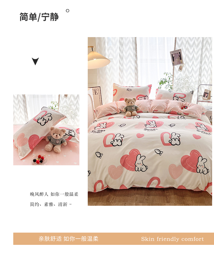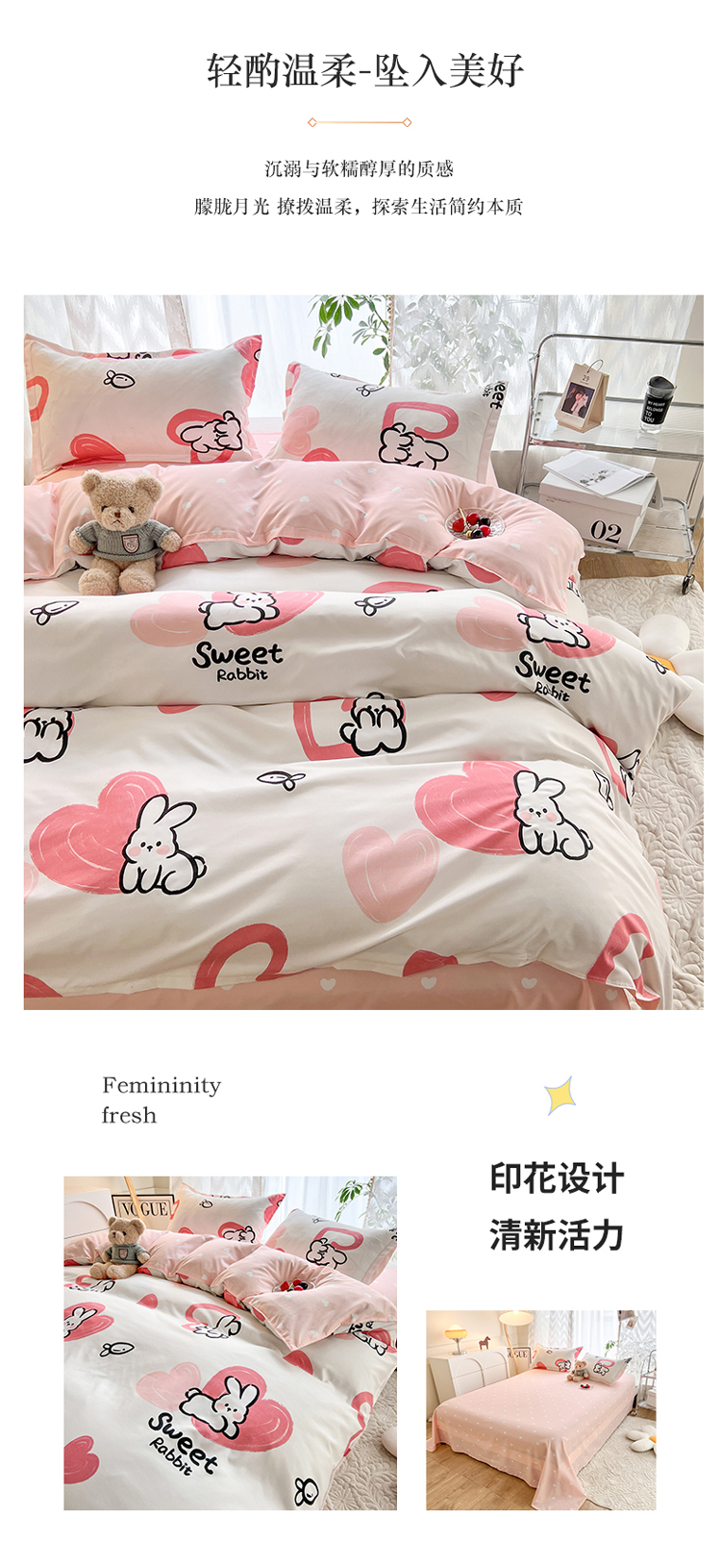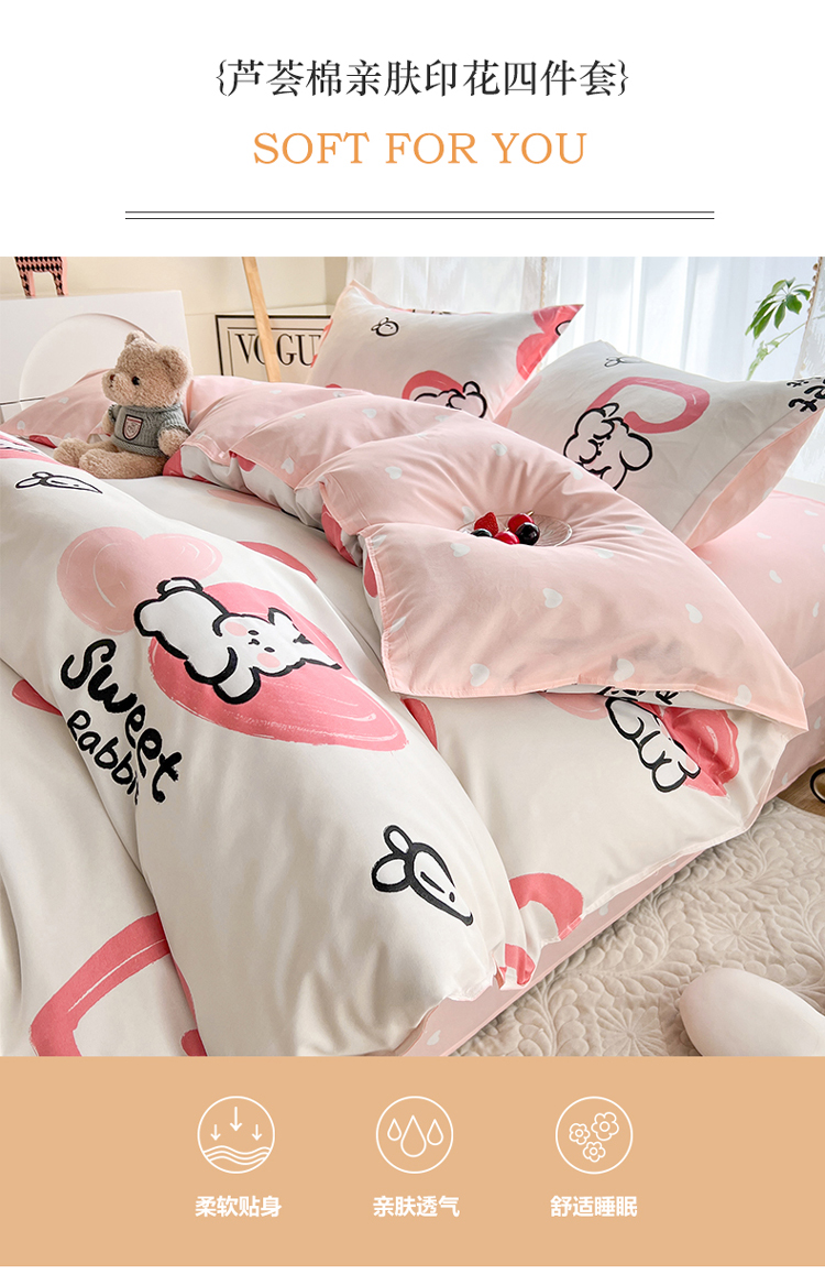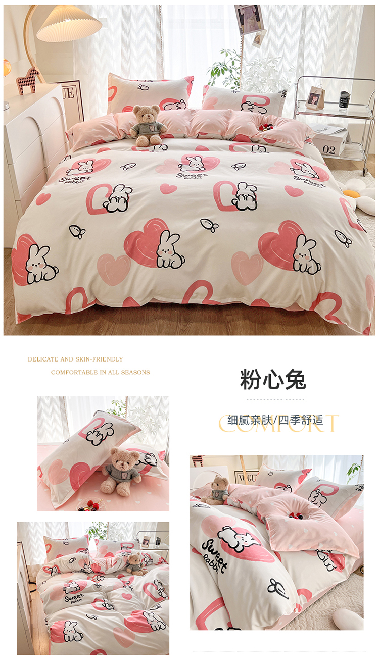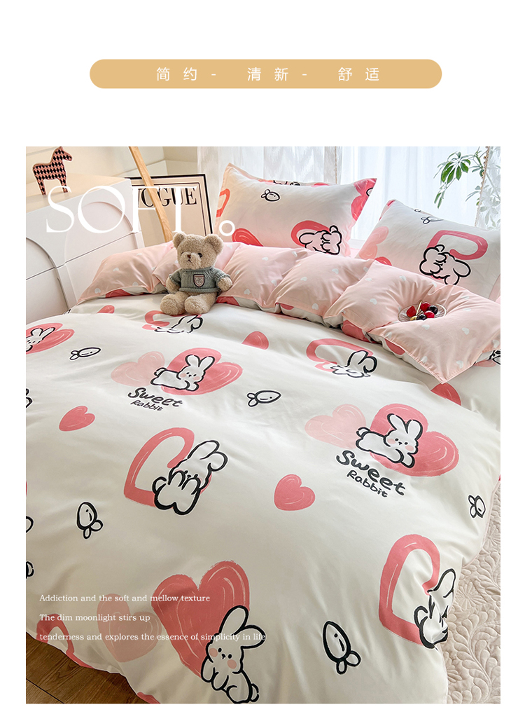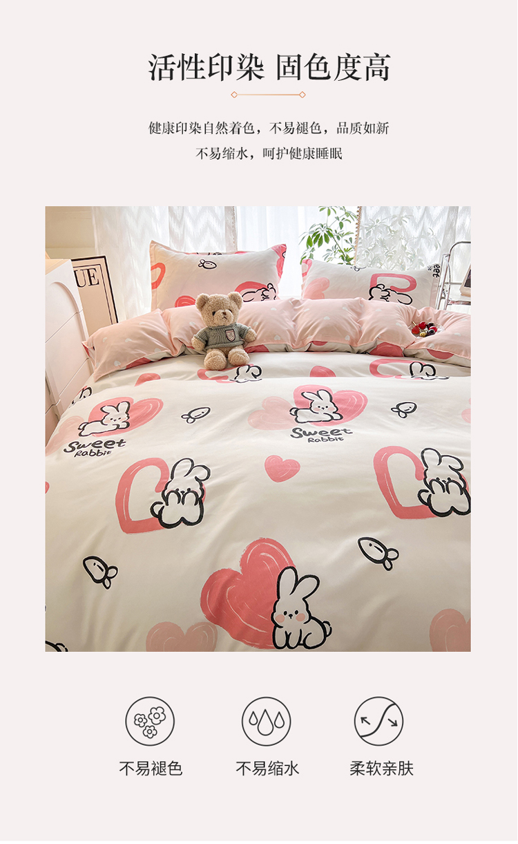 宏源家纺 2023年4月新款芦荟棉亲肤印花四件套 粉心兔