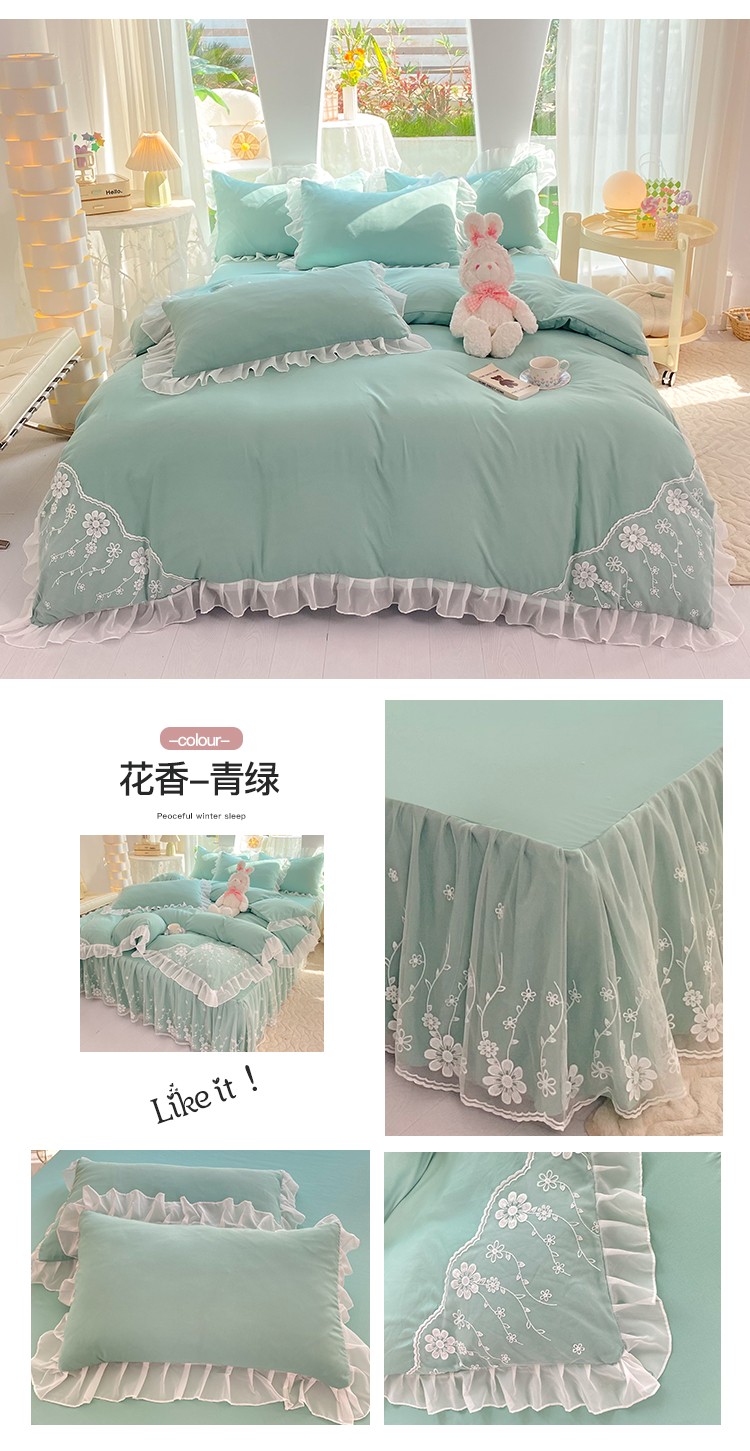 商品名称:唐人居 2025新款水洗棉麻花边款花香系列四件套 花香-青绿