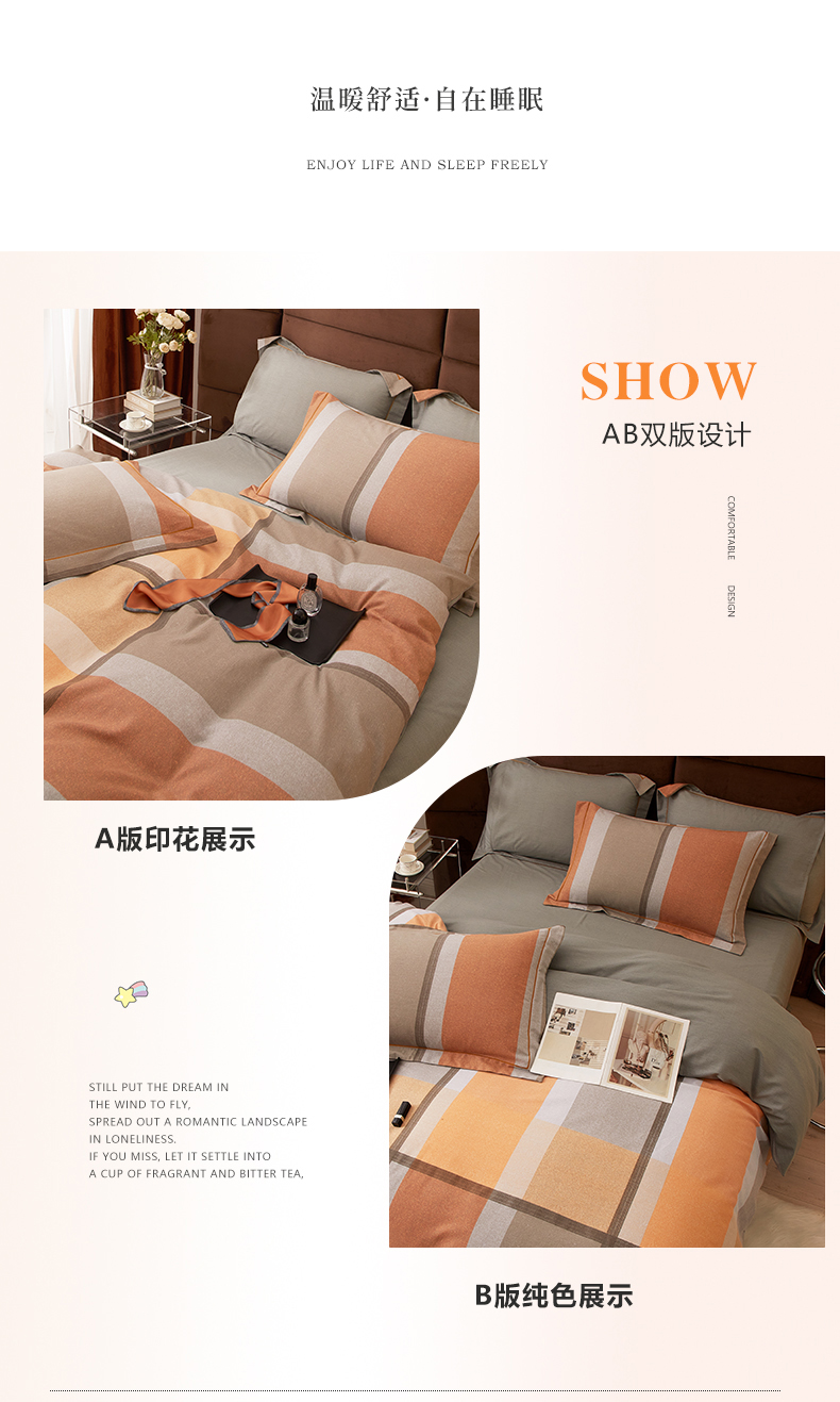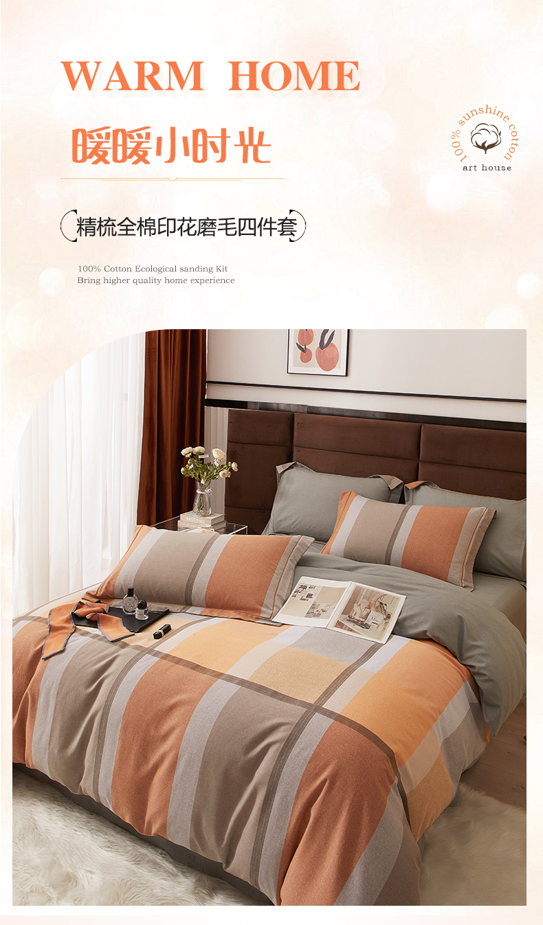 启航家居 2025直播热款全棉精梳磨毛印花四件套-小资格调系列 灰色情调桔