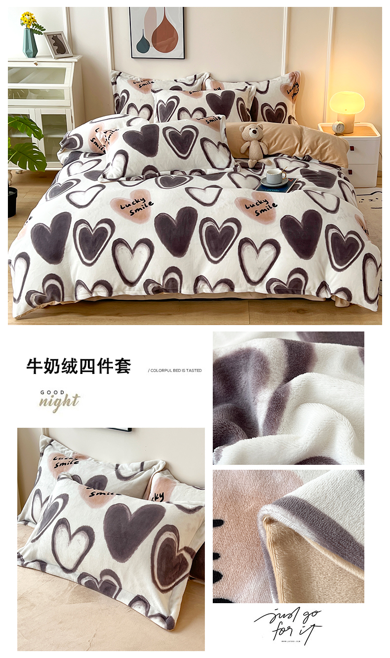 富之航家纺 2023新款牛奶绒印花四件套 心心相印-棕