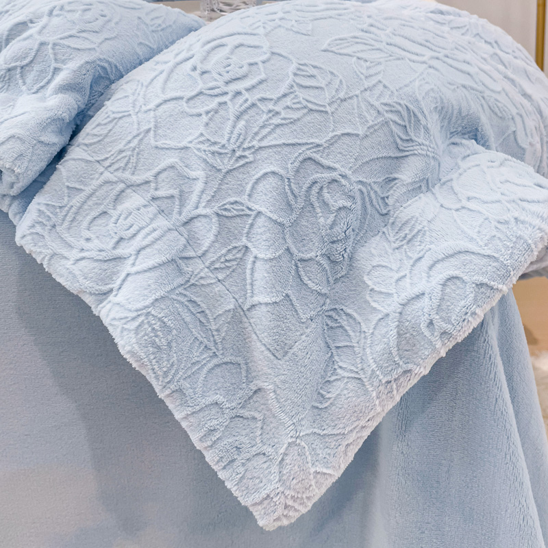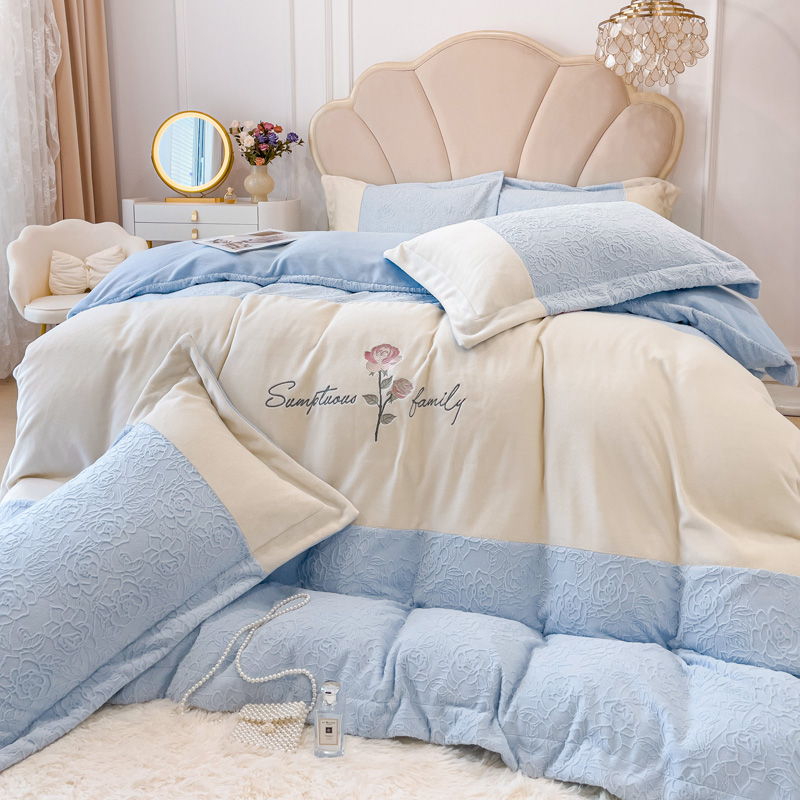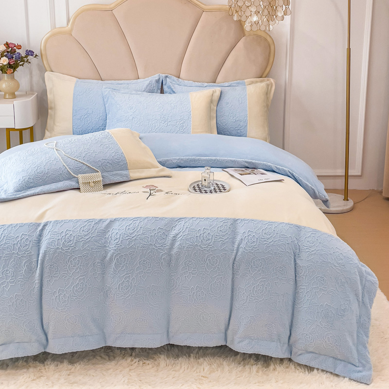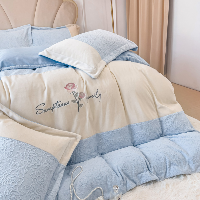 宜家坊 2023新款A类牛奶绒雕花拼接刺绣款四件套-假日玫瑰 迷雾蓝
