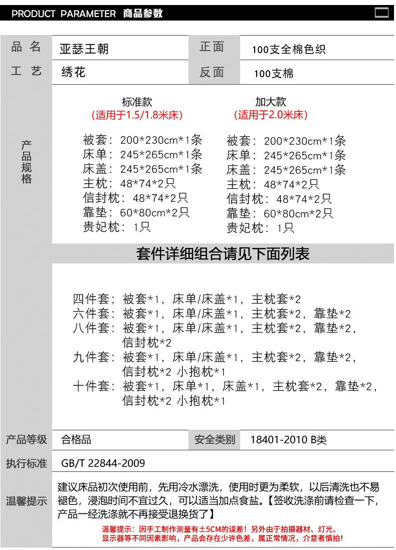 [{"sp_id":11,"sp_name":"\u989c\u8272\u5206\u7c7b","sp_format":2,"sp_list":[{"sp_value_id":675,"sp_value_name":"\u4e9a\u745f\u738b\u671d","sp_value_image":{"id":999,"path":"https:\/\/img3.91jf.com\/ghelp\/2023\/20230901\/e1205459-e4ab-4dc0-aeed-eafdf21af83d20230901140014431.jpg_30_30.jpg"},"sp_value_video":{"id":0,"img":"","path":"","time":0,"download_num":0,"play_num":0},"price":"999.00","storage":1200,"weight":"2.800","is_check_weight":0,"plus_price":"","sp_sort":192207658}]},{"sp_id":10,"sp_name":"\u9002\u7528\u5e8a\u5c3a\u5bf8","sp_format":1,"sp_list":[{"sp_value_id":788,"sp_value_name":"1.5m\u5e8a\u5355\u6b3e\u56db\u4ef6\u5957","sp_value_image":{"id":0,"path":""},"sp_value_video":{"id":0,"img":"","path":"","time":0,"download_num":0,"play_num":0},"price":"999.00","storage":100,"weight":"2.800","is_check_weight":0,"plus_price":"","sp_sort":192207658},{"sp_value_id":795,"sp_value_name":"1.8m\u5e8a\u5355\u6b3e\u56db\u4ef6\u5957","sp_value_image":{"id":0,"path":""},"sp_value_video":{"id":0,"img":"","path":"","time":0,"download_num":0,"play_num":0},"price":"999.00","storage":100,"weight":"2.800","is_check_weight":0,"plus_price":"","sp_sort":192207659},{"sp_value_id":797,"sp_value_name":"2.0m\u5e8a\u5355\u6b3e\u56db\u4ef6\u5957","sp_value_image":{"id":0,"path":""},"sp_value_video":{"id":0,"img":"","path":"","time":0,"download_num":0,"play_num":0},"price":"999.00","storage":100,"weight":"2.900","is_check_weight":0,"plus_price":"","sp_sort":192207660},{"sp_value_id":814,"sp_value_name":"1.5m\u5e8a\u5355\u6b3e\u516d\u4ef6\u5957","sp_value_image":{"id":0,"path":""},"sp_value_video":{"id":0,"img":"","path":"","time":0,"download_num":0,"play_num":0},"price":"999.00","storage":100,"weight":"2.900","is_check_weight":0,"plus_price":"","sp_sort":192207661},{"sp_value_id":819,"sp_value_name":"1.8m\u5e8a\u5355\u6b3e\u516d\u4ef6\u5957","sp_value_image":{"id":0,"path":""},"sp_value_video":{"id":0,"img":"","path":"","time":0,"download_num":0,"play_num":0},"price":"999.00","storage":100,"weight":"2.900","is_check_weight":0,"plus_price":"","sp_sort":192207662},{"sp_value_id":820,"sp_value_name":"2.0m\u5e8a\u5355\u6b3e\u516d\u4ef6\u5957","sp_value_image":{"id":0,"path":""},"sp_value_video":{"id":0,"img":"","path":"","time":0,"download_num":0,"play_num":0},"price":"999.00","storage":100,"weight":"3.000","is_check_weight":0,"plus_price":"","sp_sort":192207663},{"sp_value_id":826,"sp_value_name":"1.5m\u5e8a\u5355\u6b3e\u516b\u4ef6\u5957","sp_value_image":{"id":0,"path":""},"sp_value_video":{"id":0,"img":"","path":"","time":0,"download_num":0,"play_num":0},"price":"999.00","storage":100,"weight":"3.200","is_check_weight":0,"plus_price":"","sp_sort":192207664},{"sp_value_id":867,"sp_value_name":"1.8m\u5e8a\u5355\u6b3e\u516b\u4ef6\u5957","sp_value_image":{"id":0,"path":""},"sp_value_video":{"id":0,"img":"","path":"","time":0,"download_num":0,"play_num":0},"price":"999.00","storage":100,"weight":"3.200","is_check_weight":0,"plus_price":"","sp_sort":192207665},{"sp_value_id":931,"sp_value_name":"2.0m\u5e8a\u5355\u6b3e\u516b\u4ef6\u5957","sp_value_image":{"id":0,"path":""},"sp_value_video":{"id":0,"img":"","path":"","time":0,"download_num":0,"play_num":0},"price":"999.00","storage":100,"weight":"3.400","is_check_weight":0,"plus_price":"","sp_sort":192207666},{"sp_value_id":933,"sp_value_name":"1.5m\u5e8a\u5355\u6b3e\u5341\u4ef6\u5957","sp_value_image":{"id":0,"path":""},"sp_value_video":{"id":0,"img":"","path":"","time":0,"download_num":0,"play_num":0},"price":"999.00","storage":100,"weight":"4.200","is_check_weight":0,"plus_price":"","sp_sort":192207667},{"sp_value_id":934,"sp_value_name":"1.8m\u5e8a\u5355\u6b3e\u5341\u4ef6\u5957","sp_value_image":{"id":0,"path":""},"sp_value_video":{"id":0,"img":"","path":"","time":0,"download_num":0,"play_num":0},"price":"999.00","storage":100,"weight":"4.200","is_check_weight":0,"plus_price":"","sp_sort":192207668},{"sp_value_id":935,"sp_value_name":"2.0m\u5e8a\u5355\u6b3e\u5341\u4ef6\u5957","sp_value_image":{"id":0,"path":""},"sp_value_video":{"id":0,"img":"","path":"","time":0,"download_num":0,"play_num":0},"price":"999.00","storage":100,"weight":"4.600","is_check_weight":0,"plus_price":"","sp_sort":192207669}]}]