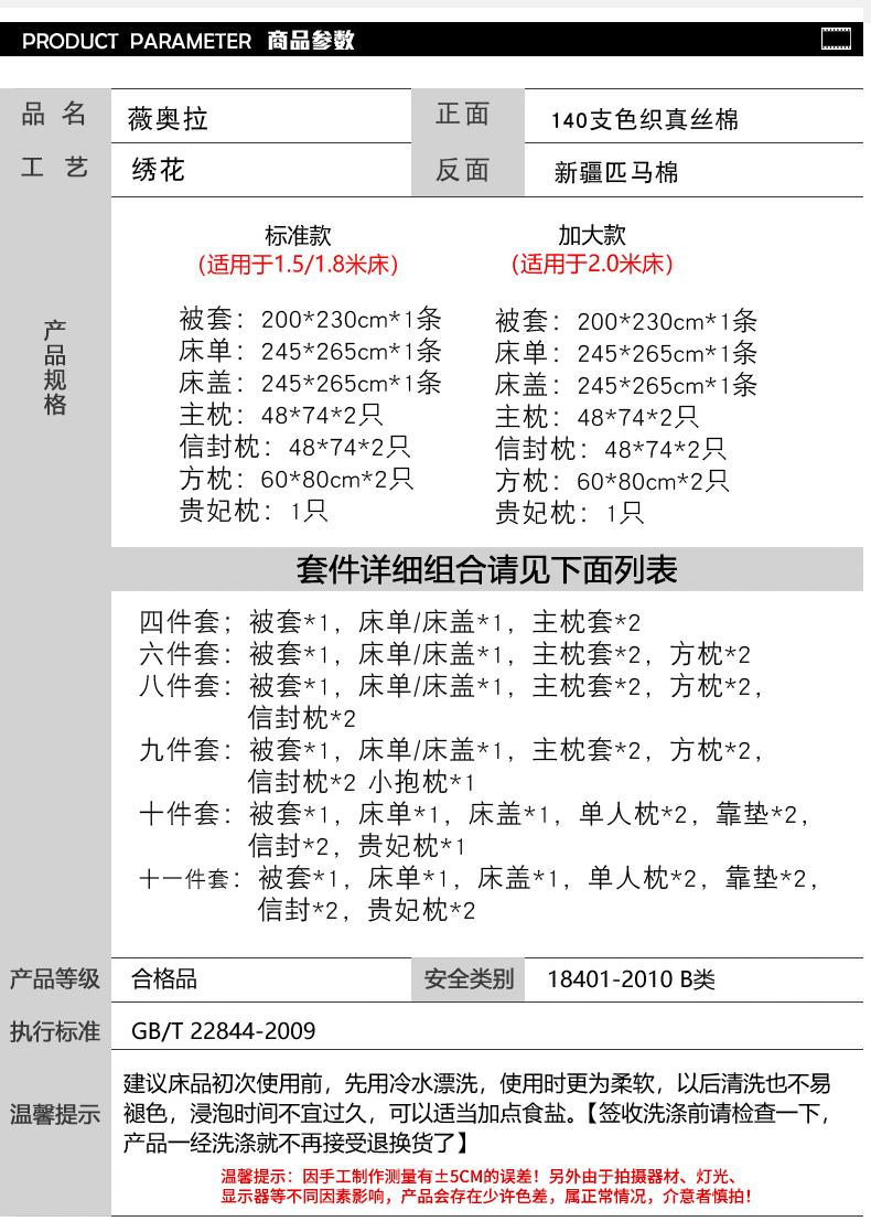 [{"sp_id":11,"sp_name":"\u989c\u8272\u5206\u7c7b","sp_format":2,"sp_list":[{"sp_value_id":1323,"sp_value_name":"\u5965\u8389\u8587","sp_value_image":{"id":999,"path":"https:\/\/img3.91jf.com\/ghelp\/2023\/20230901\/1ffecf9f-581a-4d89-a6ce-56f35e72cf1920230901140105305.jpg_30_30.jpg"},"sp_value_video":{"id":0,"img":"","path":"","time":0,"download_num":0,"play_num":0},"price":"999.00","storage":1200,"weight":"2.800","is_check_weight":0,"plus_price":"","sp_sort":192207221}]},{"sp_id":10,"sp_name":"\u9002\u7528\u5e8a\u5c3a\u5bf8","sp_format":1,"sp_list":[{"sp_value_id":788,"sp_value_name":"1.5m\u5e8a\u5355\u6b3e\u56db\u4ef6\u5957","sp_value_image":{"id":0,"path":""},"sp_value_video":{"id":0,"img":"","path":"","time":0,"download_num":0,"play_num":0},"price":"999.00","storage":100,"weight":"2.800","is_check_weight":0,"plus_price":"","sp_sort":192207221},{"sp_value_id":795,"sp_value_name":"1.8m\u5e8a\u5355\u6b3e\u56db\u4ef6\u5957","sp_value_image":{"id":0,"path":""},"sp_value_video":{"id":0,"img":"","path":"","time":0,"download_num":0,"play_num":0},"price":"999.00","storage":100,"weight":"2.800","is_check_weight":0,"plus_price":"","sp_sort":192207222},{"sp_value_id":797,"sp_value_name":"2.0m\u5e8a\u5355\u6b3e\u56db\u4ef6\u5957","sp_value_image":{"id":0,"path":""},"sp_value_video":{"id":0,"img":"","path":"","time":0,"download_num":0,"play_num":0},"price":"999.00","storage":100,"weight":"2.900","is_check_weight":0,"plus_price":"","sp_sort":192207223},{"sp_value_id":814,"sp_value_name":"1.5m\u5e8a\u5355\u6b3e\u516d\u4ef6\u5957","sp_value_image":{"id":0,"path":""},"sp_value_video":{"id":0,"img":"","path":"","time":0,"download_num":0,"play_num":0},"price":"999.00","storage":100,"weight":"2.900","is_check_weight":0,"plus_price":"","sp_sort":192207224},{"sp_value_id":819,"sp_value_name":"1.8m\u5e8a\u5355\u6b3e\u516d\u4ef6\u5957","sp_value_image":{"id":0,"path":""},"sp_value_video":{"id":0,"img":"","path":"","time":0,"download_num":0,"play_num":0},"price":"999.00","storage":100,"weight":"2.900","is_check_weight":0,"plus_price":"","sp_sort":192207225},{"sp_value_id":820,"sp_value_name":"2.0m\u5e8a\u5355\u6b3e\u516d\u4ef6\u5957","sp_value_image":{"id":0,"path":""},"sp_value_video":{"id":0,"img":"","path":"","time":0,"download_num":0,"play_num":0},"price":"999.00","storage":100,"weight":"3.000","is_check_weight":0,"plus_price":"","sp_sort":192207226},{"sp_value_id":826,"sp_value_name":"1.5m\u5e8a\u5355\u6b3e\u516b\u4ef6\u5957","sp_value_image":{"id":0,"path":""},"sp_value_video":{"id":0,"img":"","path":"","time":0,"download_num":0,"play_num":0},"price":"999.00","storage":100,"weight":"3.200","is_check_weight":0,"plus_price":"","sp_sort":192207227},{"sp_value_id":867,"sp_value_name":"1.8m\u5e8a\u5355\u6b3e\u516b\u4ef6\u5957","sp_value_image":{"id":0,"path":""},"sp_value_video":{"id":0,"img":"","path":"","time":0,"download_num":0,"play_num":0},"price":"999.00","storage":100,"weight":"3.200","is_check_weight":0,"plus_price":"","sp_sort":192207228},{"sp_value_id":931,"sp_value_name":"2.0m\u5e8a\u5355\u6b3e\u516b\u4ef6\u5957","sp_value_image":{"id":0,"path":""},"sp_value_video":{"id":0,"img":"","path":"","time":0,"download_num":0,"play_num":0},"price":"999.00","storage":100,"weight":"3.400","is_check_weight":0,"plus_price":"","sp_sort":192207229},{"sp_value_id":933,"sp_value_name":"1.5m\u5e8a\u5355\u6b3e\u5341\u4ef6\u5957","sp_value_image":{"id":0,"path":""},"sp_value_video":{"id":0,"img":"","path":"","time":0,"download_num":0,"play_num":0},"price":"999.00","storage":100,"weight":"4.200","is_check_weight":0,"plus_price":"","sp_sort":192207230},{"sp_value_id":934,"sp_value_name":"1.8m\u5e8a\u5355\u6b3e\u5341\u4ef6\u5957","sp_value_image":{"id":0,"path":""},"sp_value_video":{"id":0,"img":"","path":"","time":0,"download_num":0,"play_num":0},"price":"999.00","storage":100,"weight":"4.200","is_check_weight":0,"plus_price":"","sp_sort":192207231},{"sp_value_id":935,"sp_value_name":"2.0m\u5e8a\u5355\u6b3e\u5341\u4ef6\u5957","sp_value_image":{"id":0,"path":""},"sp_value_video":{"id":0,"img":"","path":"","time":0,"download_num":0,"play_num":0},"price":"999.00","storage":100,"weight":"4.600","is_check_weight":0,"plus_price":"","sp_sort":192207232}]}]