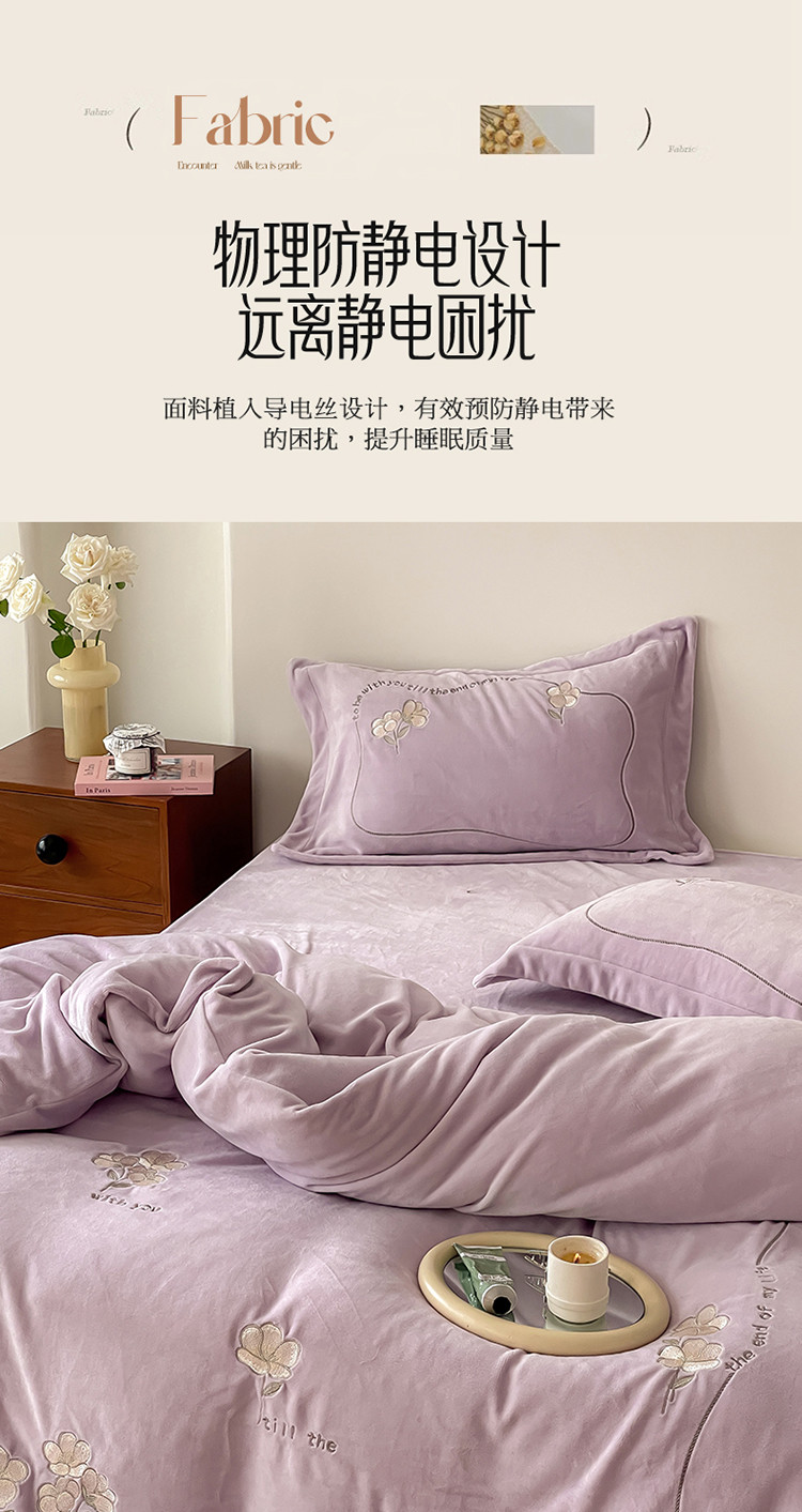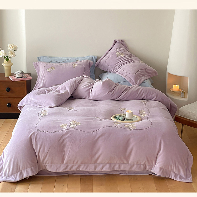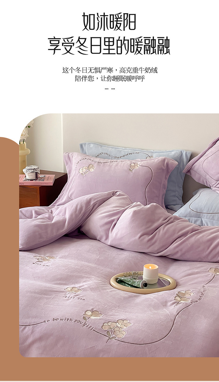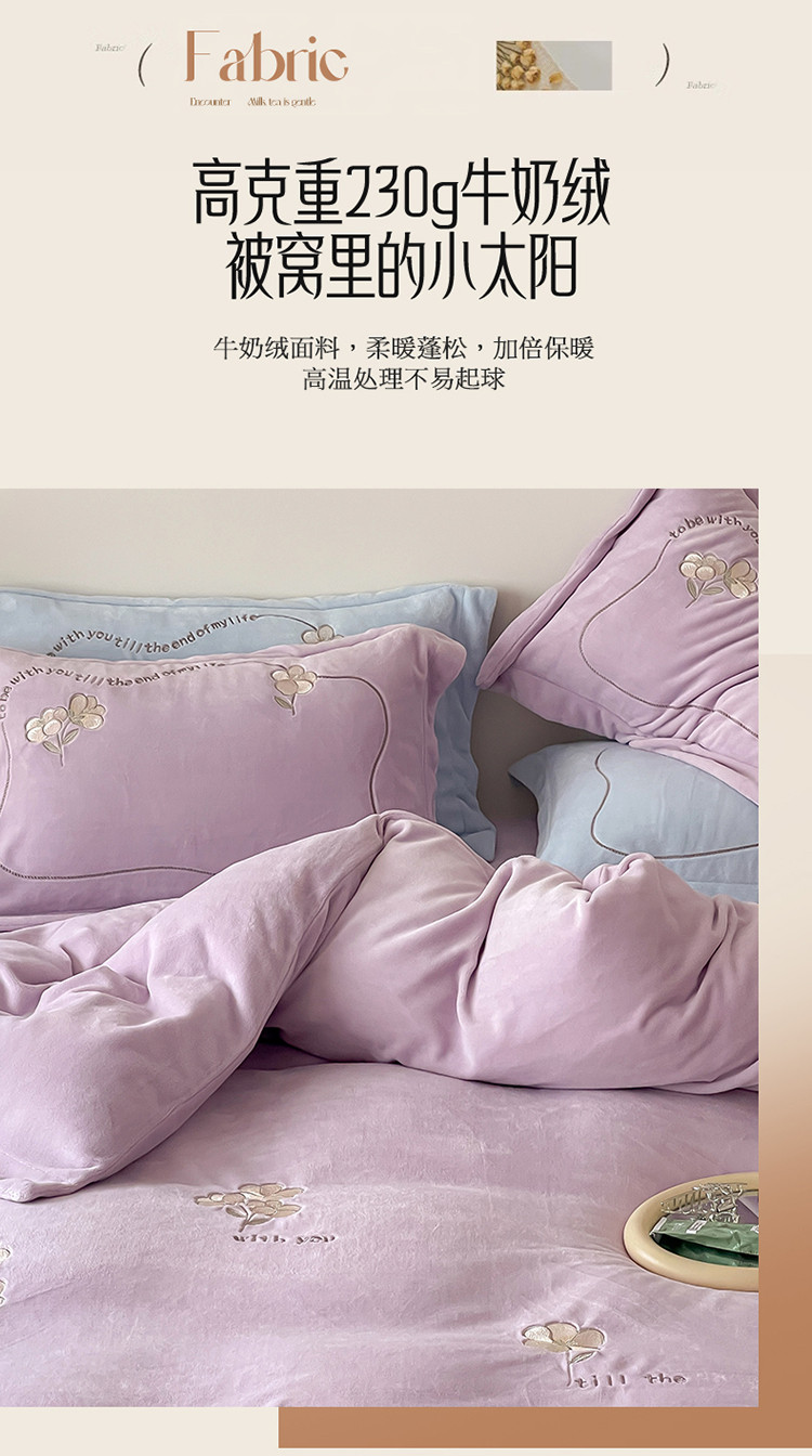 名品优仓 2023新款高克重230克牛奶绒绣花款四件套-小时光 小时光-丁香紫