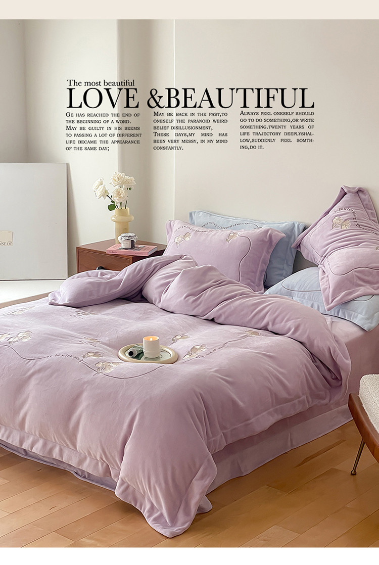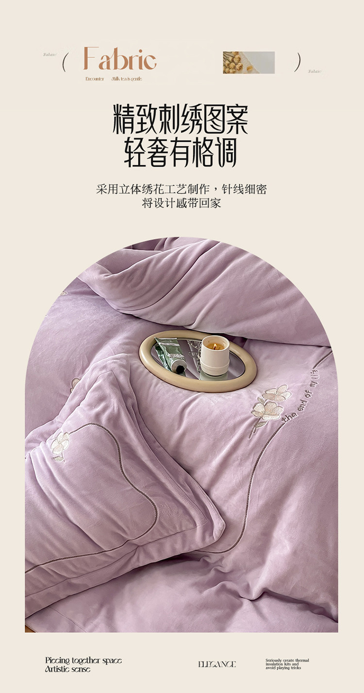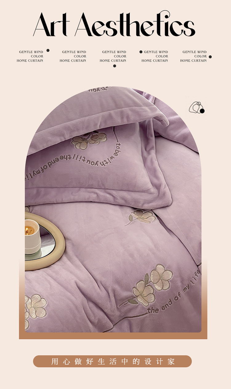 名品优仓 2023新款高克重230克牛奶绒绣花款四件套-小时光 小时光-丁香紫