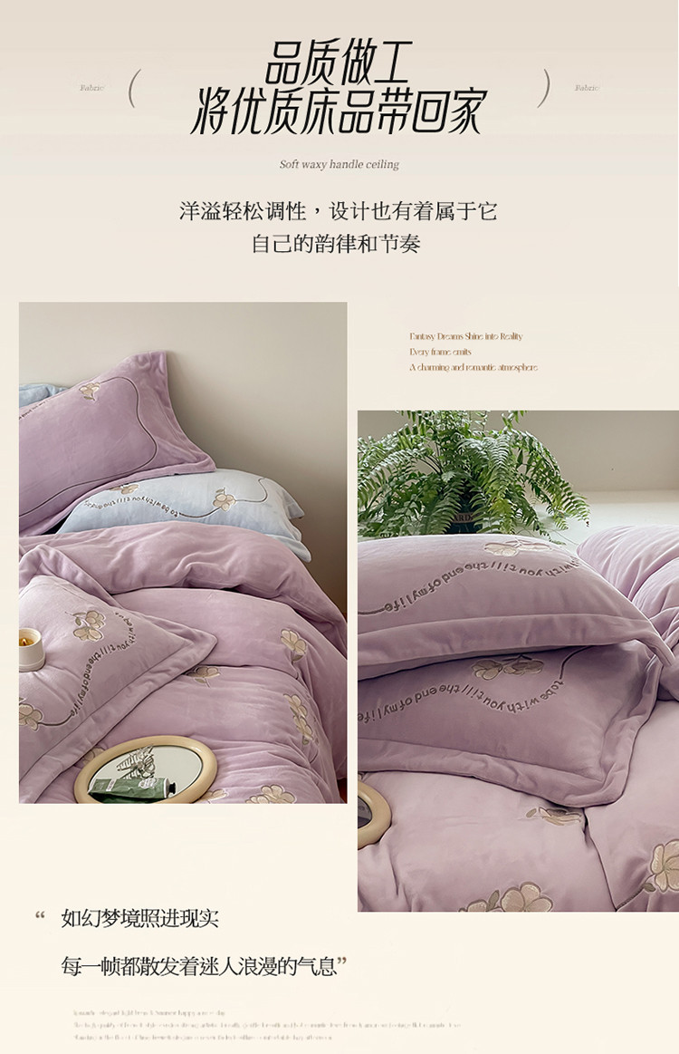商品名称:名品优仓 2023新款高克重230克牛奶绒绣花款四件套-小时光 小时光-丁香紫