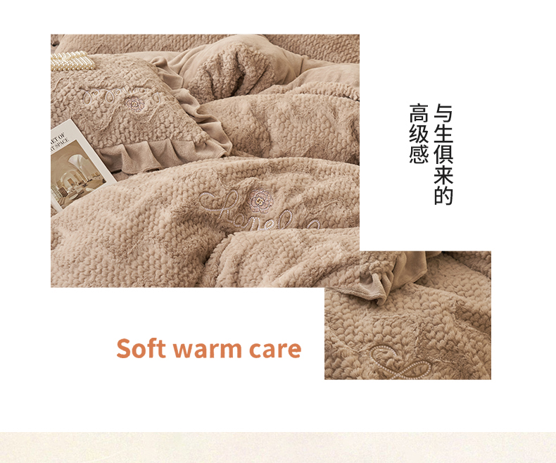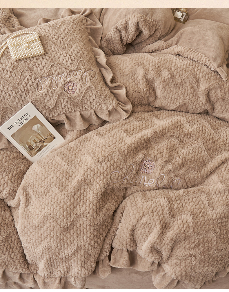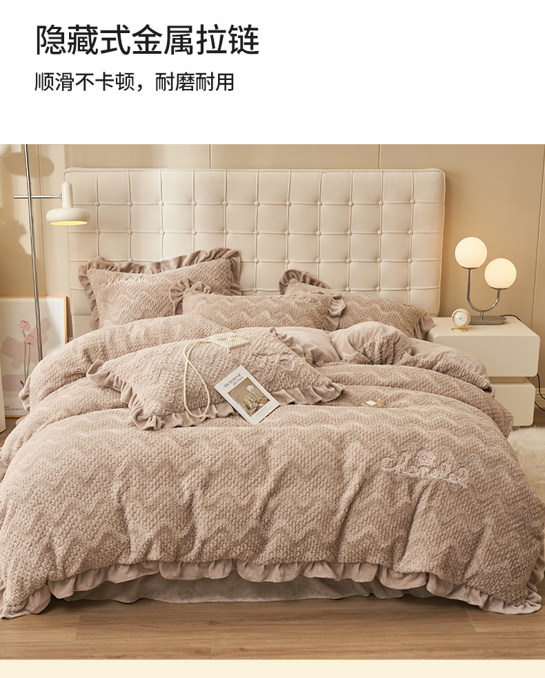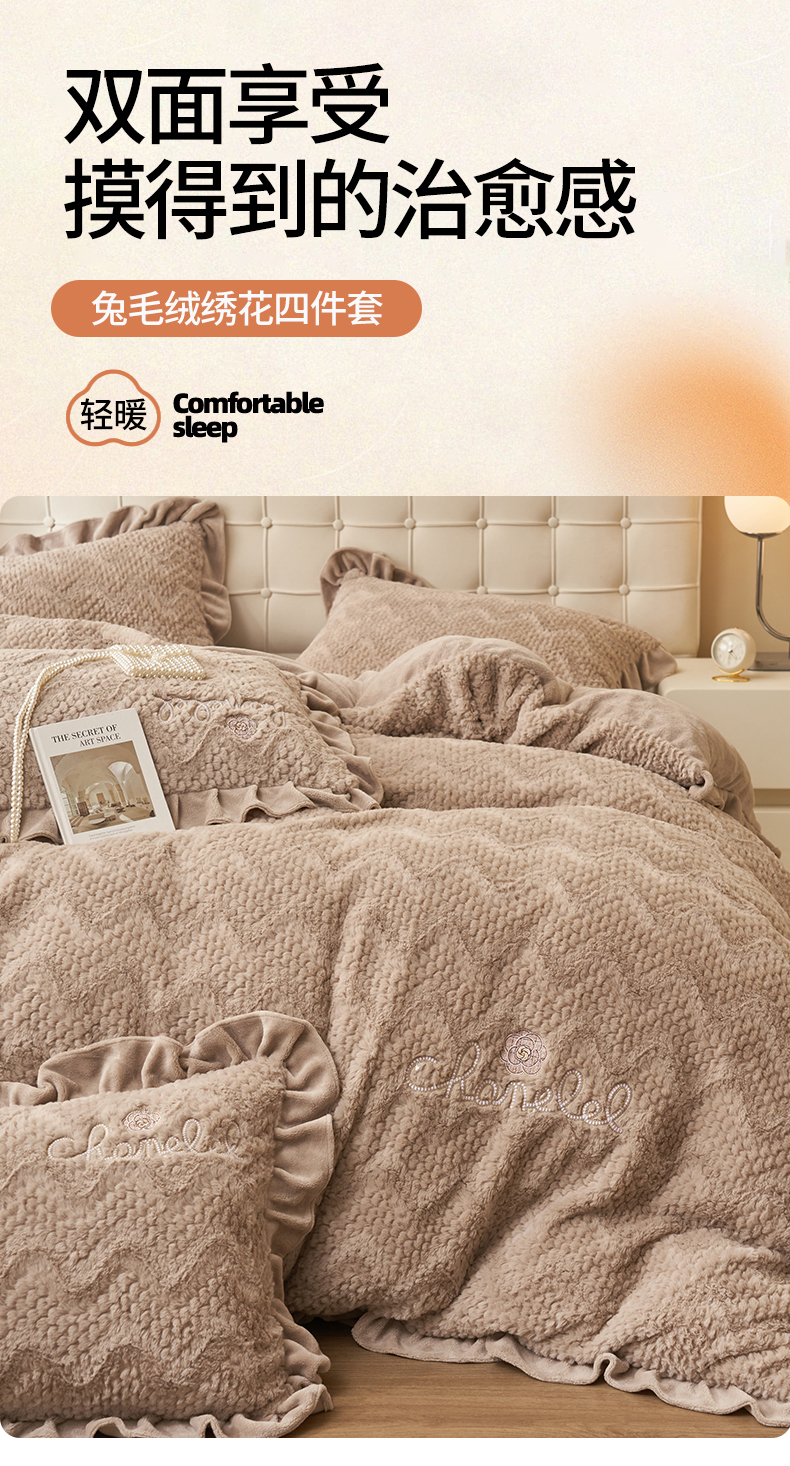 恒爱家纺 2023新款兔毛绒绣花四件套 波浪款-浅棕