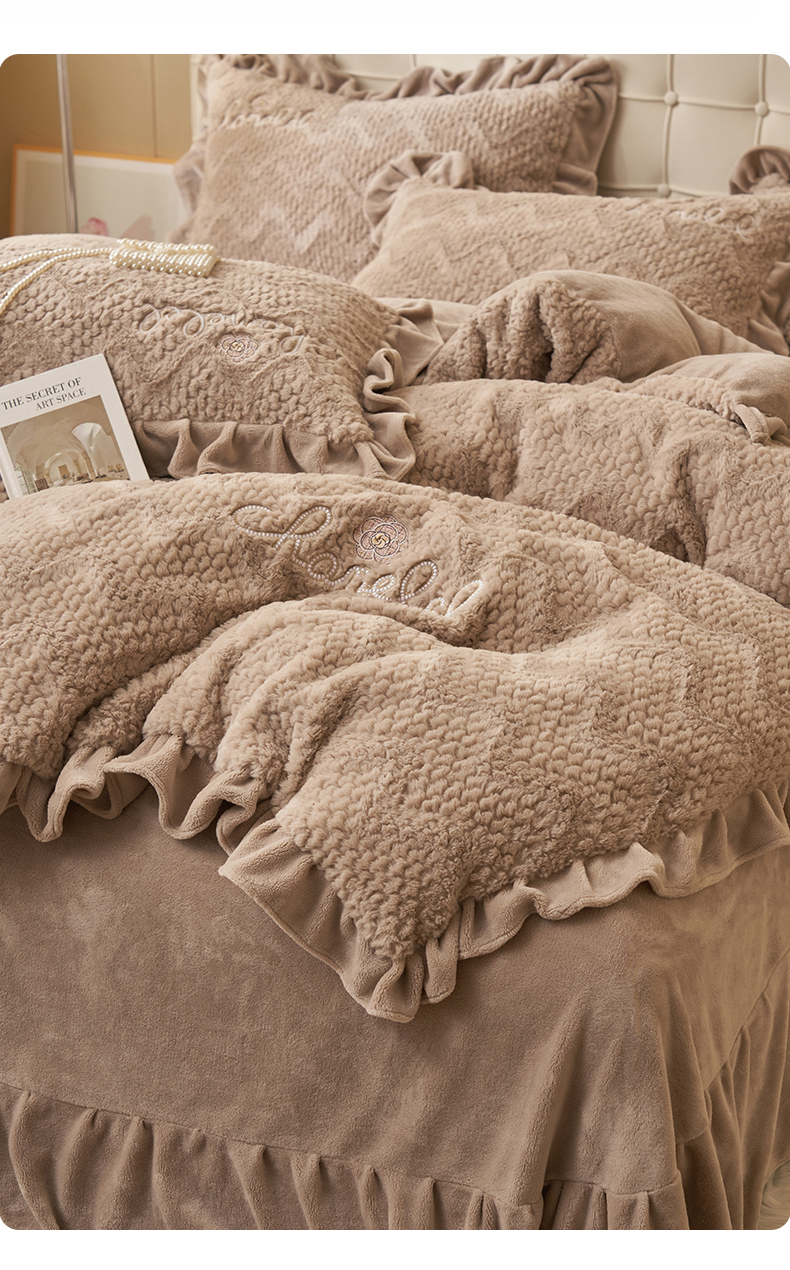 (总)恒爱 2022秋冬水晶绒翩翩花舞夹棉床裙四件套,大红色,豆沙红,橄榄绿,公主粉,桔色,咖啡色,孔雀绿,拉菲红,罗兰紫,玫红色,美人玉,米白色,米驼色,抹茶绿,浅灰色,紫色
