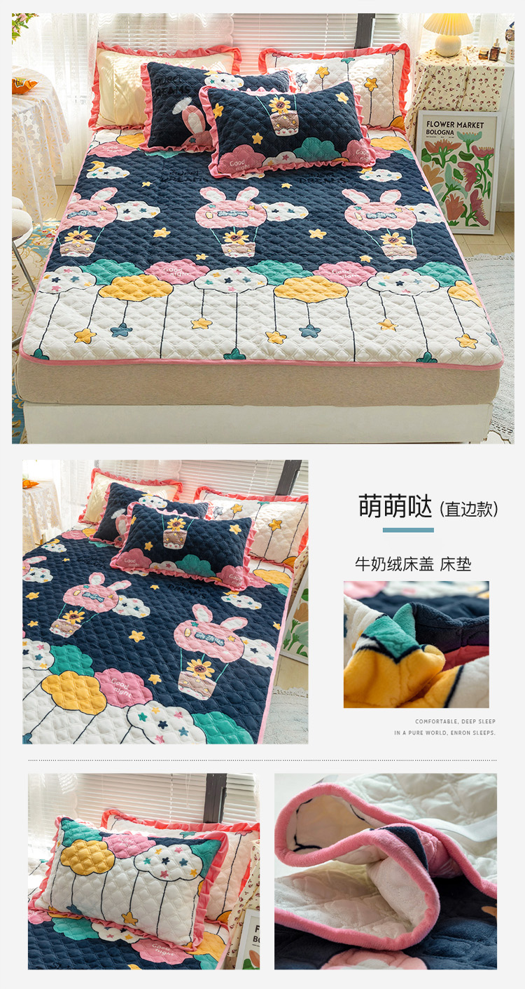 • 91家纺网 家纺一手货源 找家纺 羽爱家纺 2024新款牛奶绒直边款床盖床垫 萌萌哒