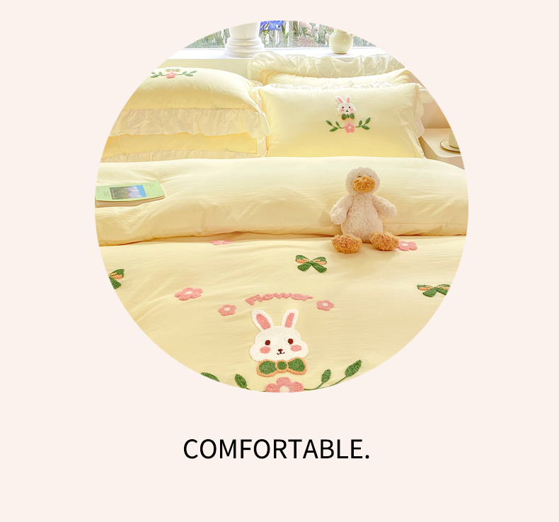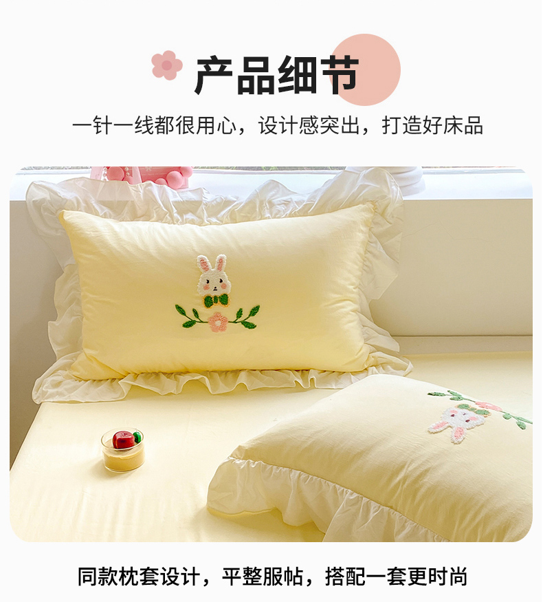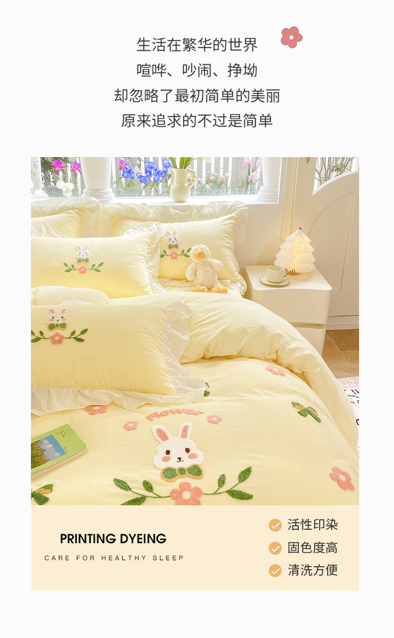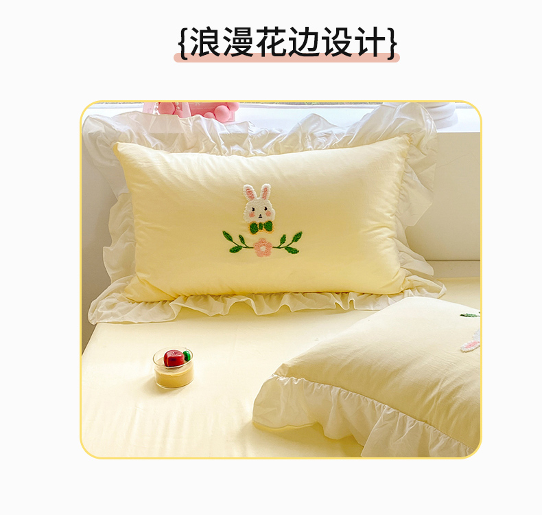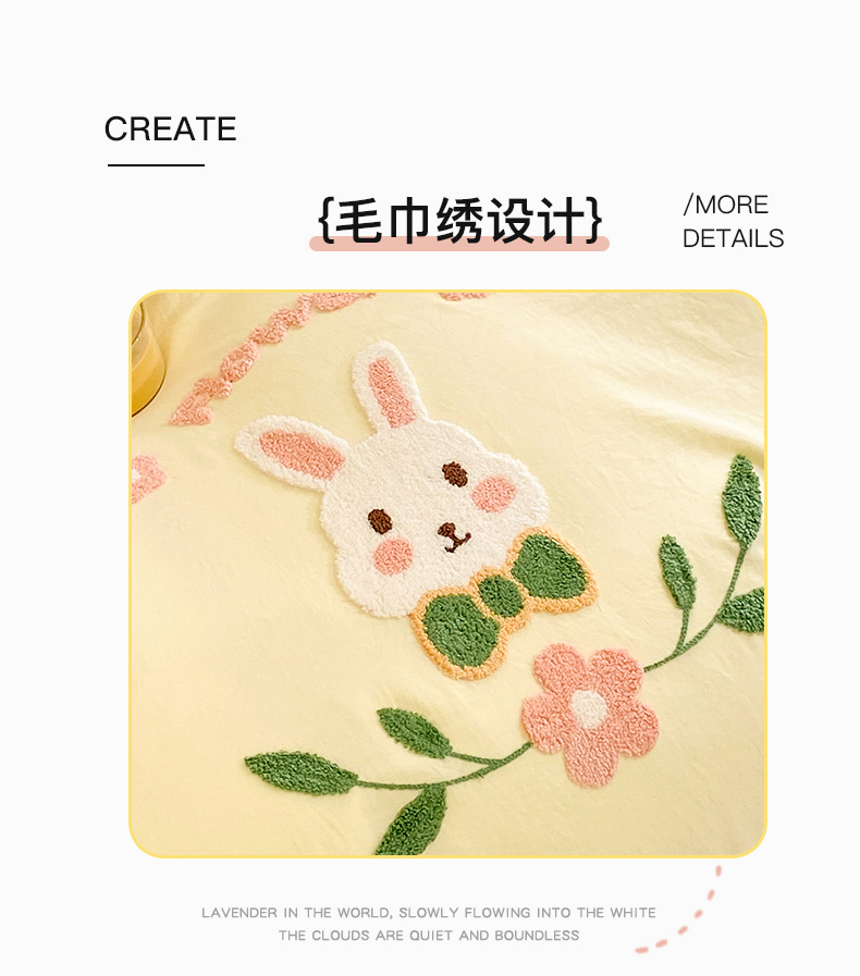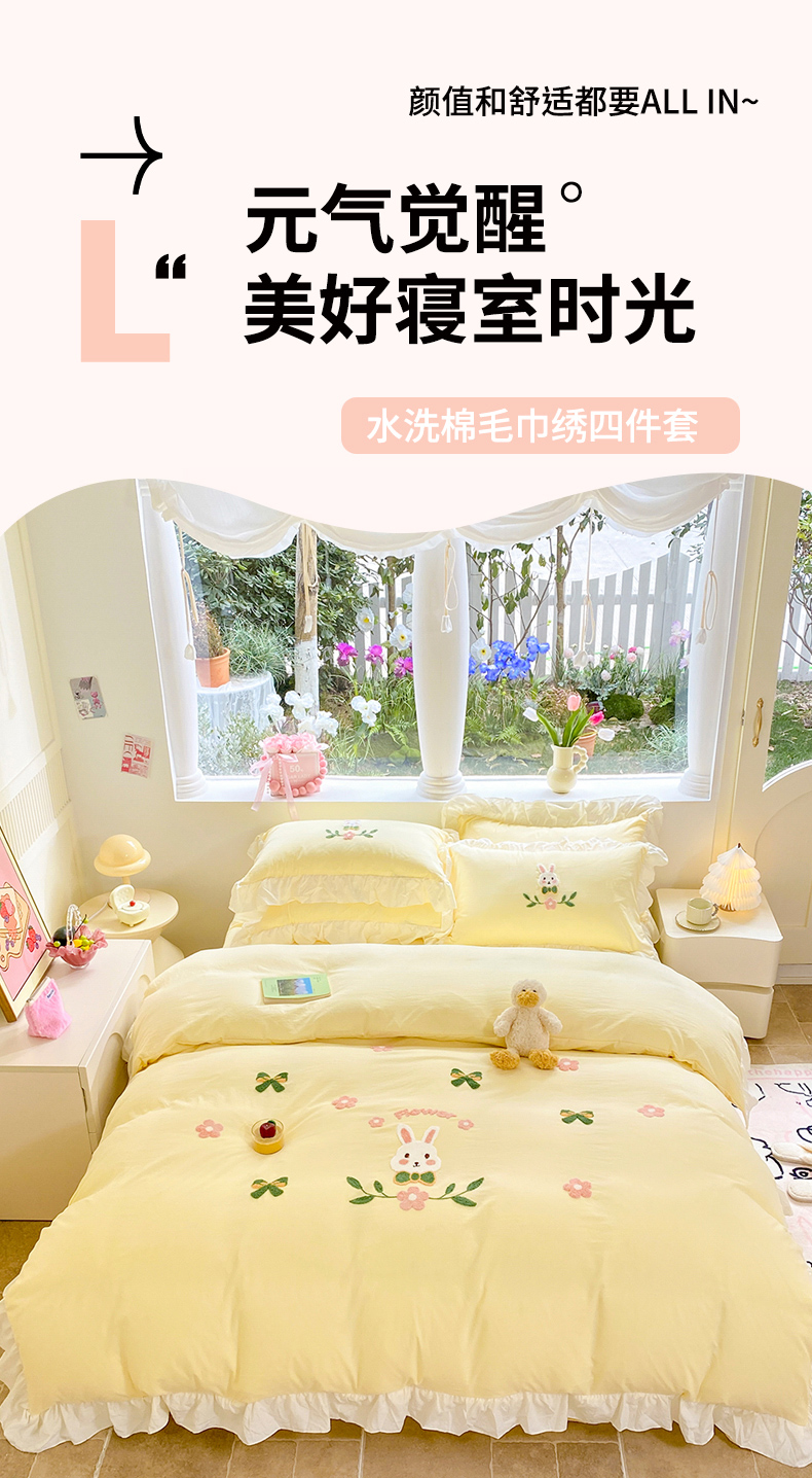 当前位置: 91家纺网 > 商品网购 > 床品套件 > 四件套 > 水洗棉四件套 > 你好美丽 2025新款水洗棉萌兔毛巾绣花边四件套 萌兔黄