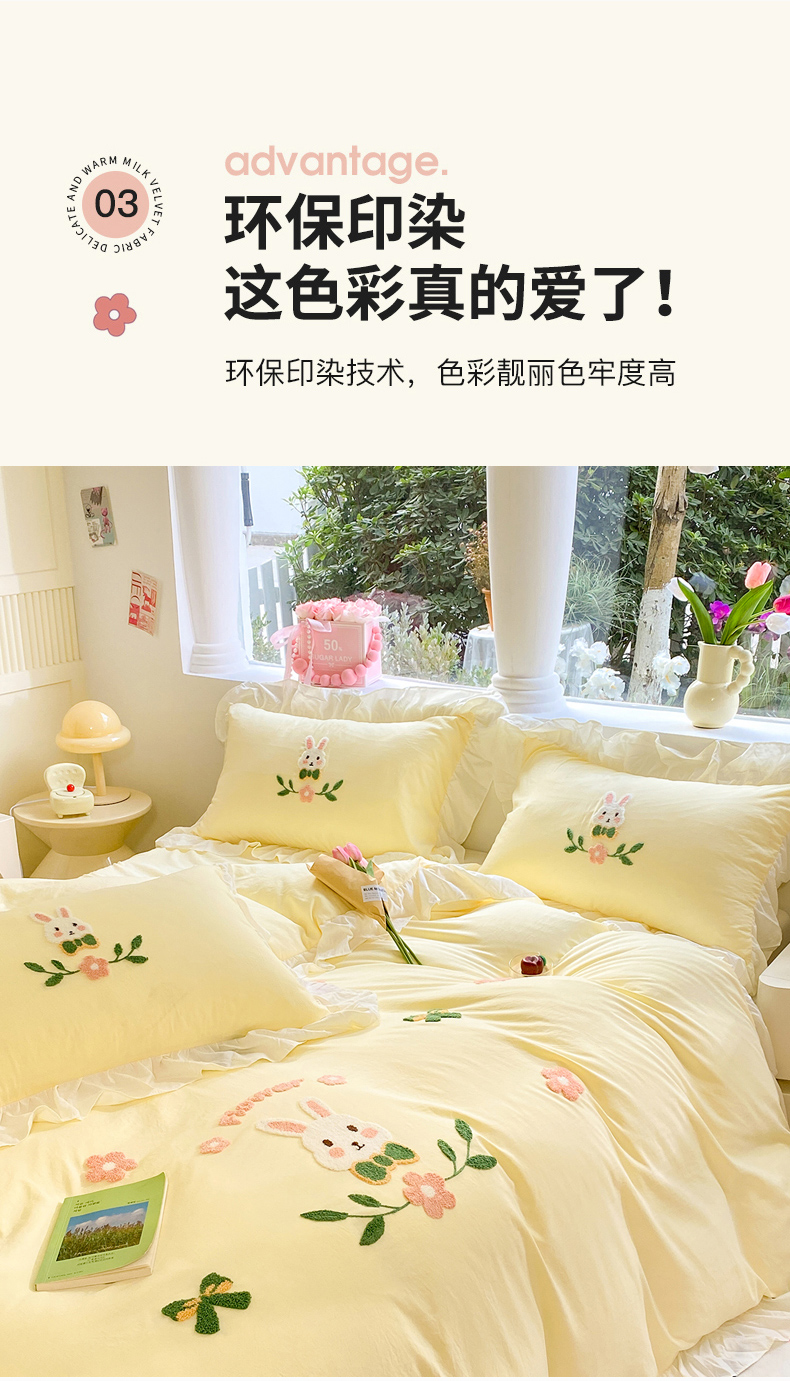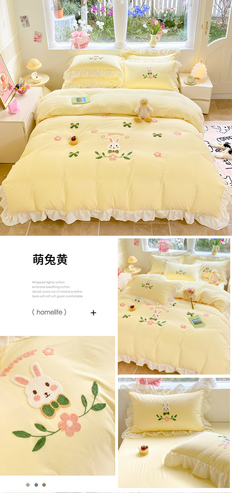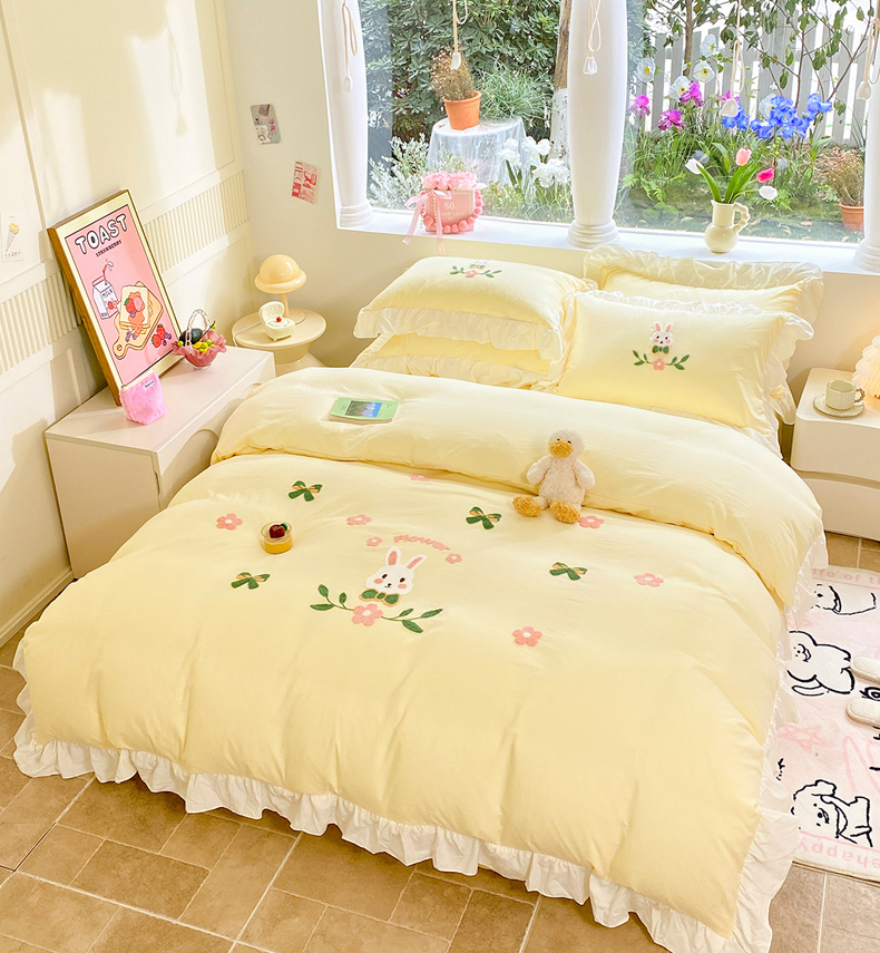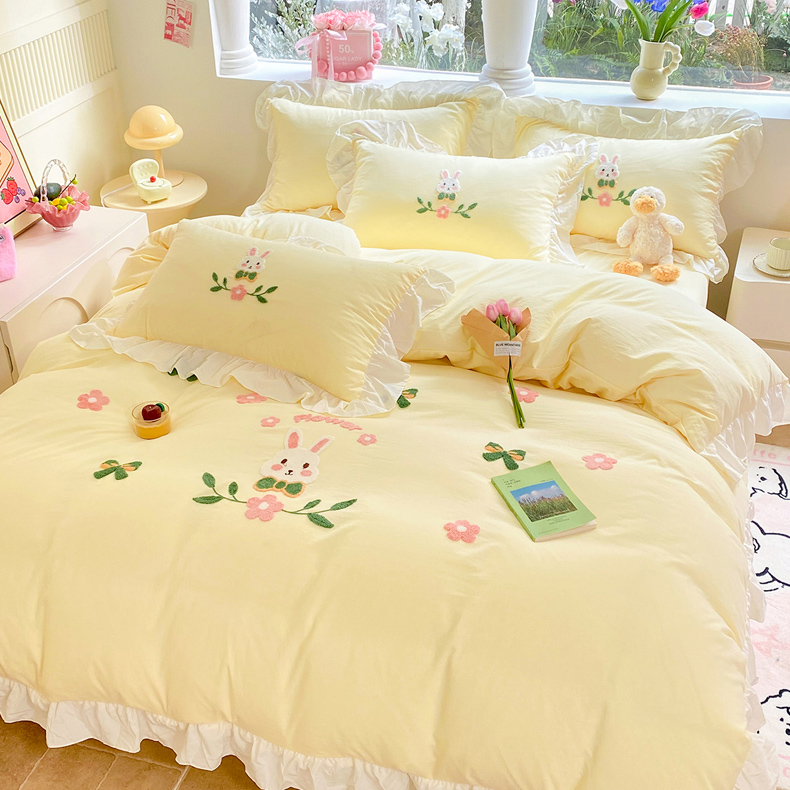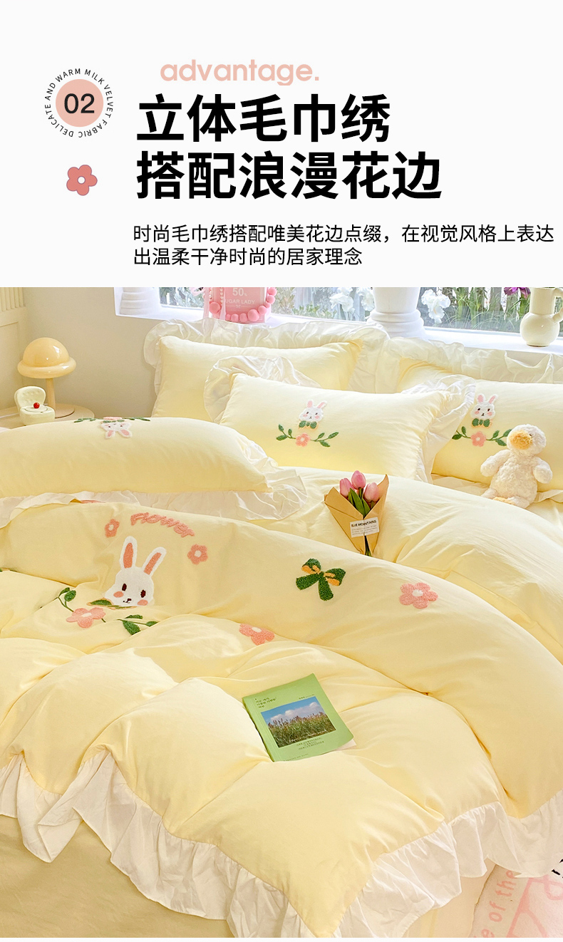 当前位置: 91家纺网 > 商品网购 > 床品套件 > 四件套 > 水洗棉四件套 > 你好美丽 2025新款水洗棉萌兔毛巾绣花边四件套 萌兔黄