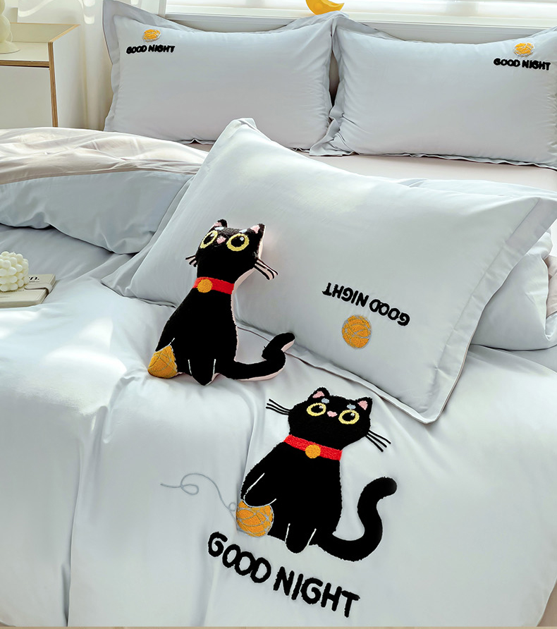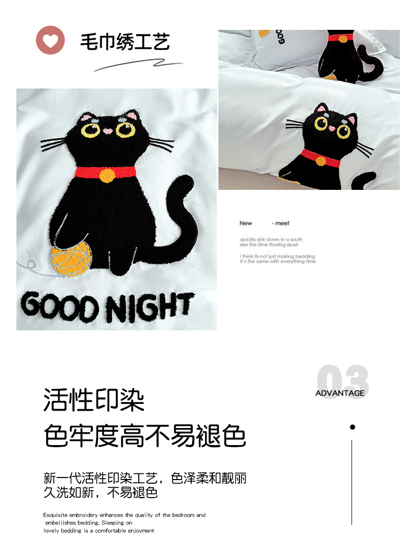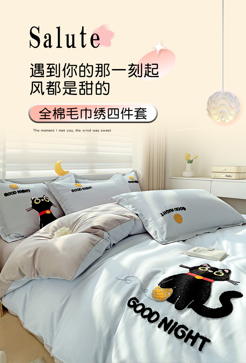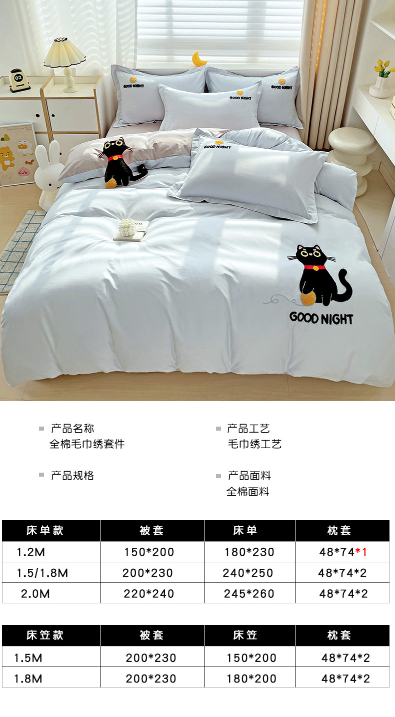 商品名称:娜娜 2024新款全棉亲肤舒适毛巾绣卡通系列四件套 可爱猫咪-天空蓝