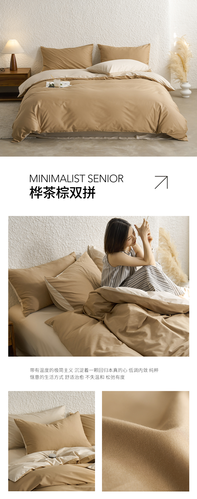 商品名称:千朵森 2024新款全棉贡缎双拼纯色四件套 暗香-桦茶棕双拼