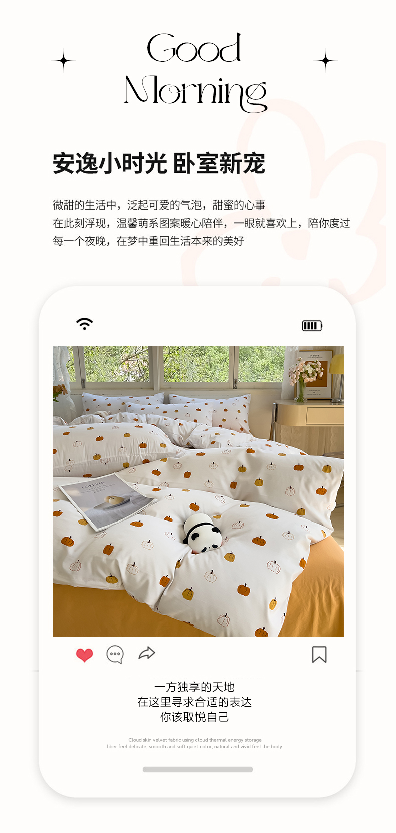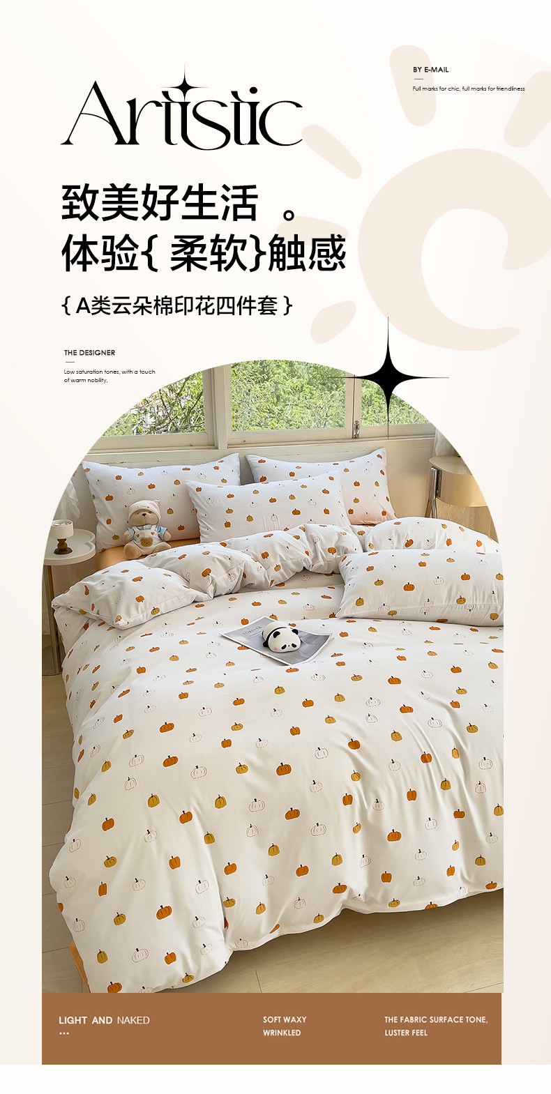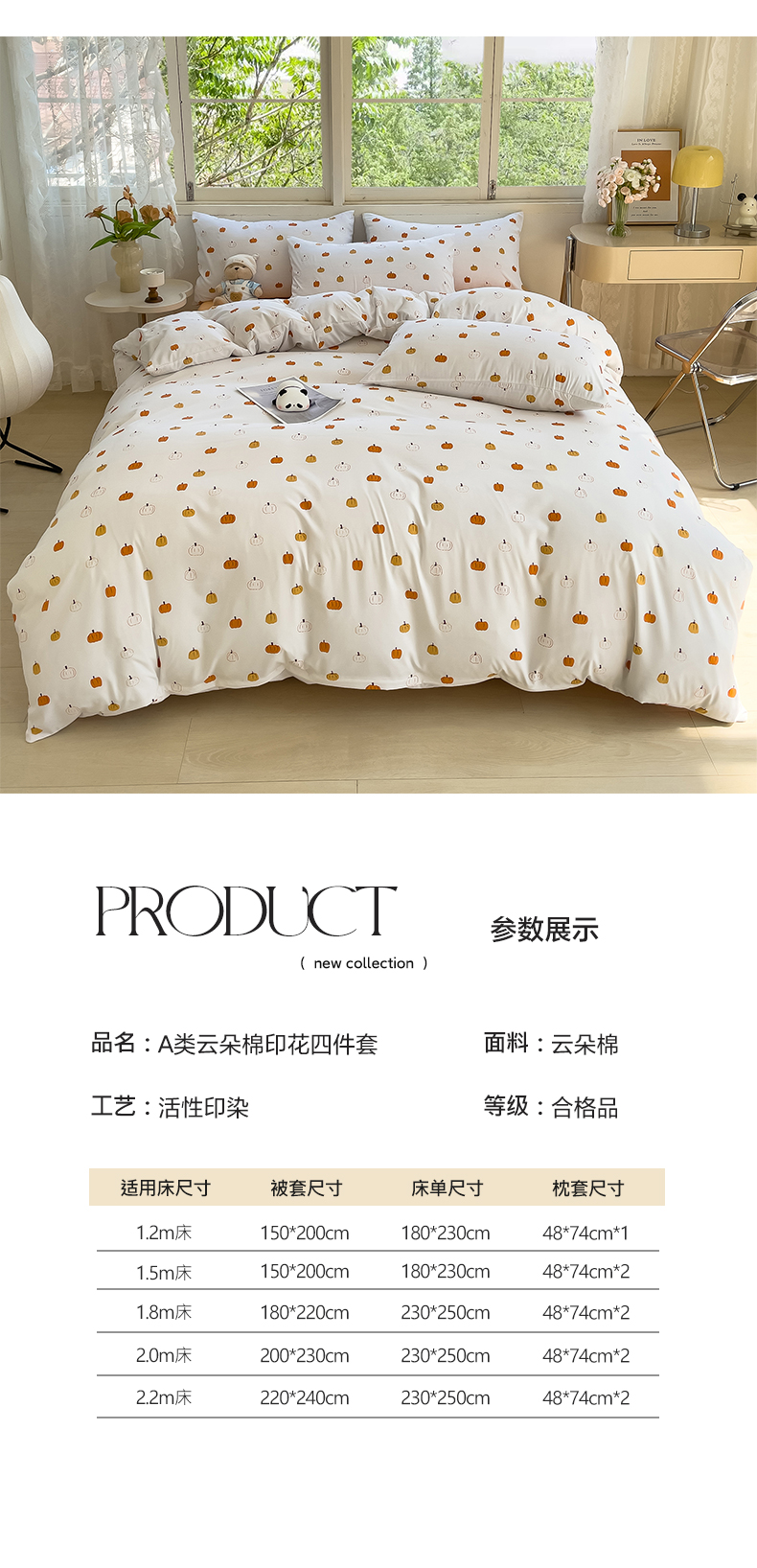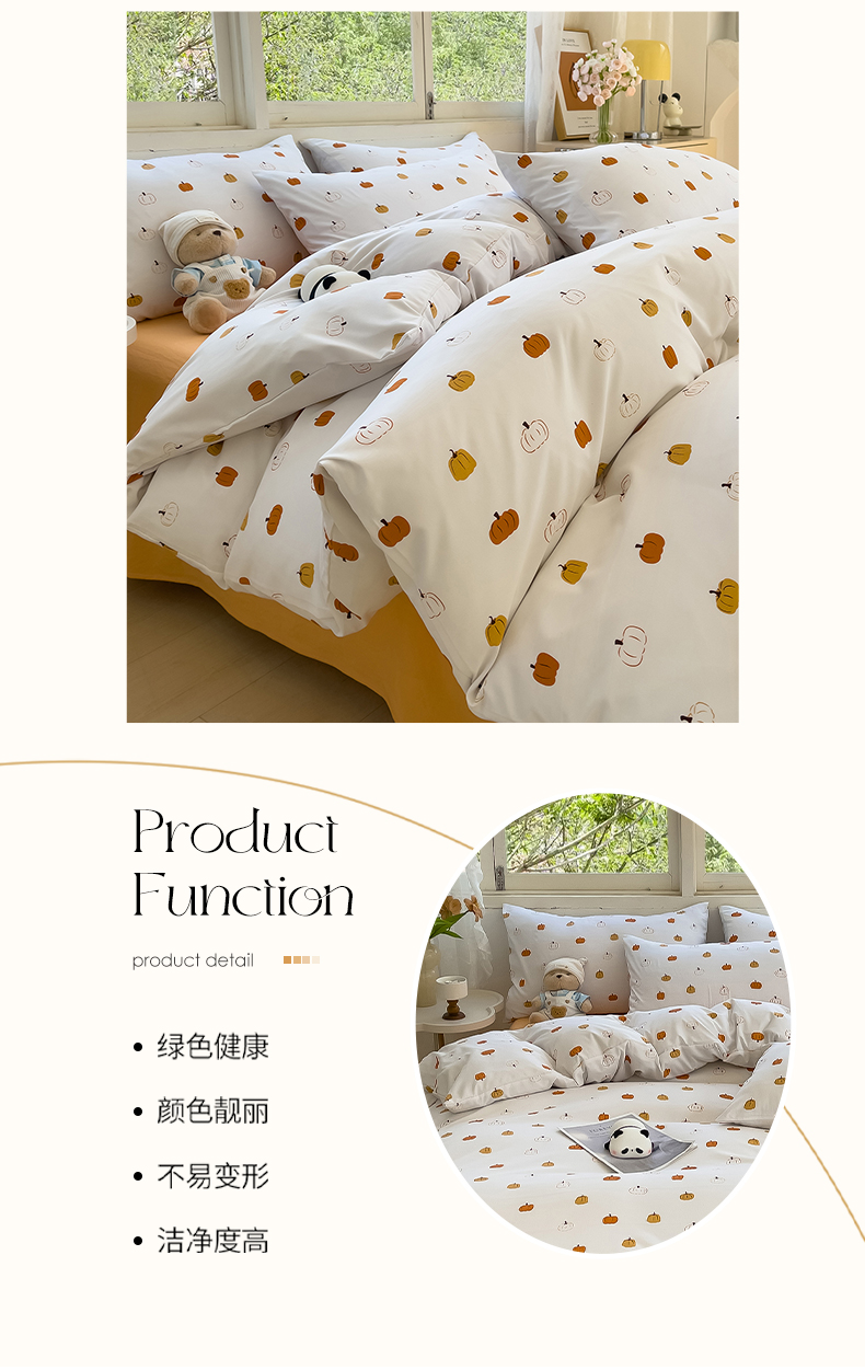 当前位置: 91家纺网 > 商品网购 > 床品套件 > 四件套 > 其它四件套 > 乐萱家纺 2024新款水洗云朵棉小清新四件套超柔印花单被套 南瓜乐园