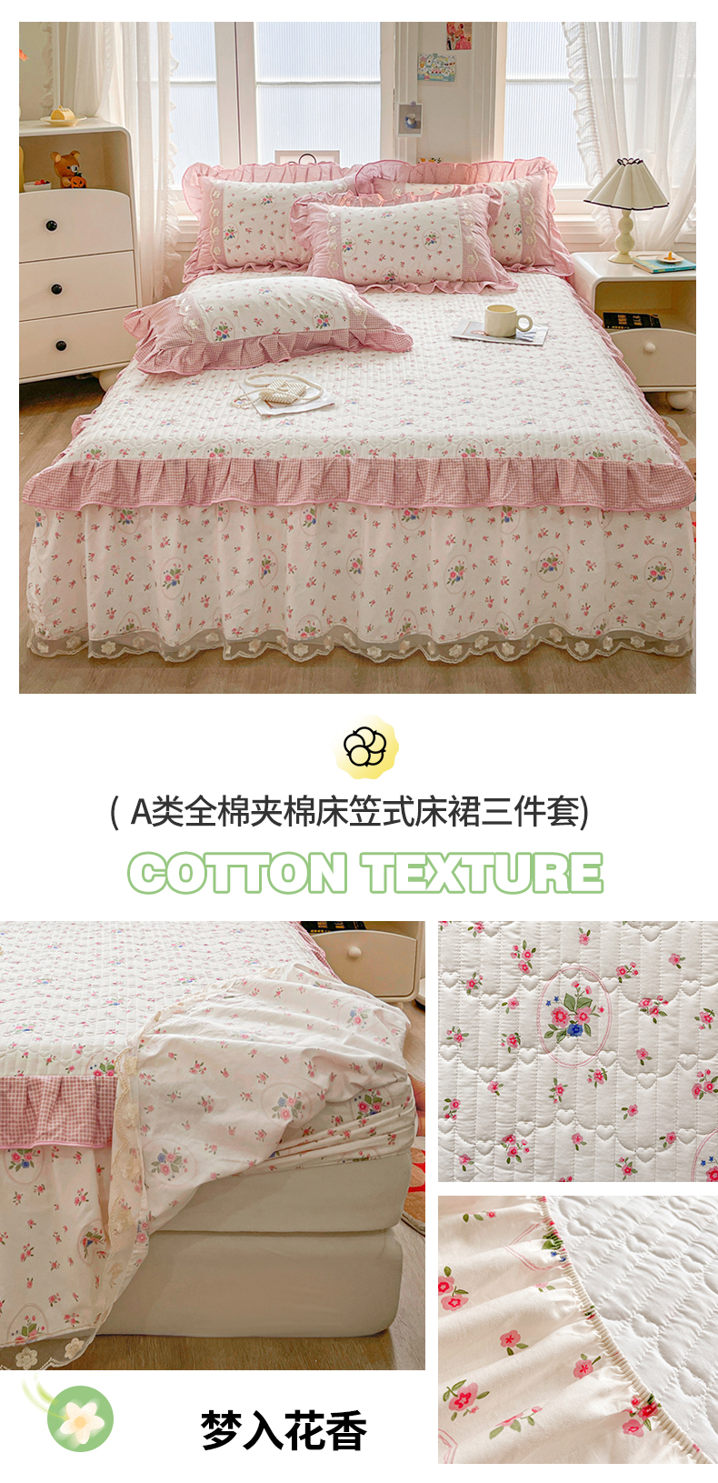 宜凡家纺 2024新款复古双拼全棉印花夹棉床笠式床裙三件套 梦入花香