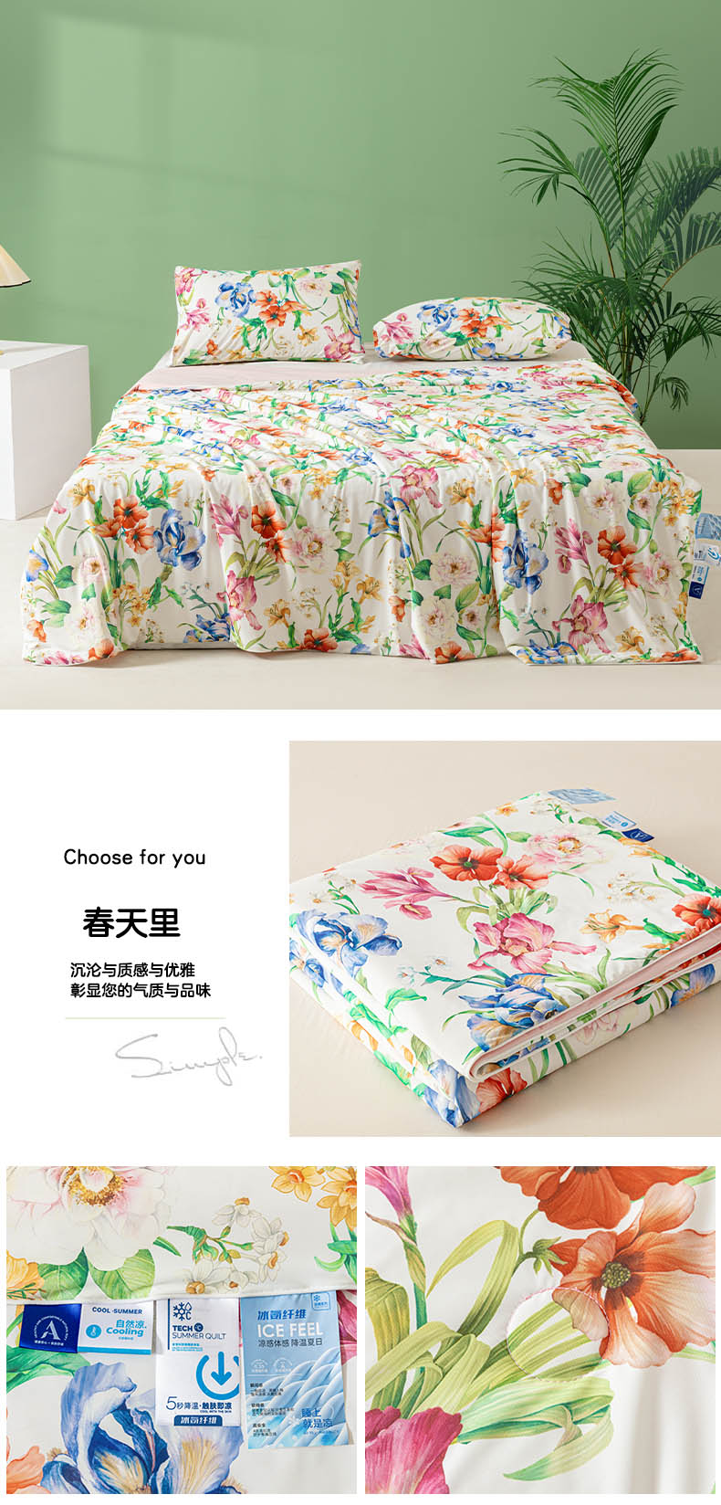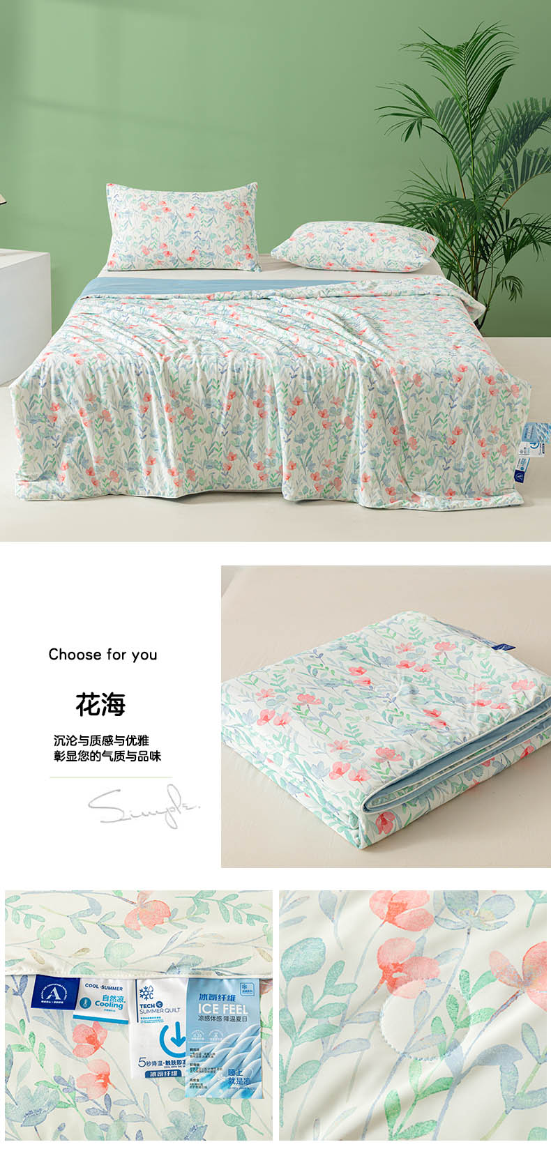 (总)佳居缘 2025新款A类冰氨双面数码印花凉感夏被,繁花-粉,繁花-绿,锦绣-白,锦绣-绿,林鹿-蓝