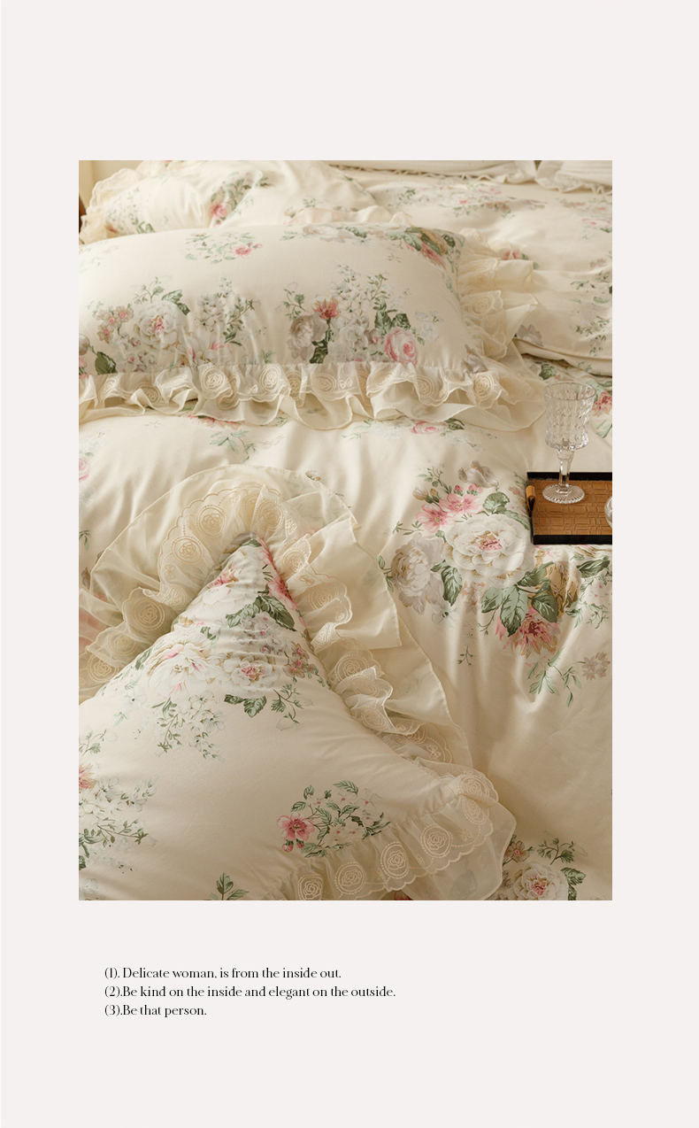 菊上家纺 2024新款40s全棉复古法式雪纺蕾丝花边印花床裙款四件套 美琳