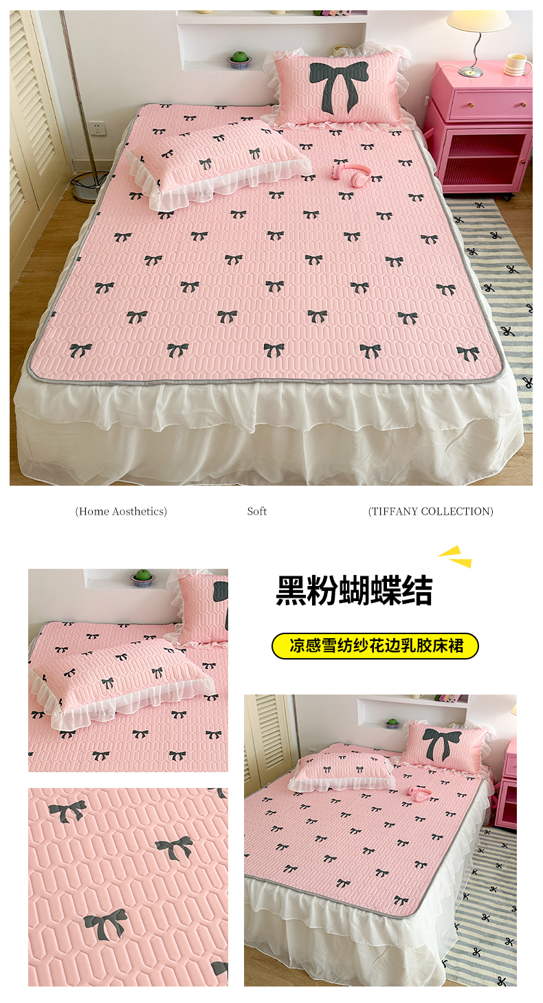 昔可 新款床裙款乳胶凉席双层雪纺纱乳胶凉席三件套 黑粉蝴蝶结