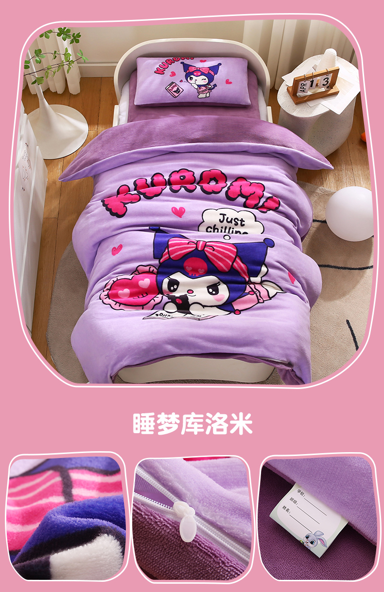 当前位置: 91家纺网 > 商品网购 > 床品套件 > 四件套 > 牛奶绒四件套 > 孩子王家纺 2024新款正版授权KT猫三丽鸥大版双面牛奶绒学生幼儿园系列三件套六件套多件套 睡梦库洛米