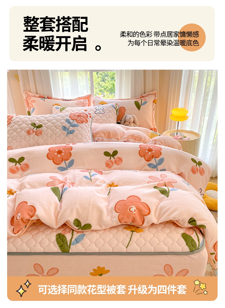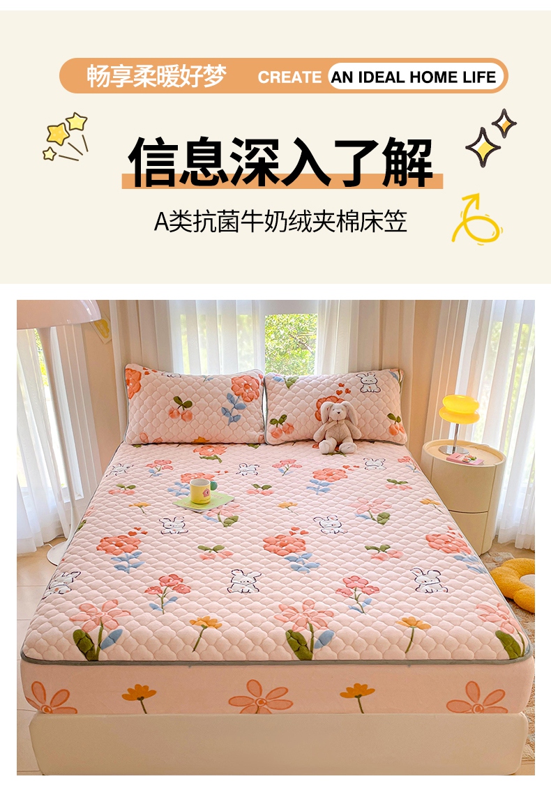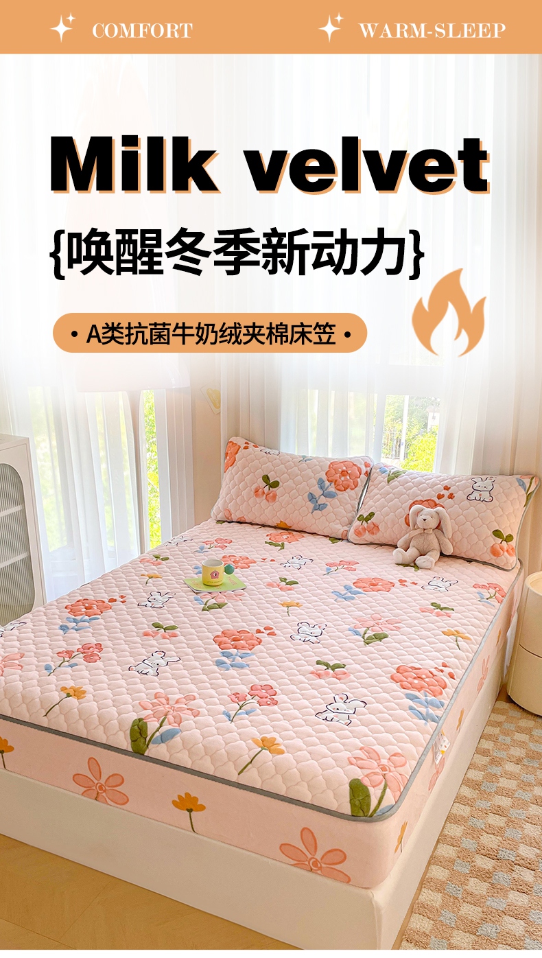 • 91家纺网 家纺一手货源 找家纺 康纳利 2024新款A类抗菌加厚牛奶绒印花夹棉包边床笠可搭配同款四件套提供买家秀 花间小兔
