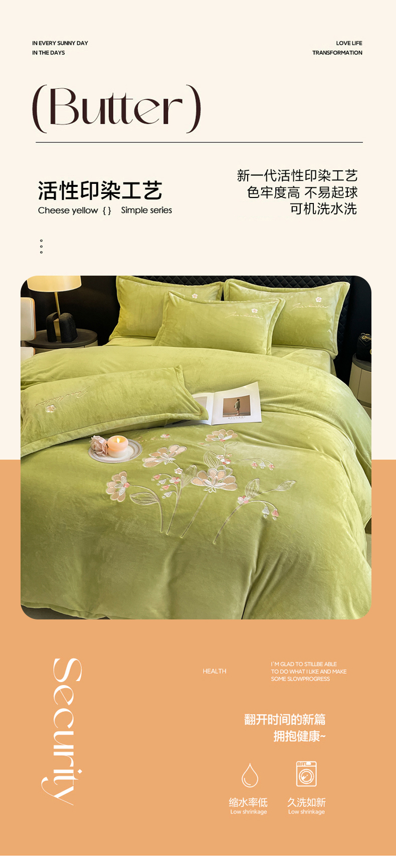 诺梵家纺 2025新款牛奶绒绣花绒四件套 伊莉莎-抹茶绿