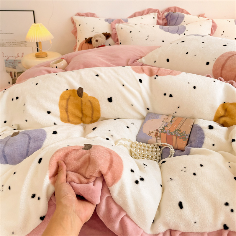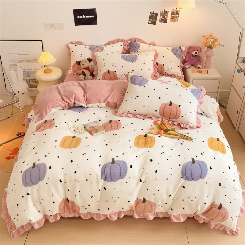 商品名称:麦朵 2024高克重牛奶绒花边款四件套雪花绒金貂绒套件宝宝绒雕花绒被套 多彩南瓜